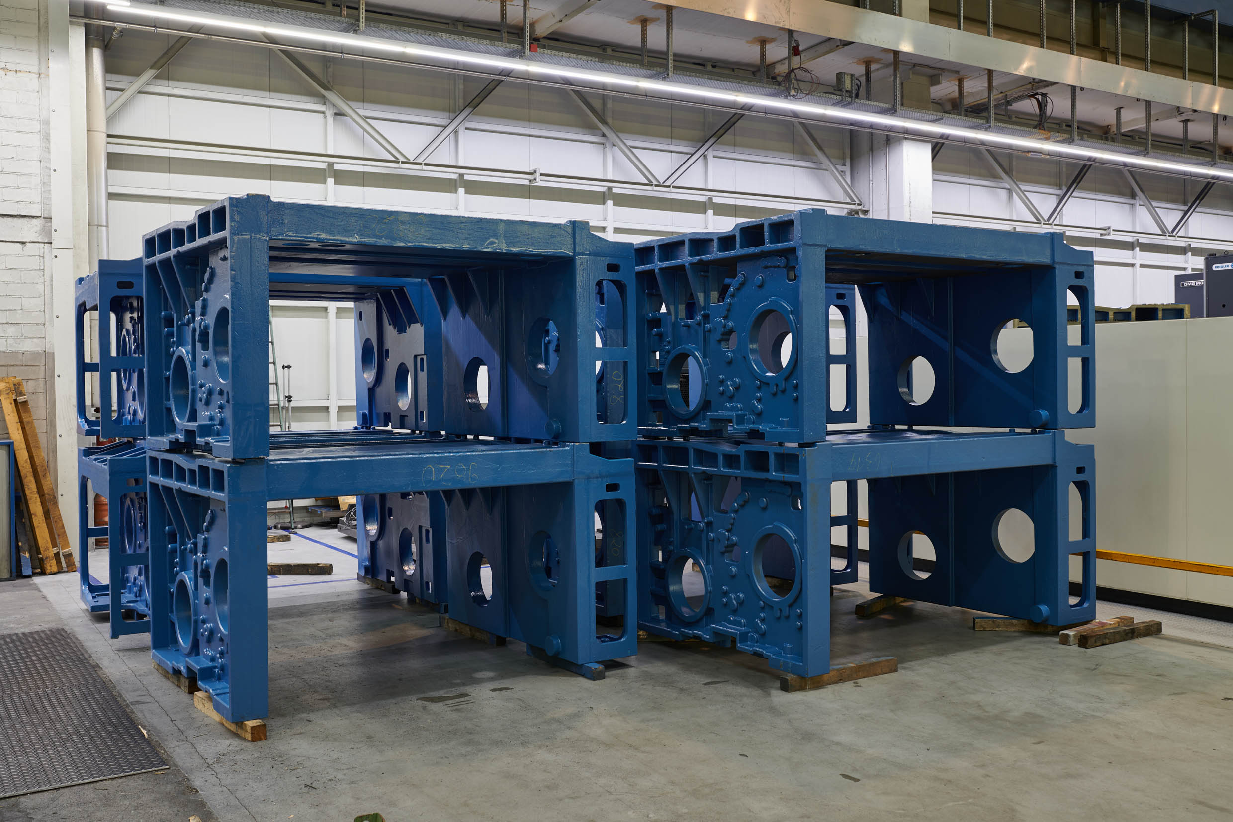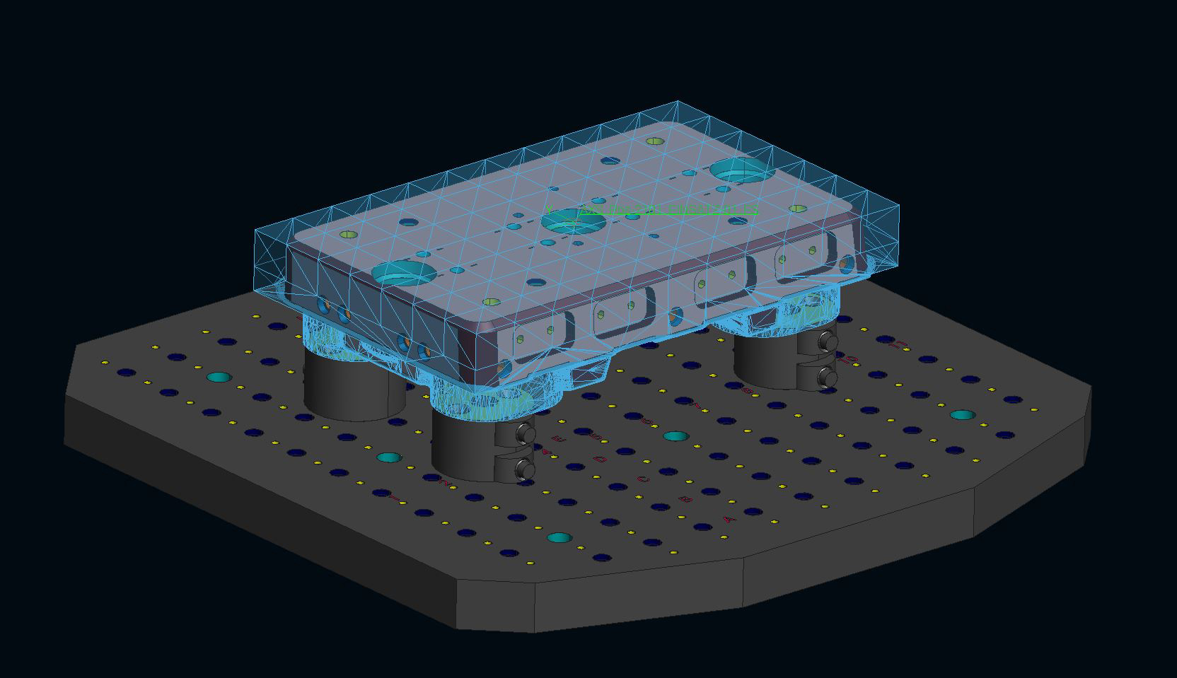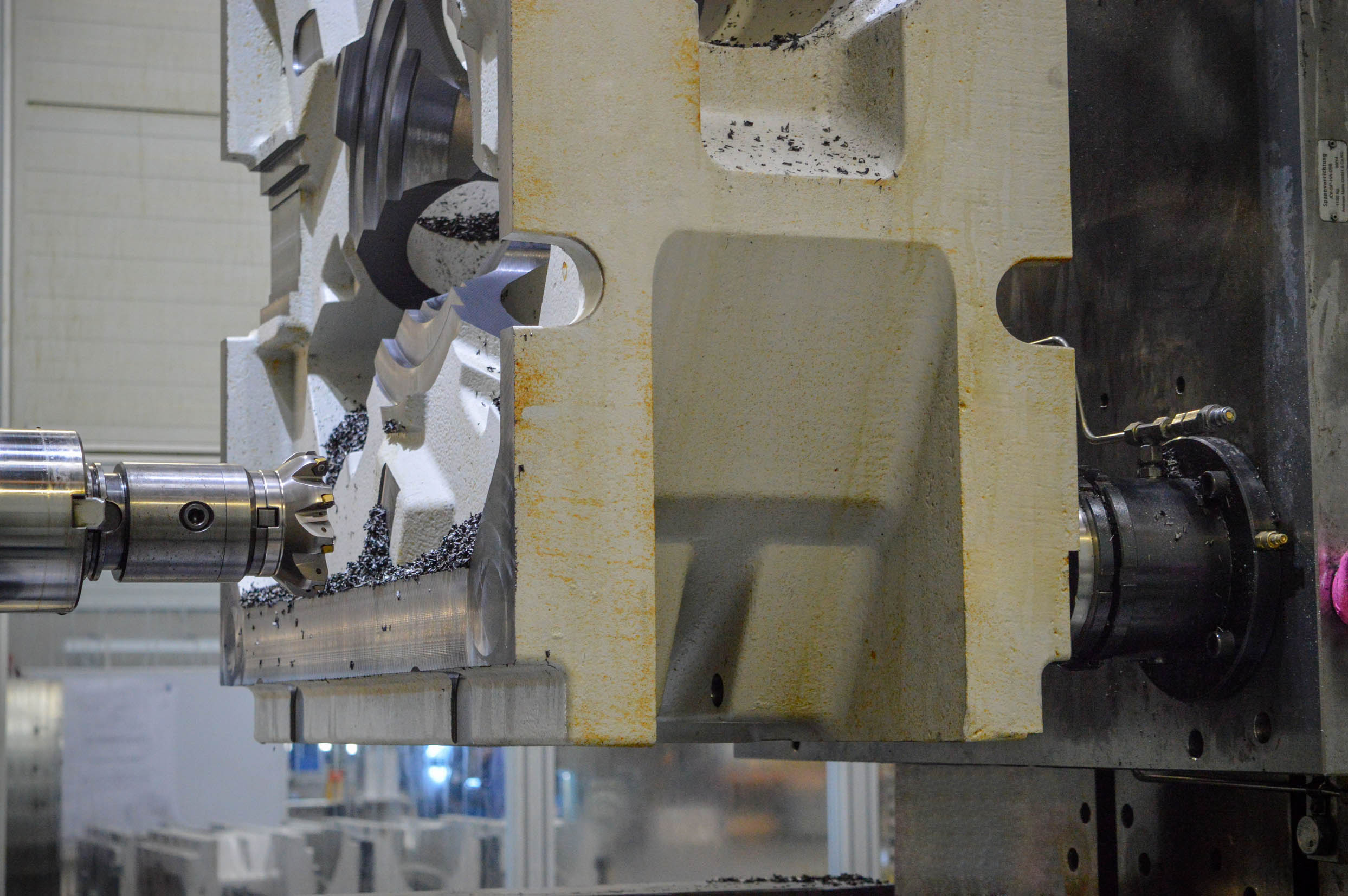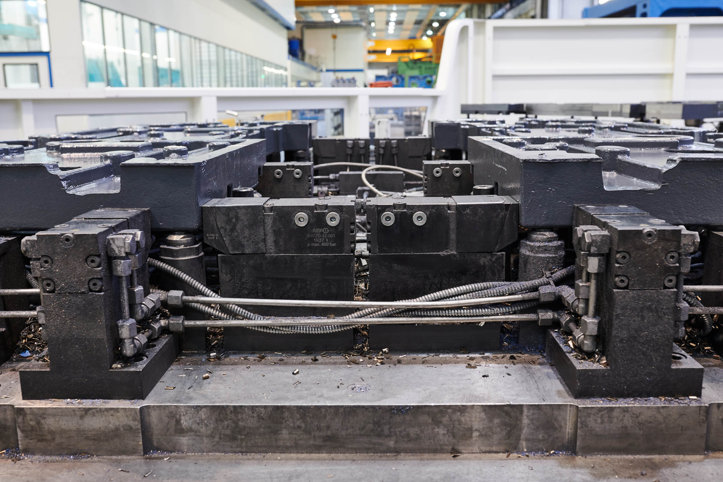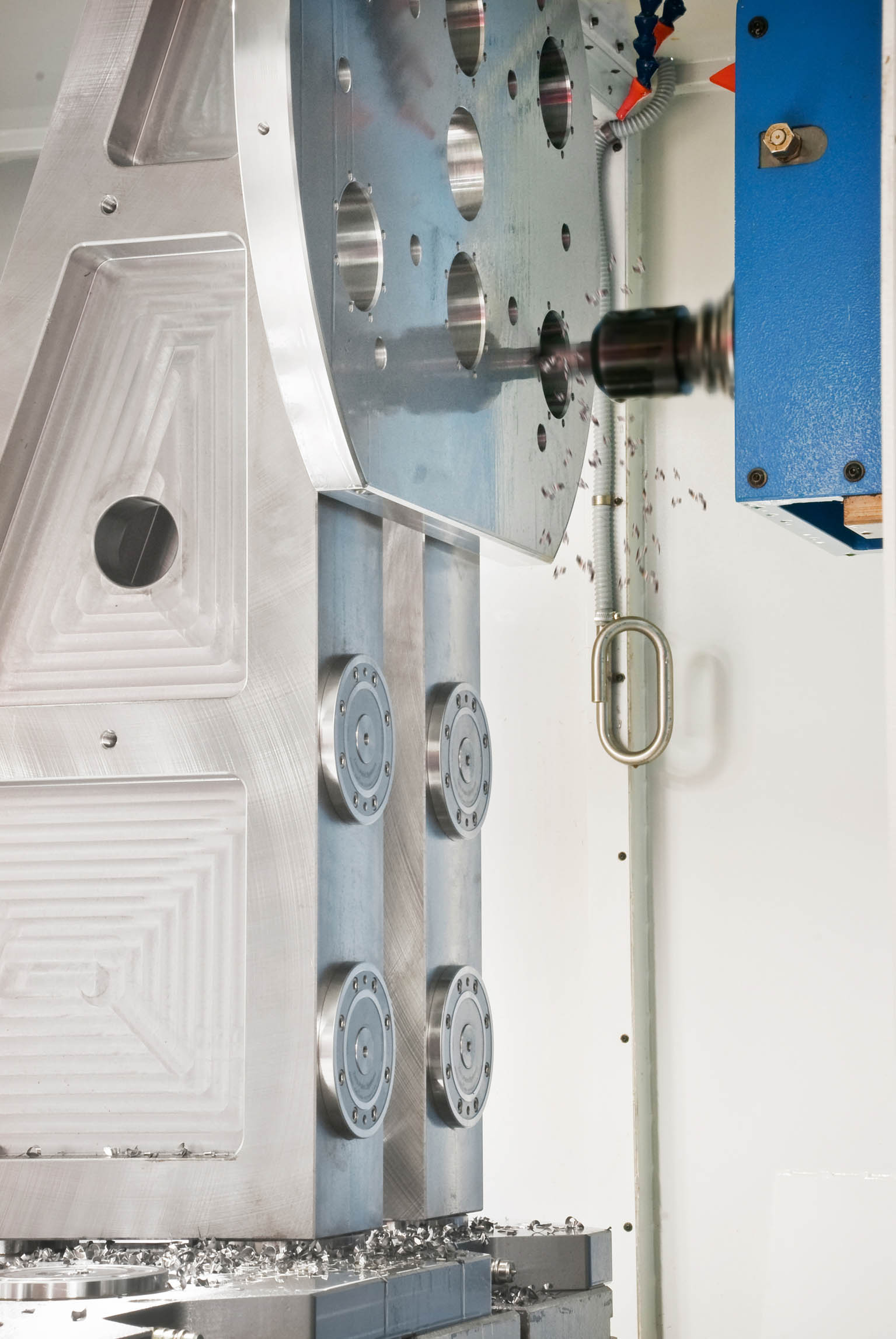 Flexible Aufspannvorrichtungen als Basis für vier Varianten sehr großer Maschinenteile, die paarweise aufgespannt und bearbeitet werden. Für die Fixierung in erster und zweiter Aufspannung sorgt eine Kombination aus hydraulischen Niederzugspannern, und anschwimmenden Unterstützungselementen.