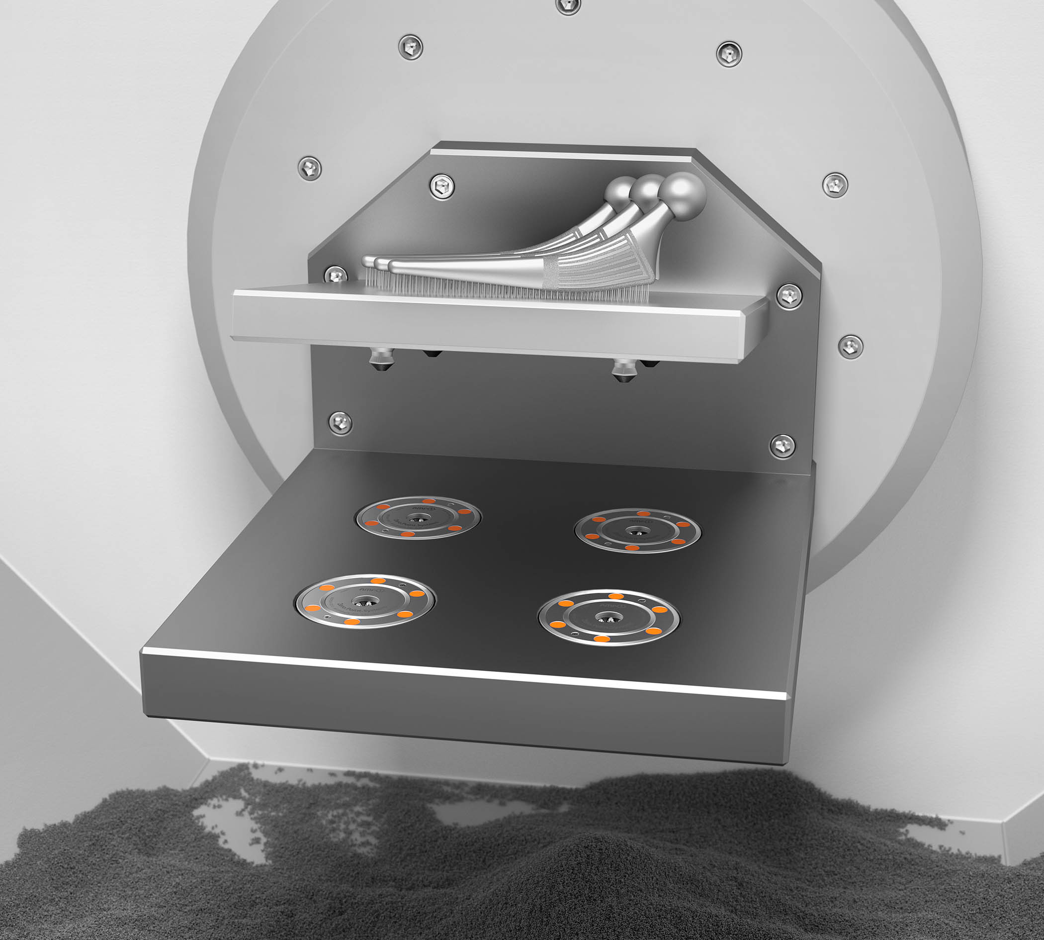 Der Deckel wird senkrecht in die bogenförmige AMF-Vorrichtung eingebracht, die ihn an den schmalen Seiten komplett umschließt.