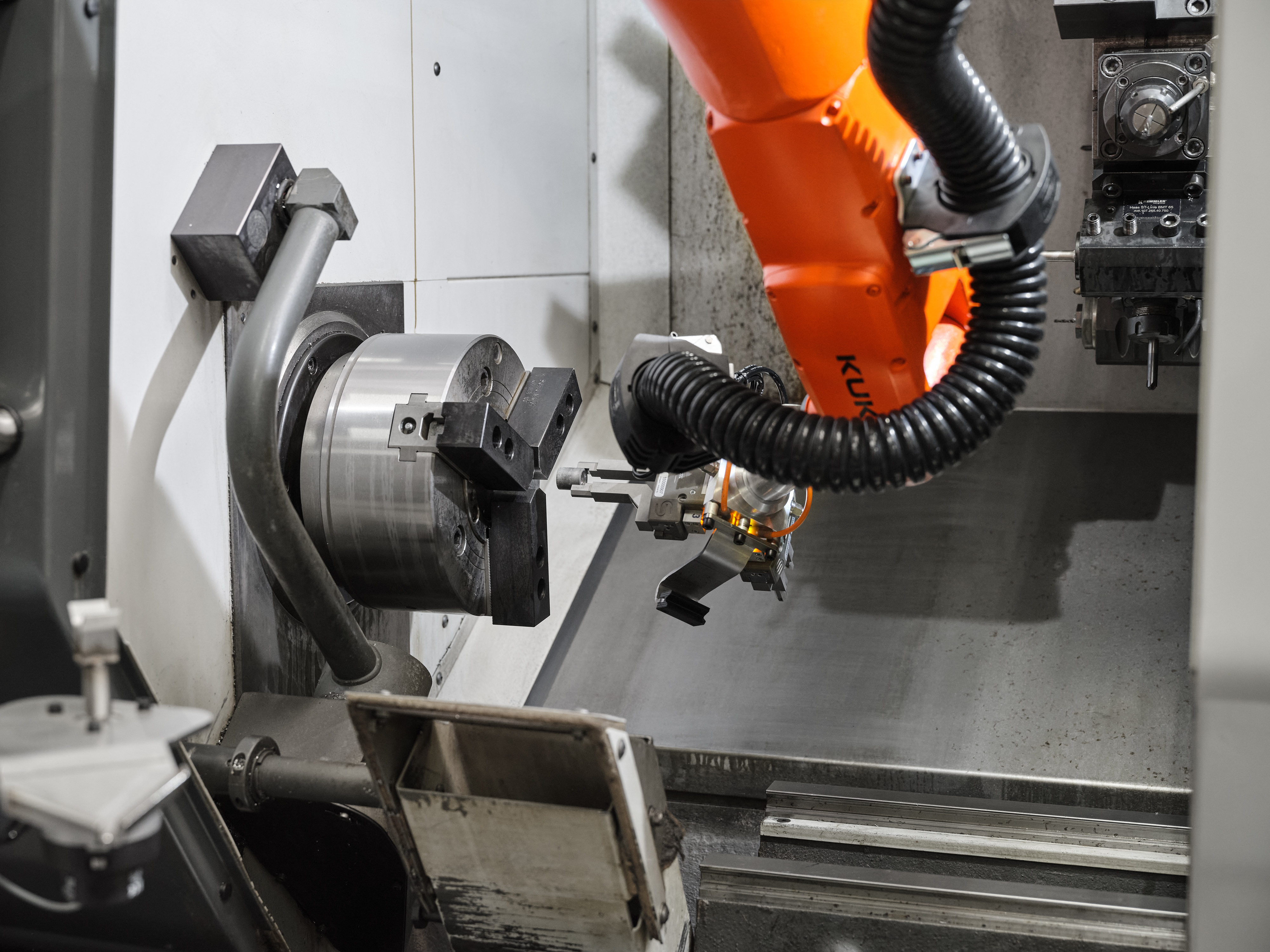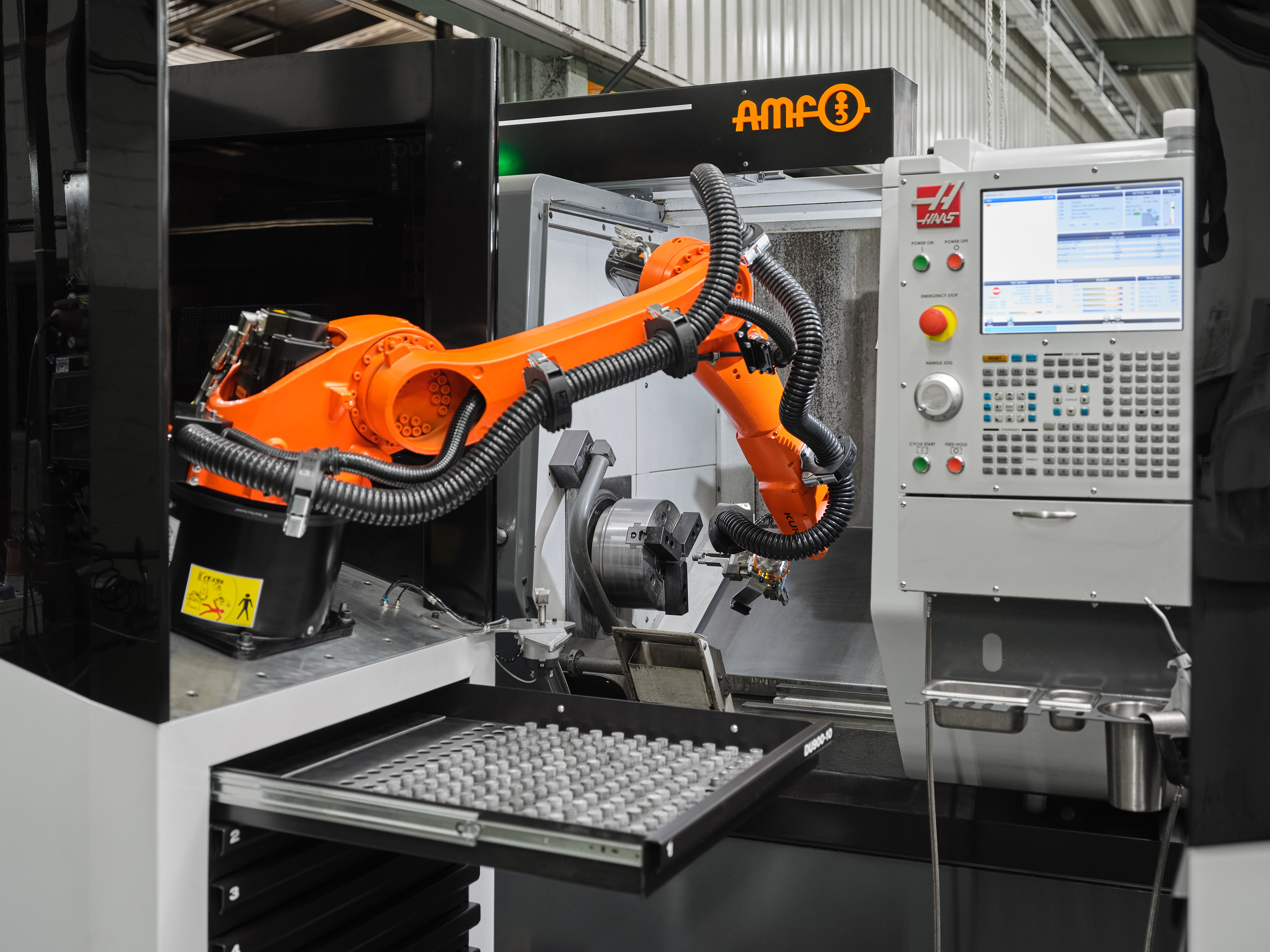 Das neue, flexible Roboter-Beladesystem Smart Automation von AMF automatisiert bei Güthle das Werkstückhandling von Kugelpfannen an der Haas-Drehmaschine.