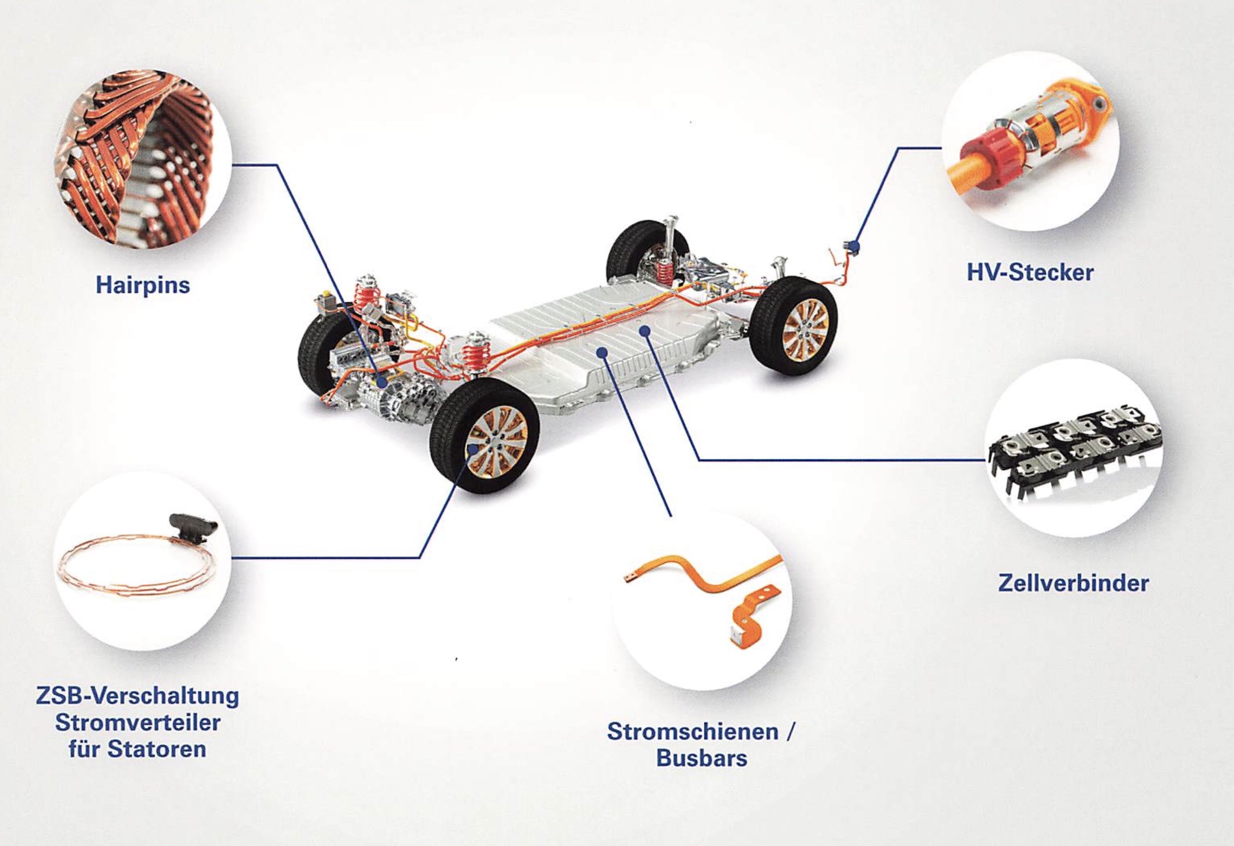 Die Busbar für Premium-Elektrofahrzeuge sind das Highlight der Kleinserien-Produkte, die auf hochproduktiven Linearmaschinen gefertigt werden. Darüber hinaus entstehen auch Hairpins, HV-Stecker, Zellverbinder oder die ZSB-Verschaltung der Stromverteiler für Statoren.