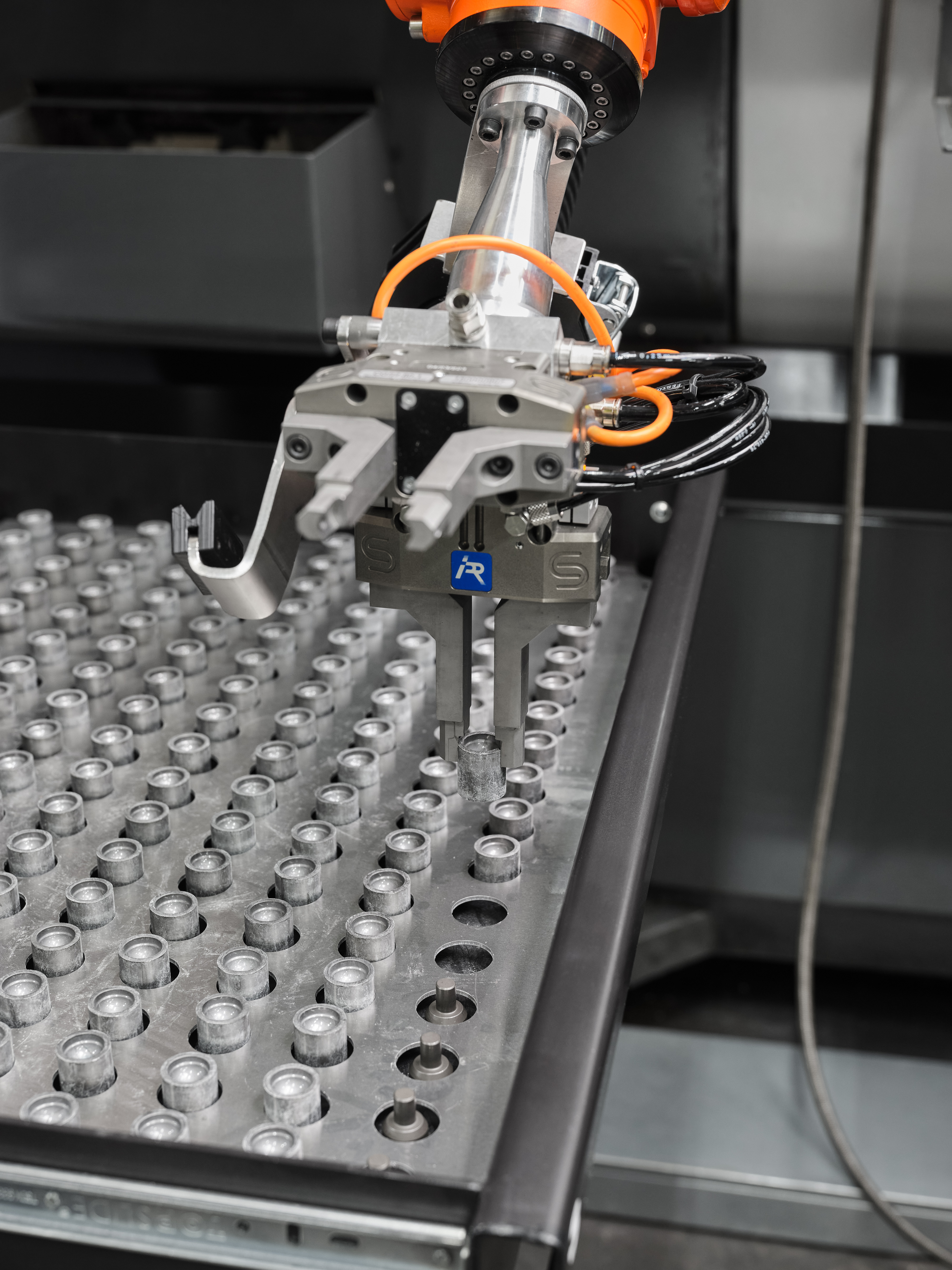 Am Ende des 6-Achs-Roboters sitzt ein Doppelgreifer mit integrierter Ausblasung. Der kann durch unterschiedliche Greifergeometrien in einem Zyklus ein fertig bearbeitetes Teil entnehmen und ein neues Rohteil einwechseln.