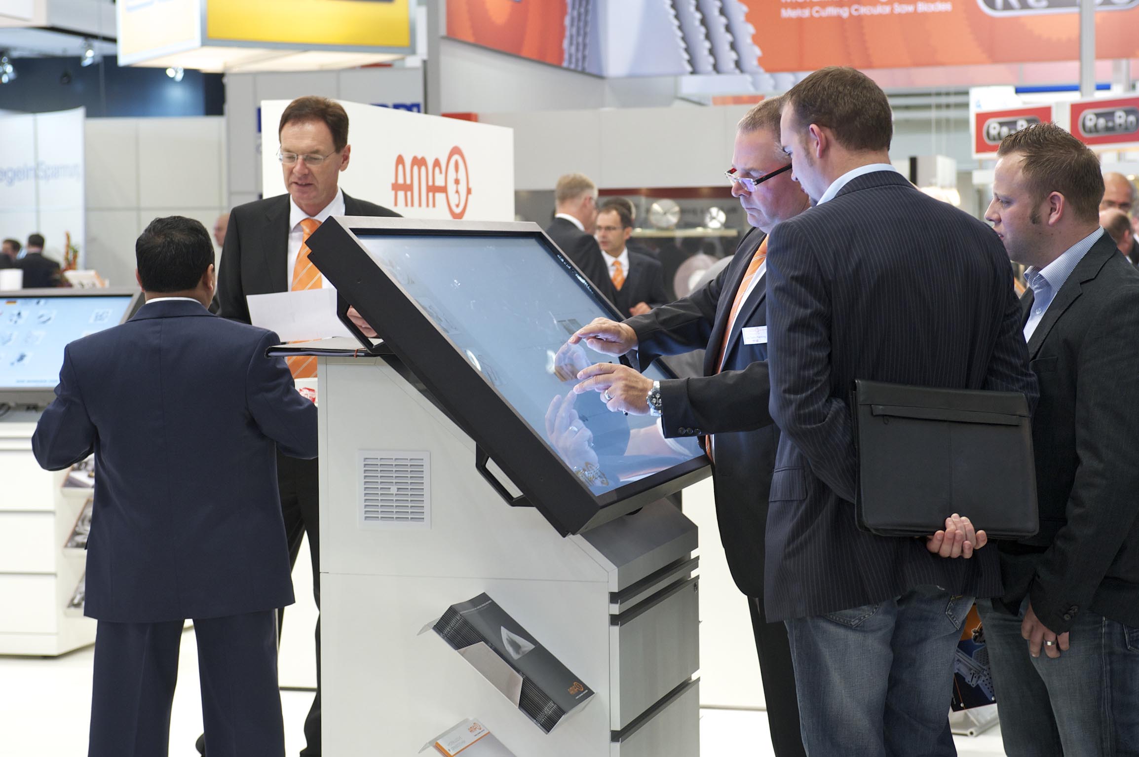 Acht Informationsterminals mit Smart-Phone Anmutung zeigen sämtliche Produkte in Funktionsbeispielen.