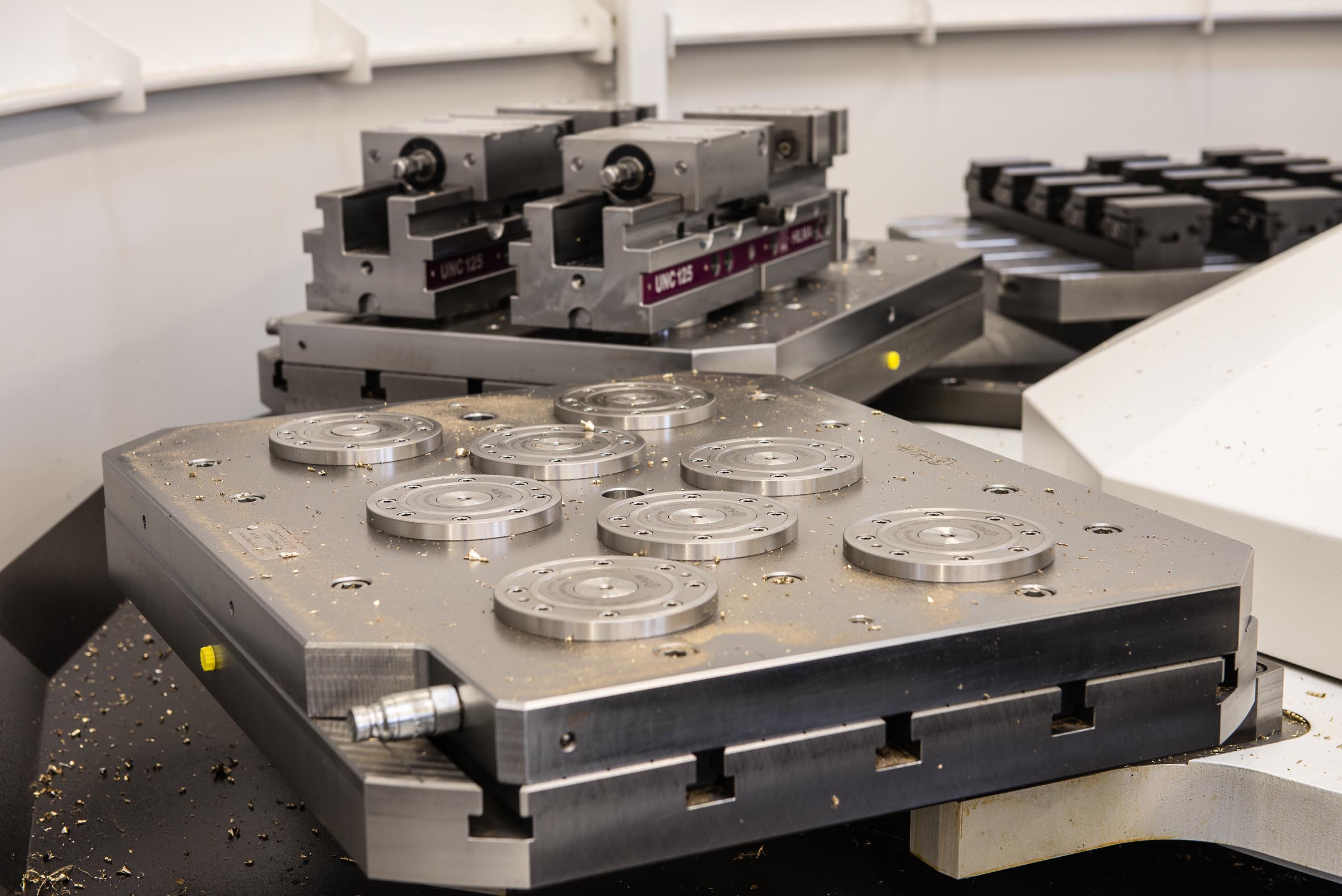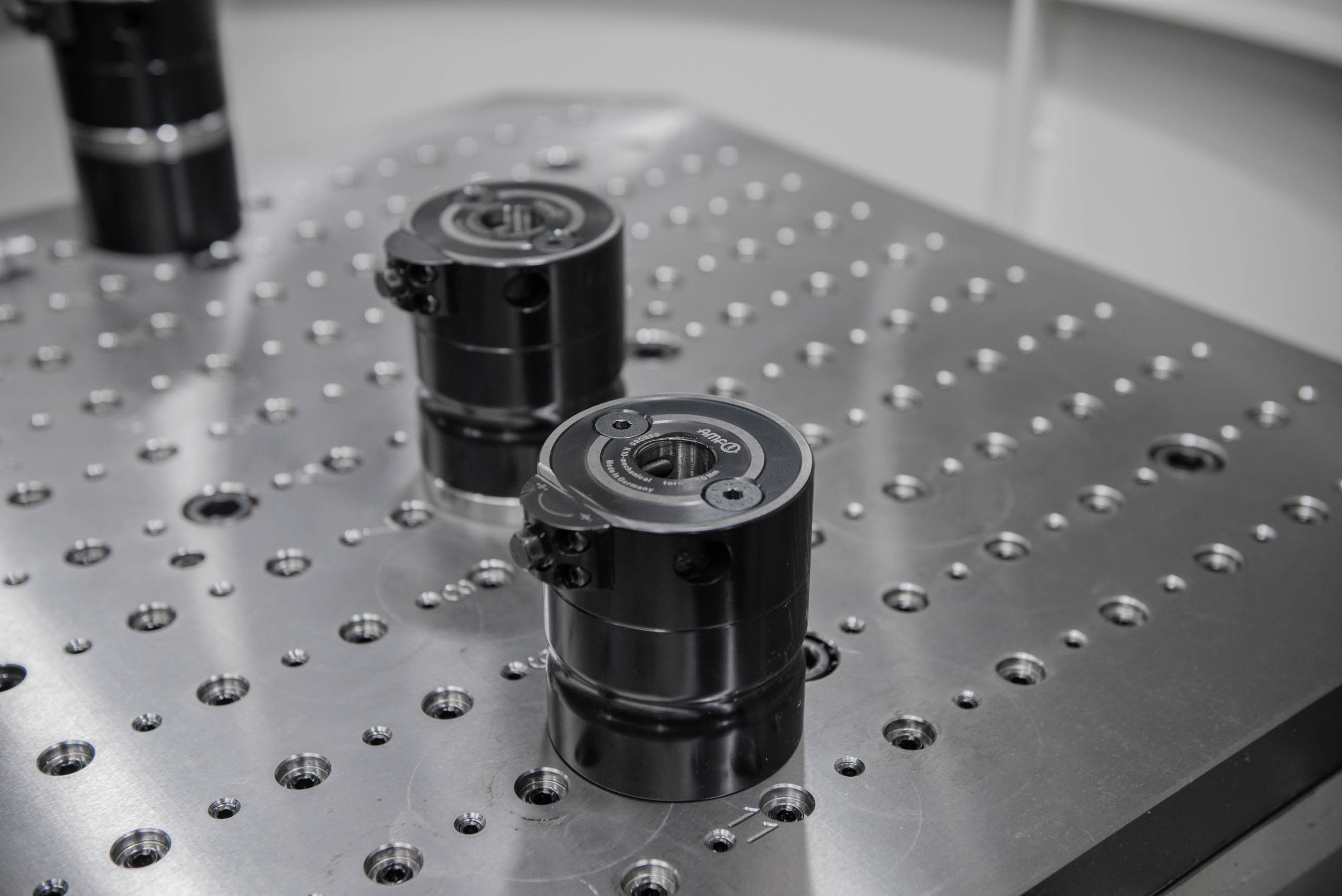 Aufnahmeplatten mit eingebauten Nullpunktspannmodulen von AMF warten auf die Prüflinge.