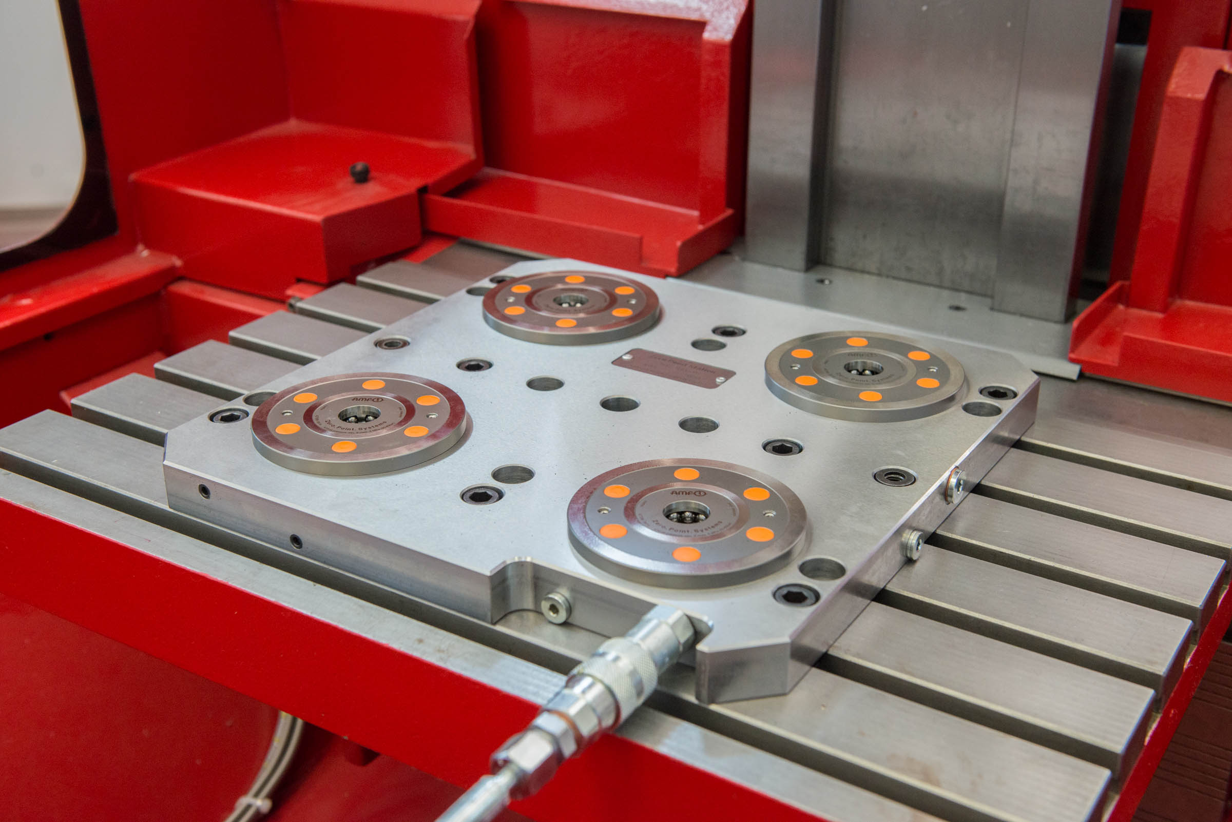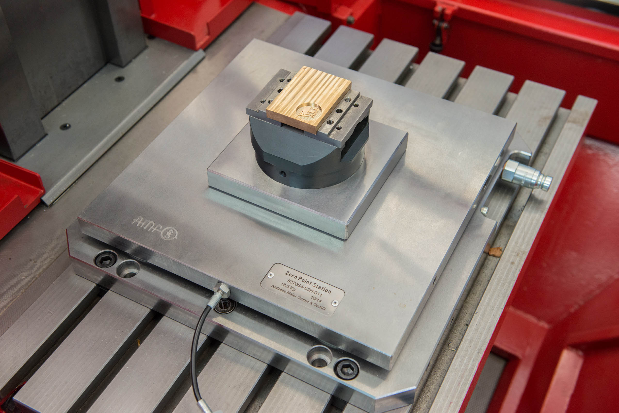 Nach Erstellung eines umfangreichen Lastenhefts ist seit Herbst 2014 die neue Nullpunktspanntechnik im Einsatz. Sie besteht aus einer Standard-Grundplatte mit vier AMF-Nullpunktspannmodulen K 10.2, die für die DMG-Maschine vorgesehen ist. Mit 112 Millimeter Durchmesser verfügt das Modul K 10.2 über eine große Auflagefläche und ist unempfindlich gegenüber bei der Bearbeitung entstehenden Seiten- oder Zugkräften. Es spannt mit 25 kN Kraft und kann bei der Zerspanung hohe Kippmomente aufnehmen. Das ermöglicht dem Anwender hohe Präzision und Maßgenauigkeit auch bei großen Zerspanungskräften. „Ideal für die Schrupparbeiten, die wir auf der DMG fahren“, betont Zinn.