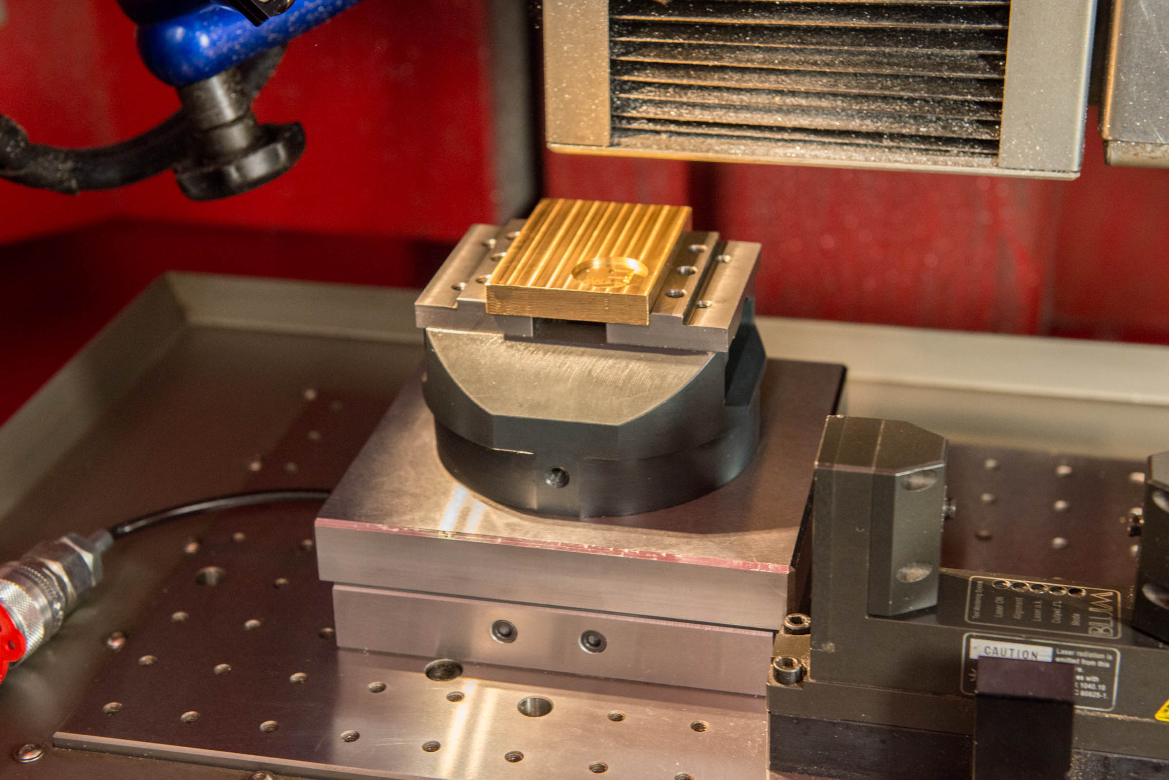 Auf der Grundplatte sitzt eine Sonderplatte mit vier AMF-Nullpunktspannmodulen K 5, auf der ein kleiner und kräftiger aber zugleich niedrig bauender Spannstock verschraubt ist. Sie ist mit nur 23 mm Bauhöhe extrem flach. Das ist möglich, weil auch die Spannmodule K 5 sehr niedrig bauen. Dennoch sind sie mit 13 kN Spannkraft, bei einem geringen Einschraub-Durchmesser von M45 mm, sehr stark. Im Viererverbund spannen sie folglich die Werkstücke mit 52 kN. Die Sonderplatte mit Spannstock kann nun einfach zwischen beiden Fräsmaschinen hin und her gewechselt werden. Beim Wechsel von der DMG-Maschine auf die Kern hat Zinn mit dem eingebauten Renishaw-System eine Wiederholgenauigkeit von sagenhaft niedrigen 1,3 µm gemessen. „Das hat uns sehr beeindruckt, ist es doch viel genauer als wir gefordert hatten. Nun bietet uns diese Spannlösung noch mehr Möglichkeiten“, freut sich Zinn.