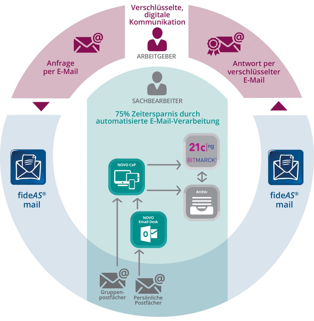 Die gemeinsame Lösung „Verschlüsselte E-Mail-Kommunikation“ von inovoo und apsec ist ein Standard, der es ermöglicht, eingehende E-Mails zu konvertieren und in die Fachsysteme zu übergeben sowie ausgehende E-Mails zu verschlüsseln und parallel in die Kundenakte zu legen