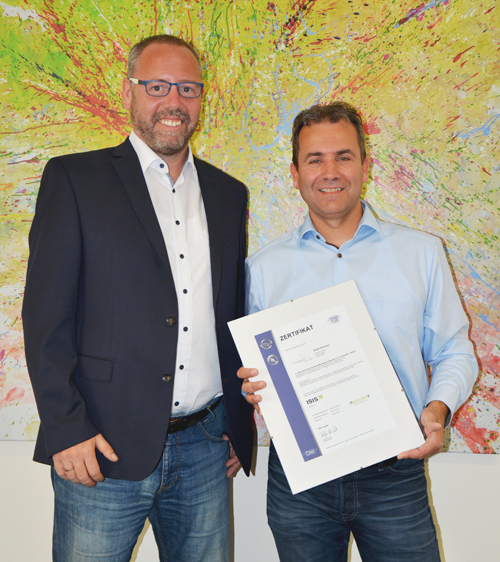 Claus Möhler (links im Bild), ISIS12 Berater der Applied Security GmbH aus Großwallstadt gratuliert Matthias Geis, Informationssicherheitsbeauftragter der Stadt Alzenau, zum erfolgreichen Abschluss des Prozesses