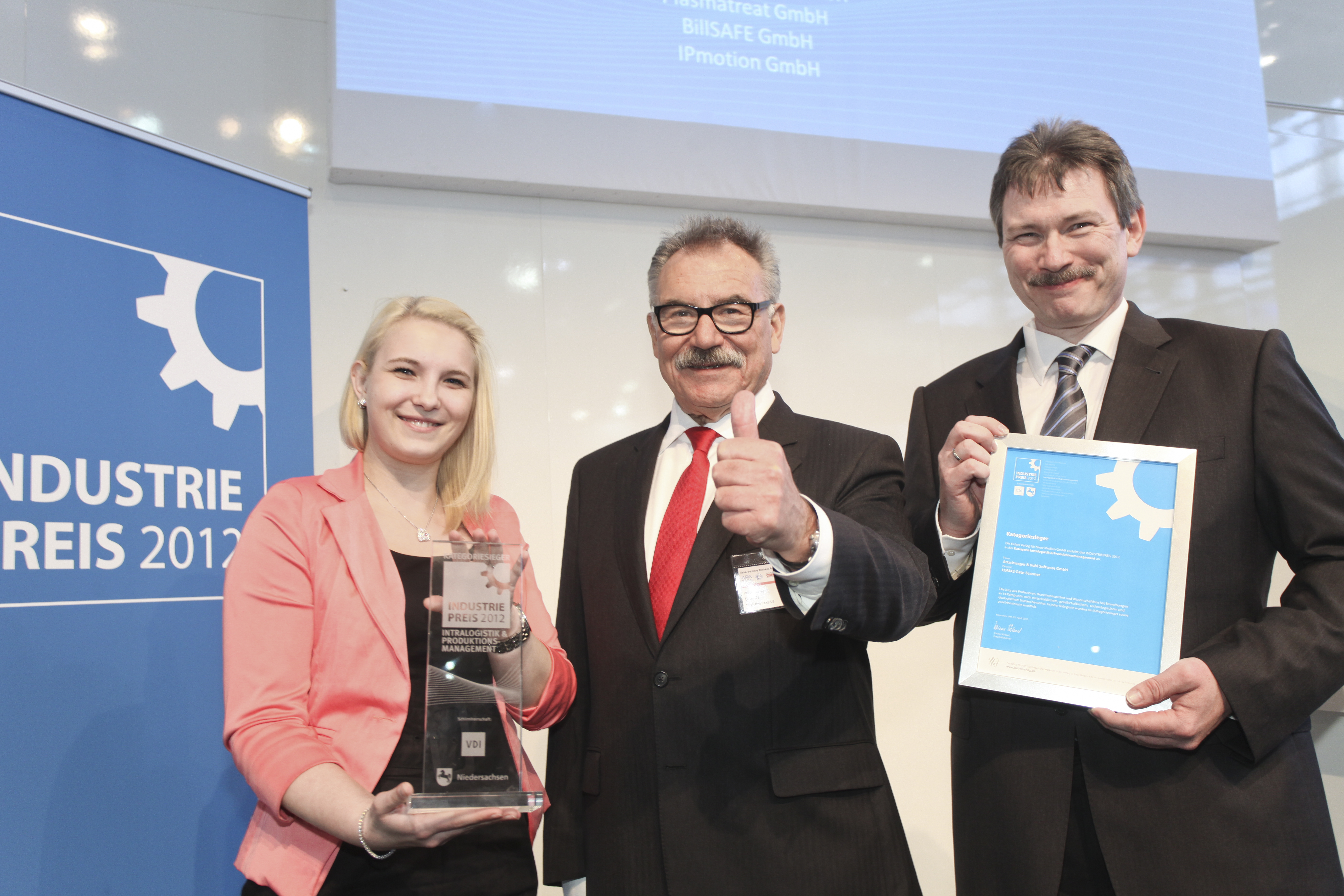 Das Projektteam Kerstin Ammon, Markus Postler und Tobias Walz (nicht im Bild) sowie die beiden Geschäftsführer Jürgen Kohl (l.) und Guido Artschwager (r.) freuen sich über die erneute Auszeichnung mit dem 1. Platz des Industriepreises in der Kategorie Intralogistik & Produktionsmanagement