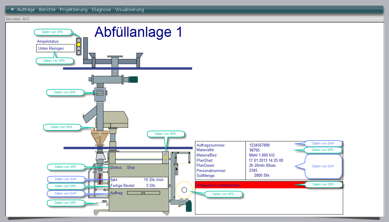 grafische Darstellung einer Abfüllanlage mit Angaben der Datenquellen, denen die Daten entstammen