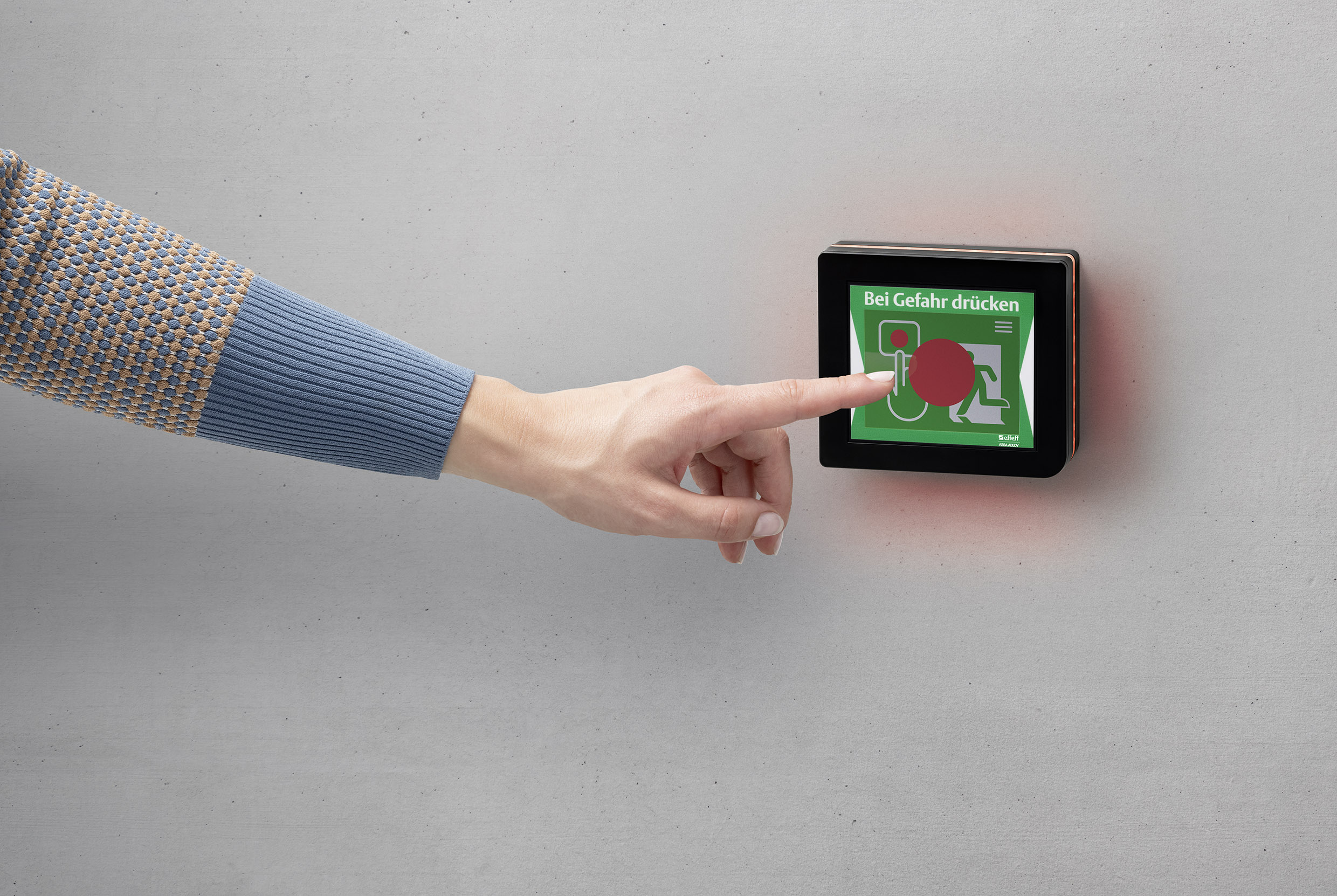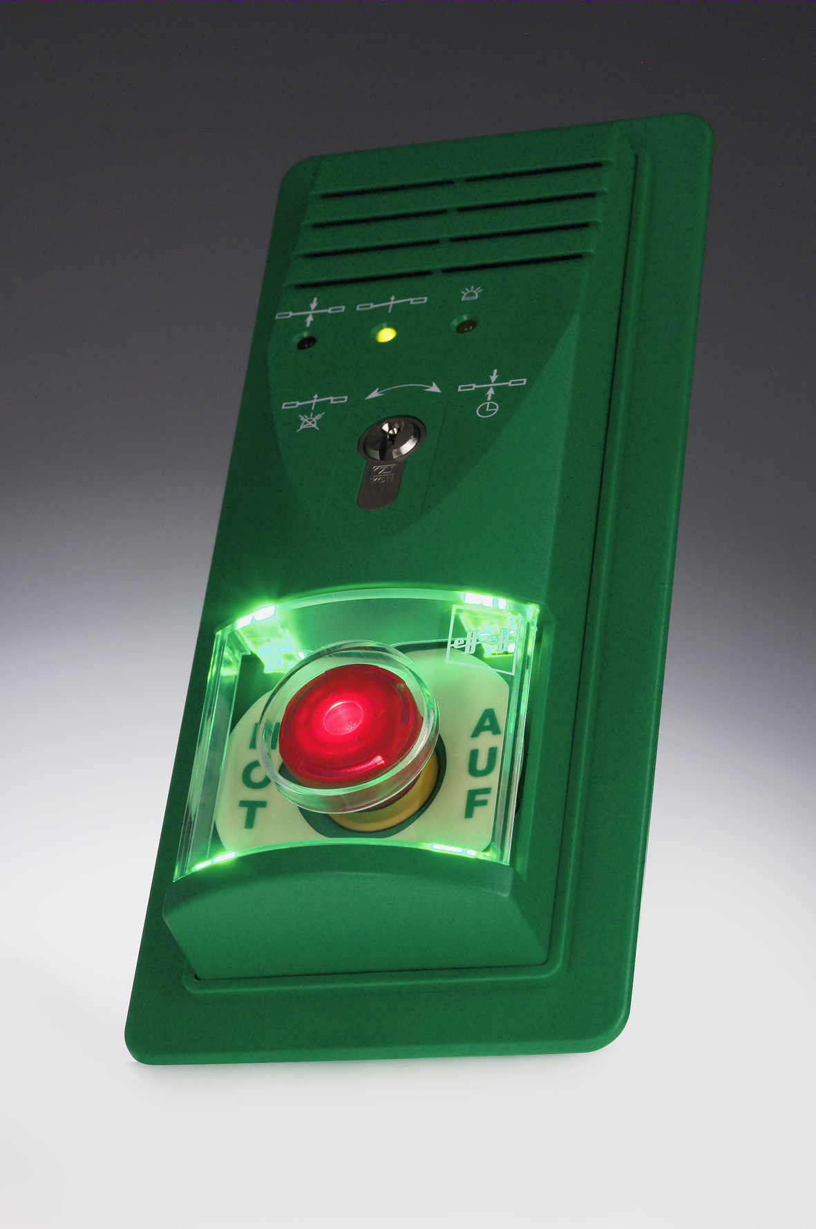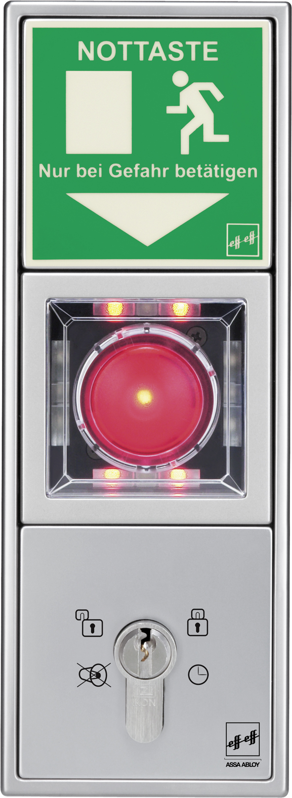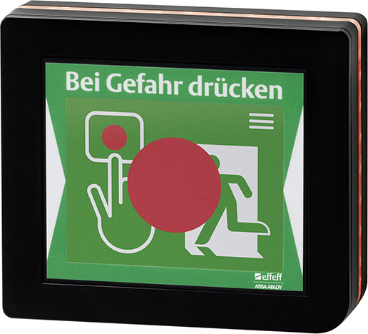 Die neue effeff-Fluchttürterminalreihe 1385 stellt durch eine Mehrtonsirene und ein Blindensignal sicher, dass die Gefahr akustisch wahrgenommen und der Weg zur Fluchttür bei starker Rauchentwicklung leichter gefunden wird
