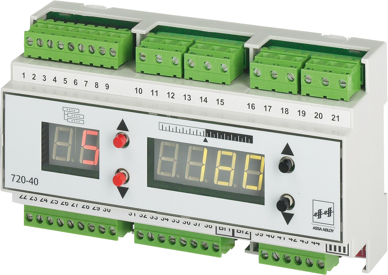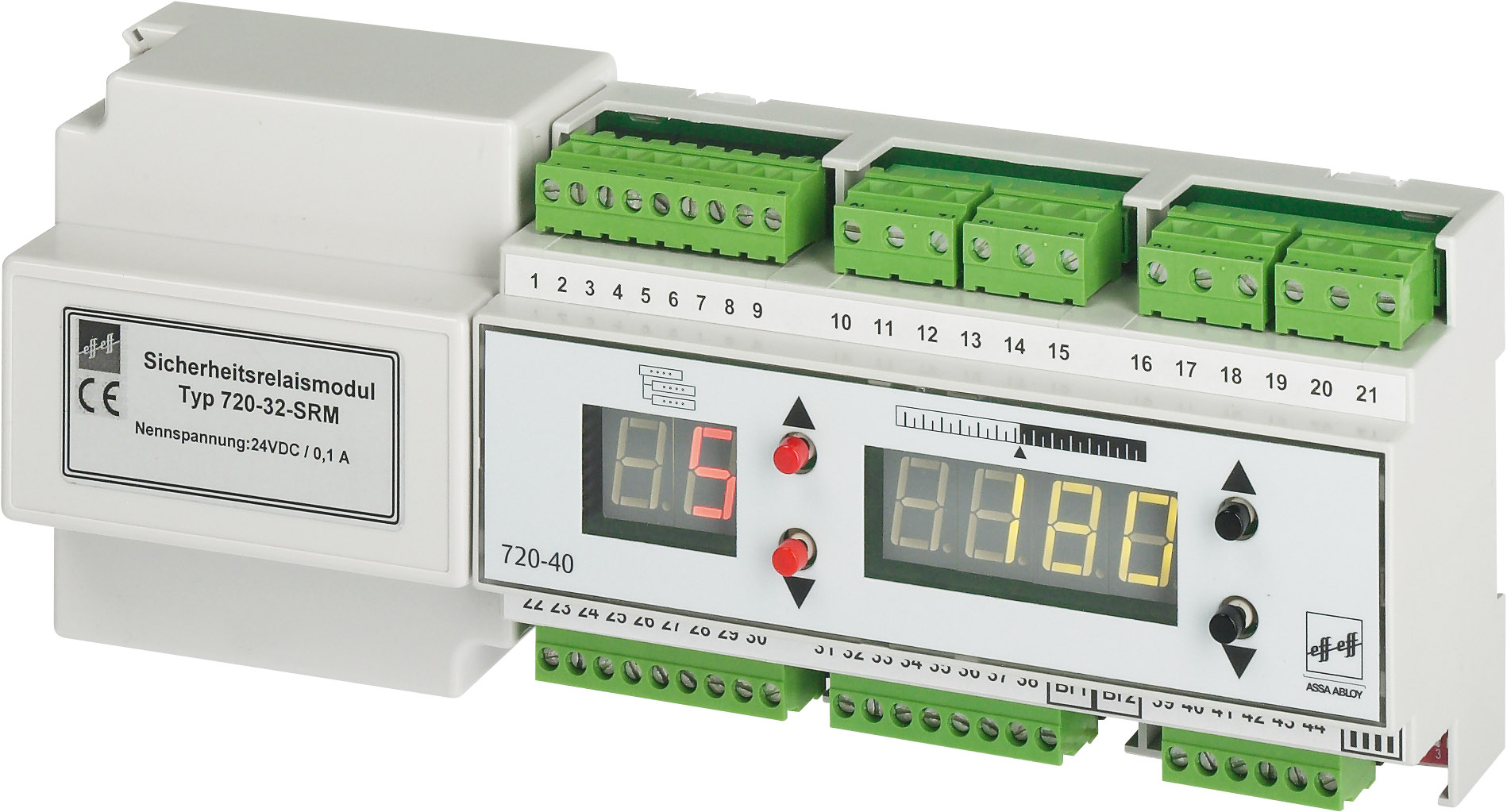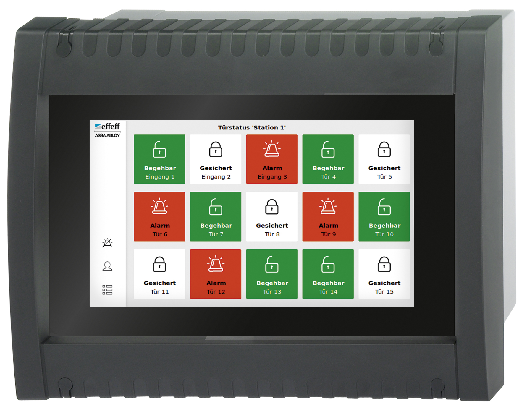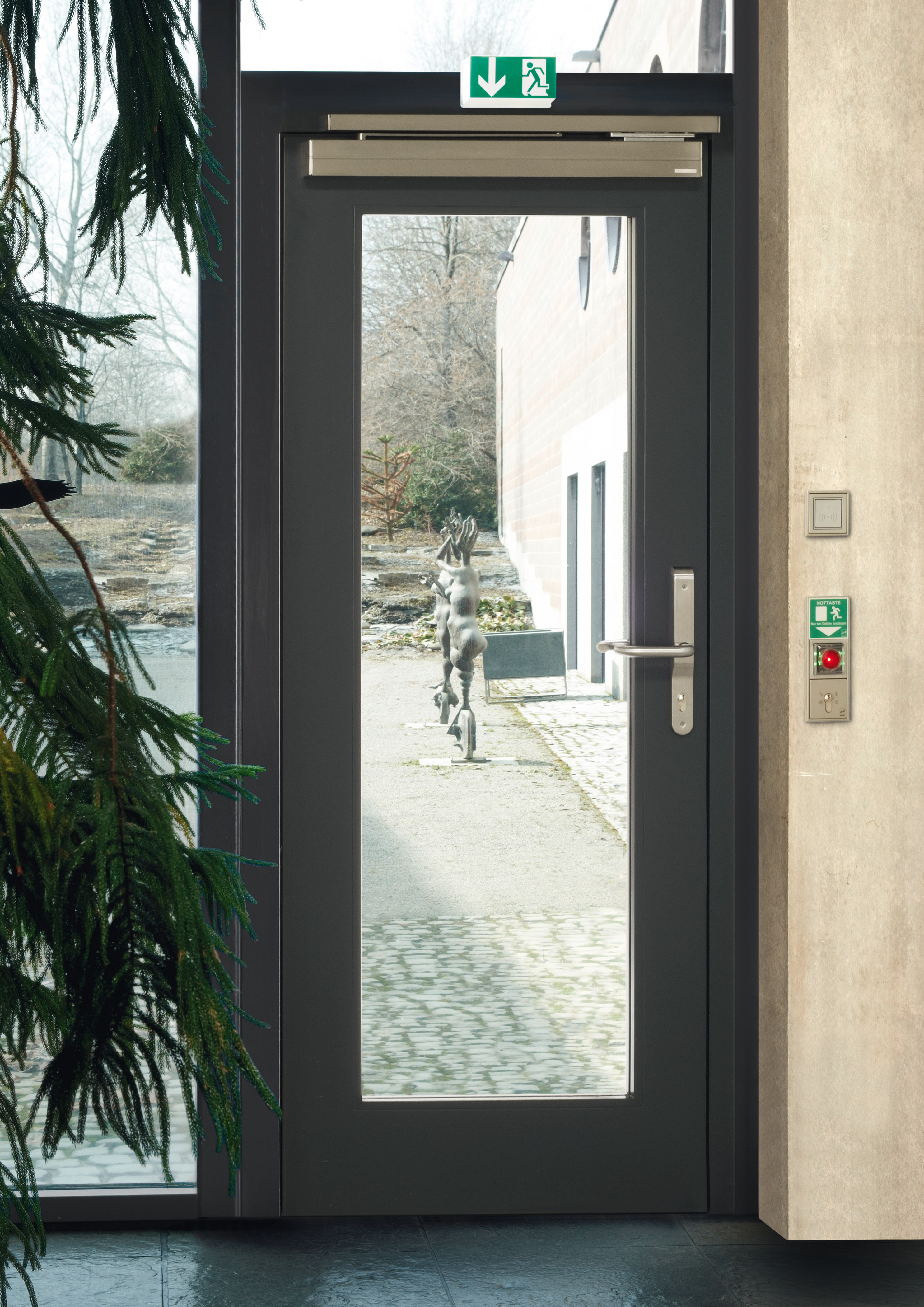 Die neue effeff-Fluchttürterminalreihe 1385 stellt durch eine Mehrtonsirene und ein Blindensignal sicher, dass die Gefahr akustisch wahrgenommen und der Weg zur Fluchttür bei starker Rauchentwicklung leichter gefunden wird