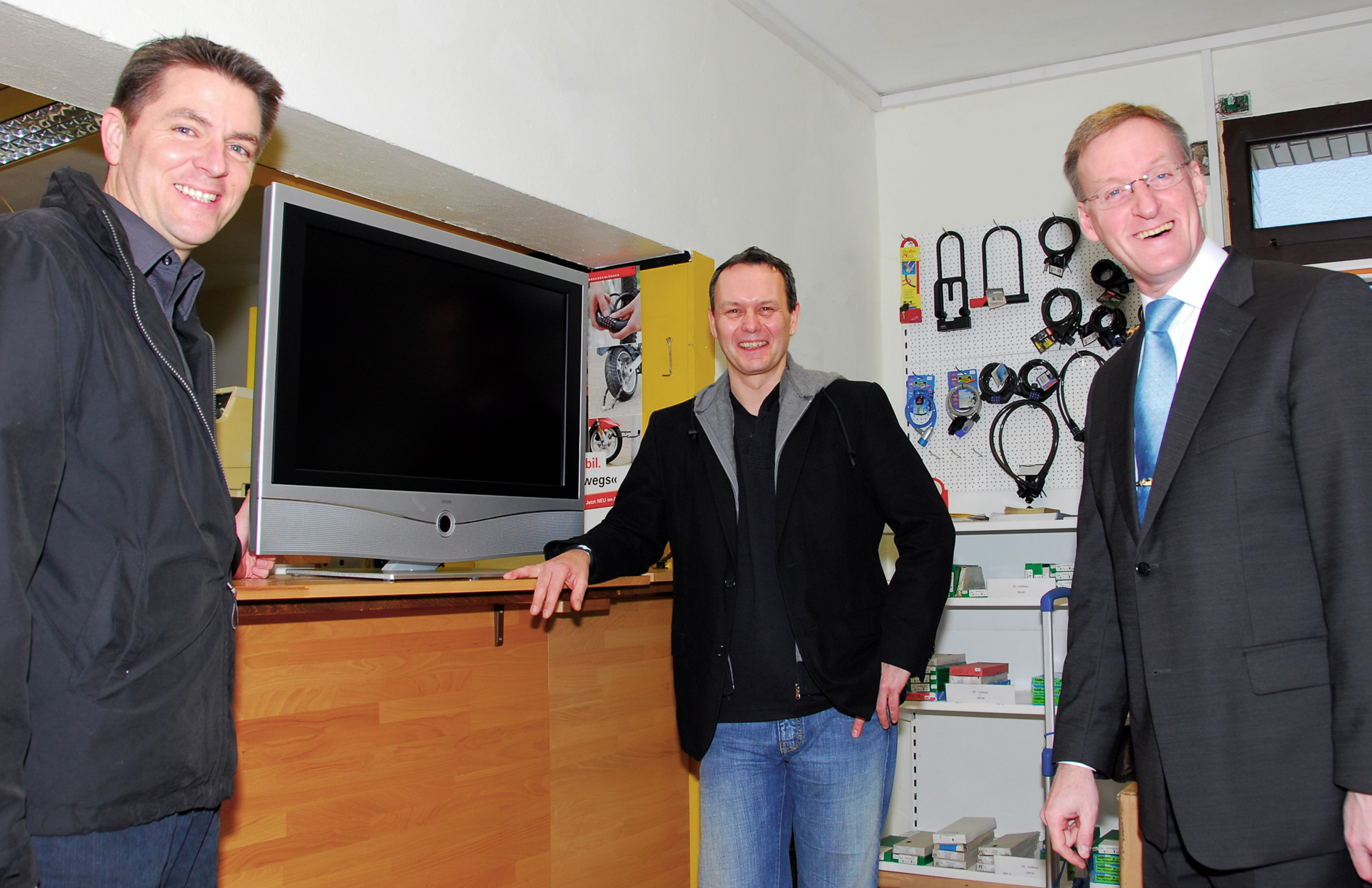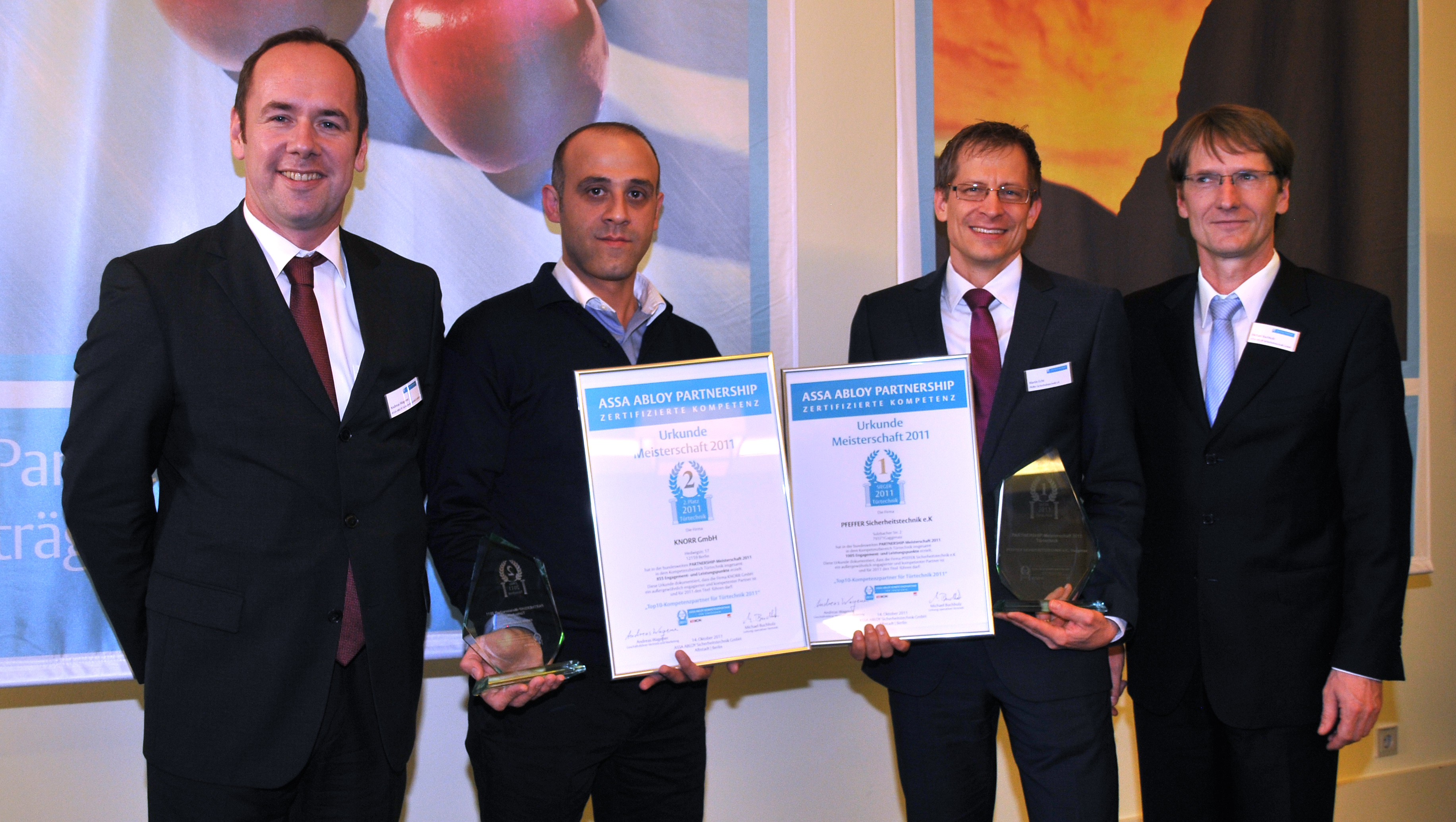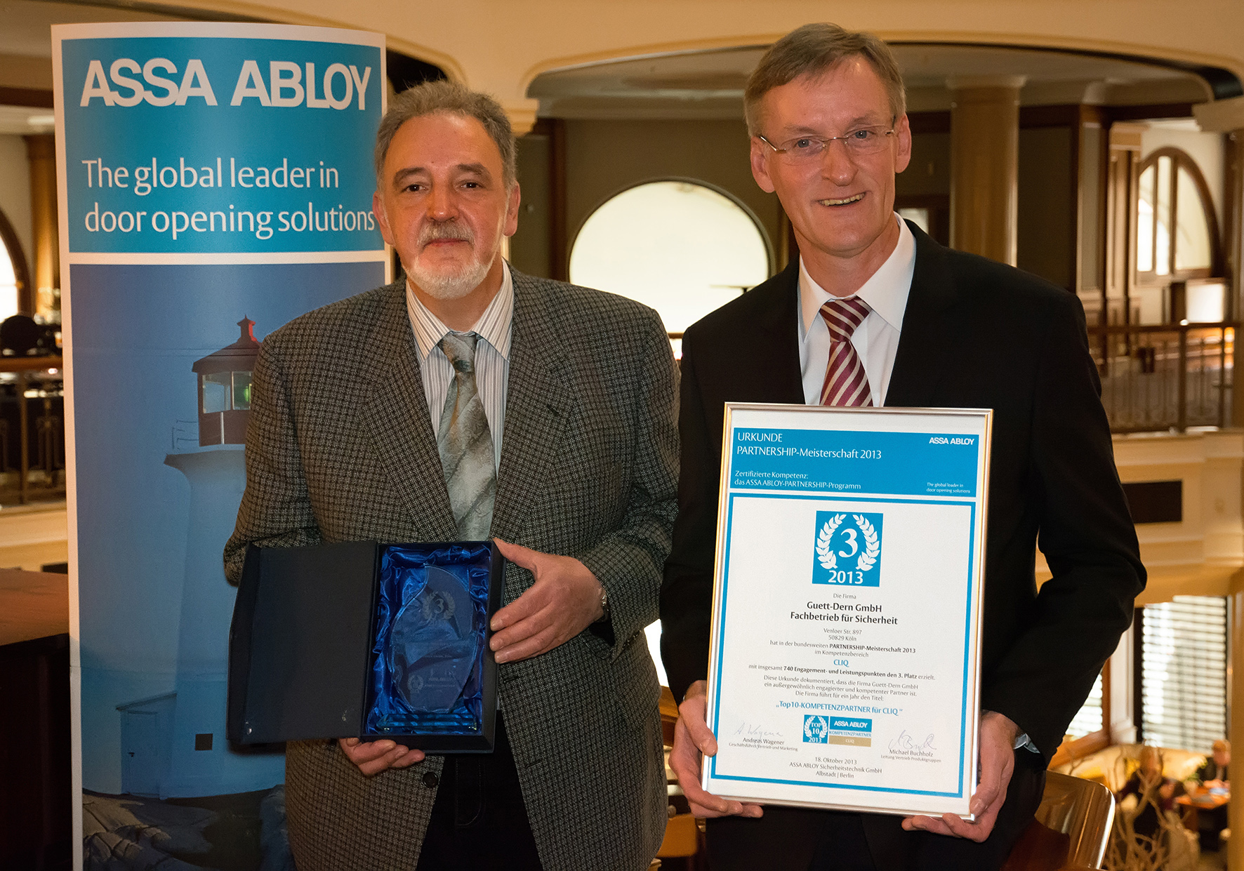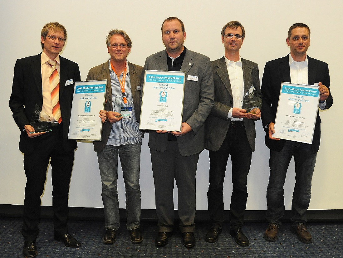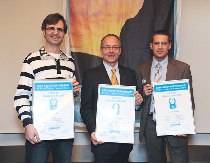 Volker Laufs,Fachberater der ASSA ABLOY Sicherheitstechnik GmbH(l.)Winfried Schaarschmidt,Regional Verkaufsleiter West der ASSA ABLOY Sicherheitstechnik GmbH(r.)haben Jürgen Opfermann, dem Inhaber des Schlüssel-Not-Dienst Willi Henkel,den Preis übergeben