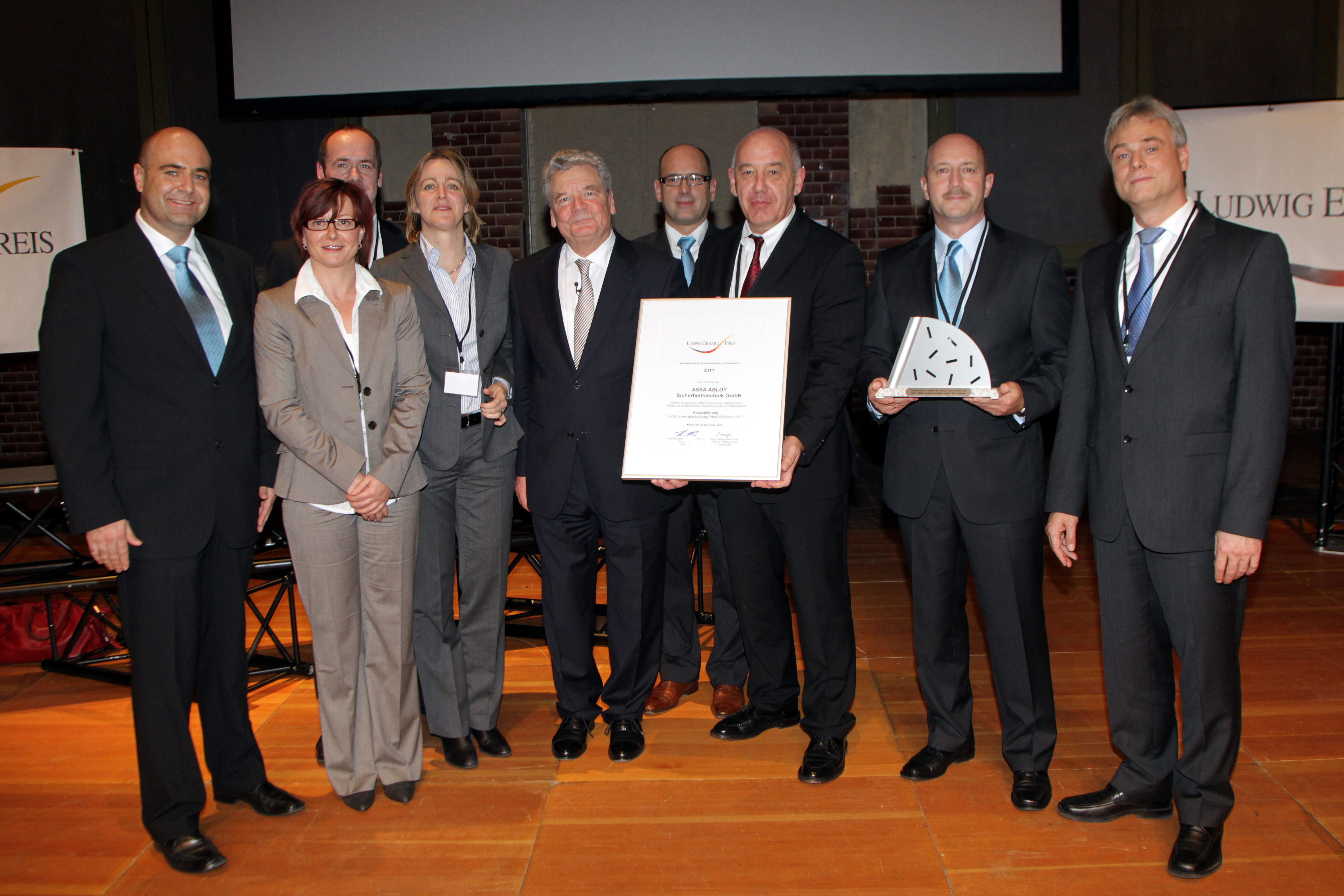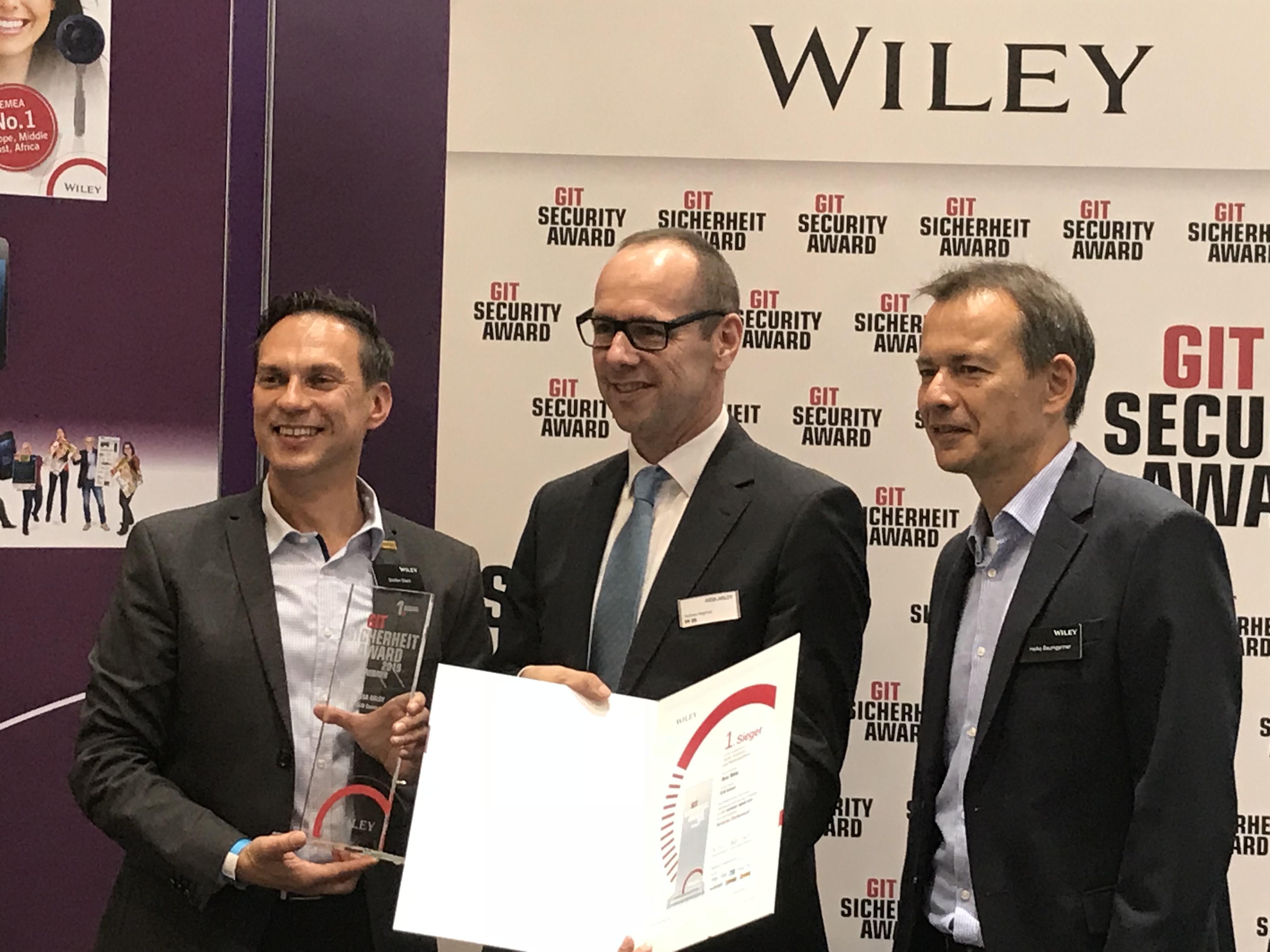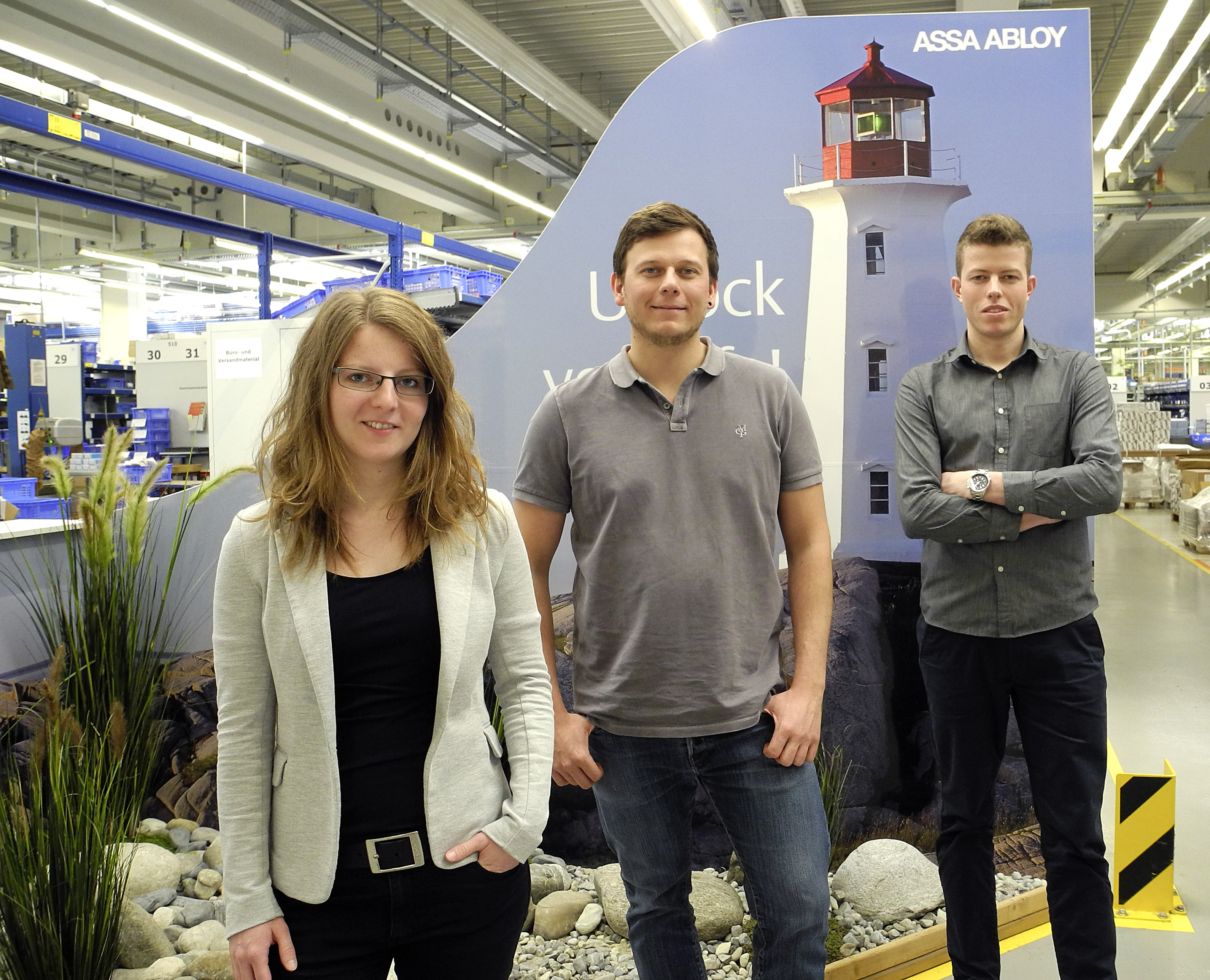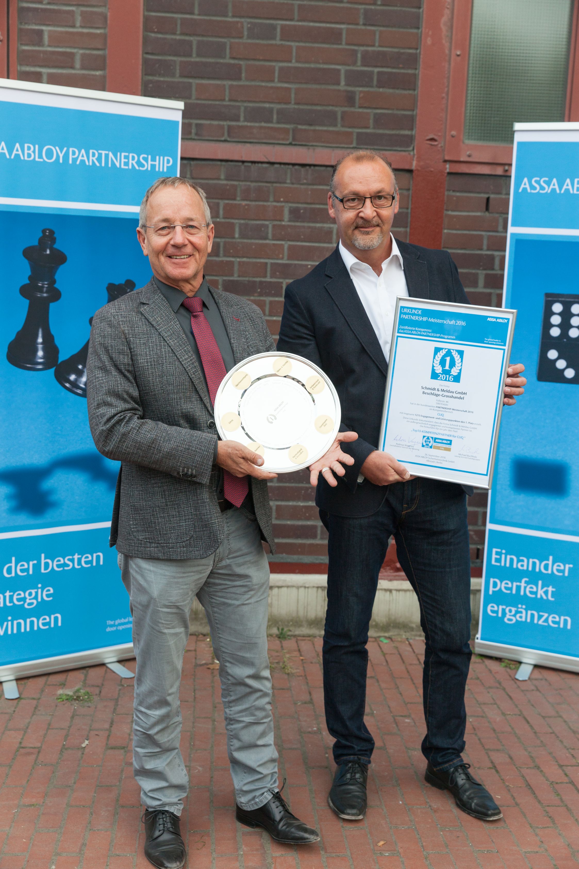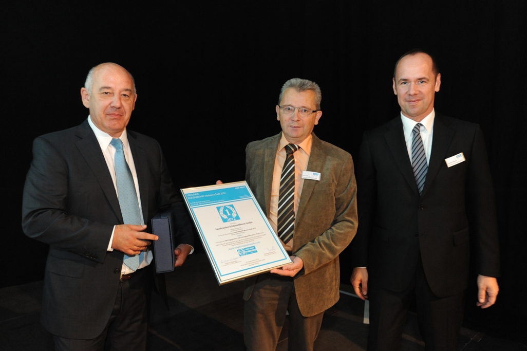 Volker Laufs,Fachberater der ASSA ABLOY Sicherheitstechnik GmbH(l.)Winfried Schaarschmidt,Regional Verkaufsleiter West der ASSA ABLOY Sicherheitstechnik GmbH(r.)haben Jürgen Opfermann, dem Inhaber des Schlüssel-Not-Dienst Willi Henkel,den Preis übergeben