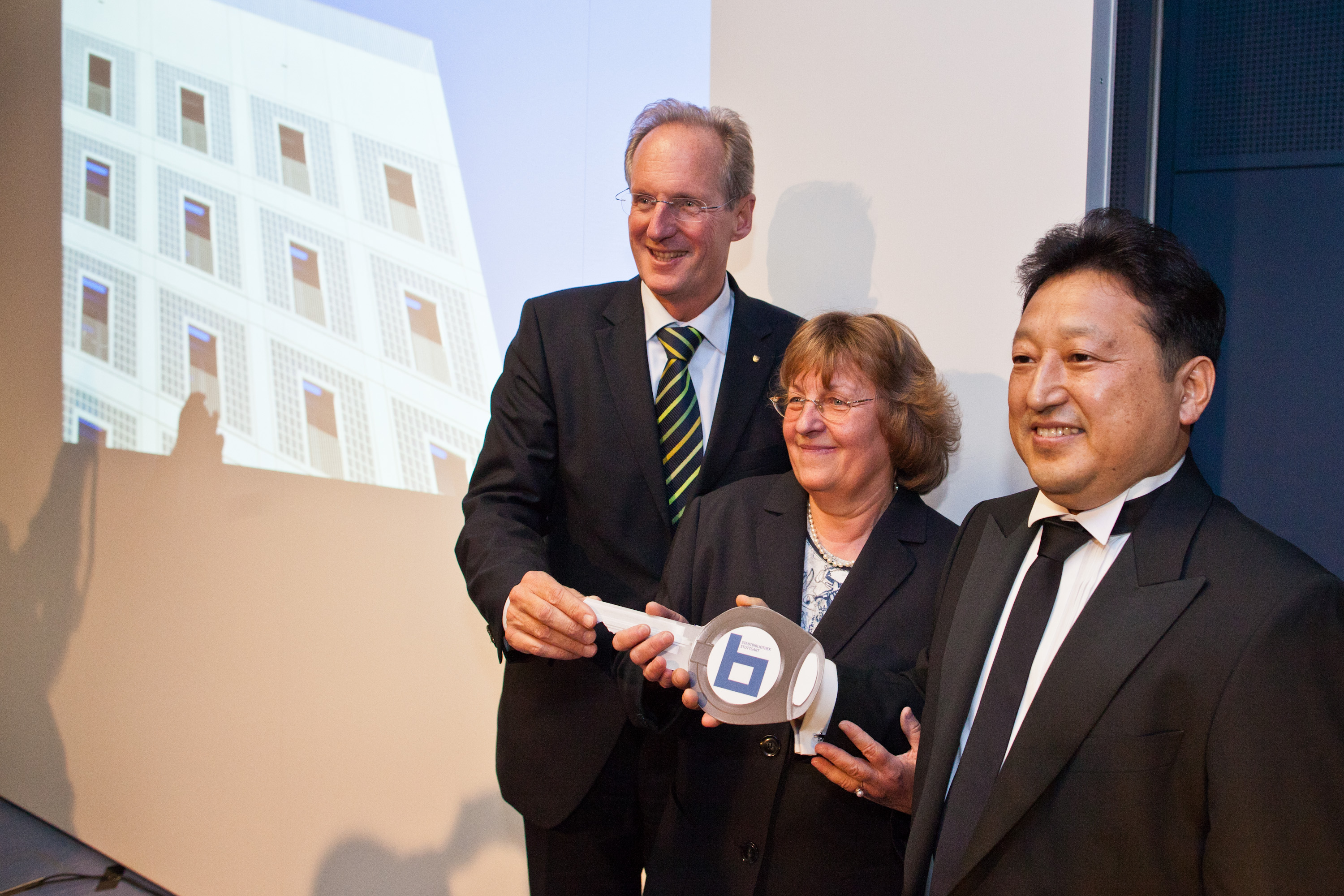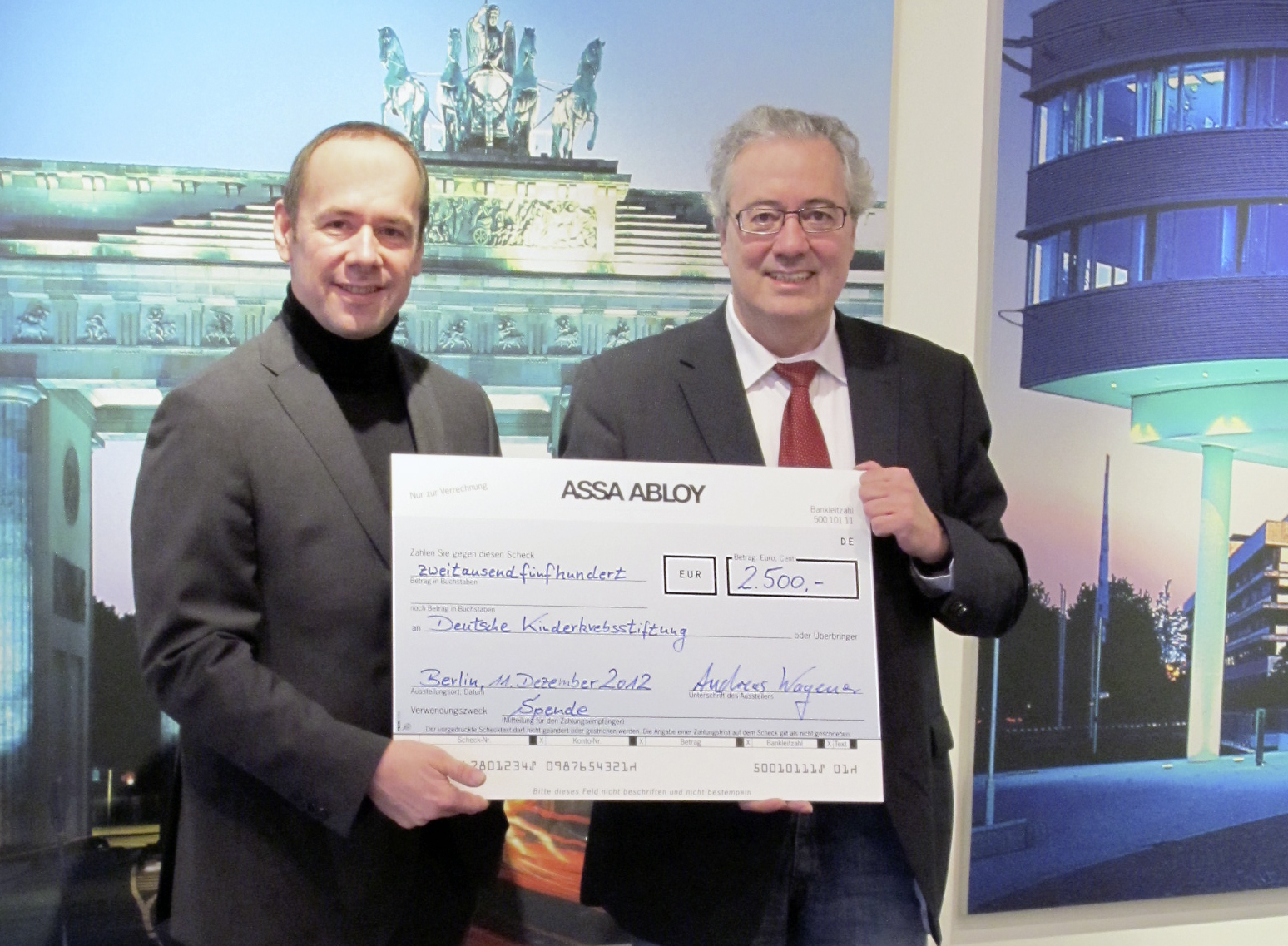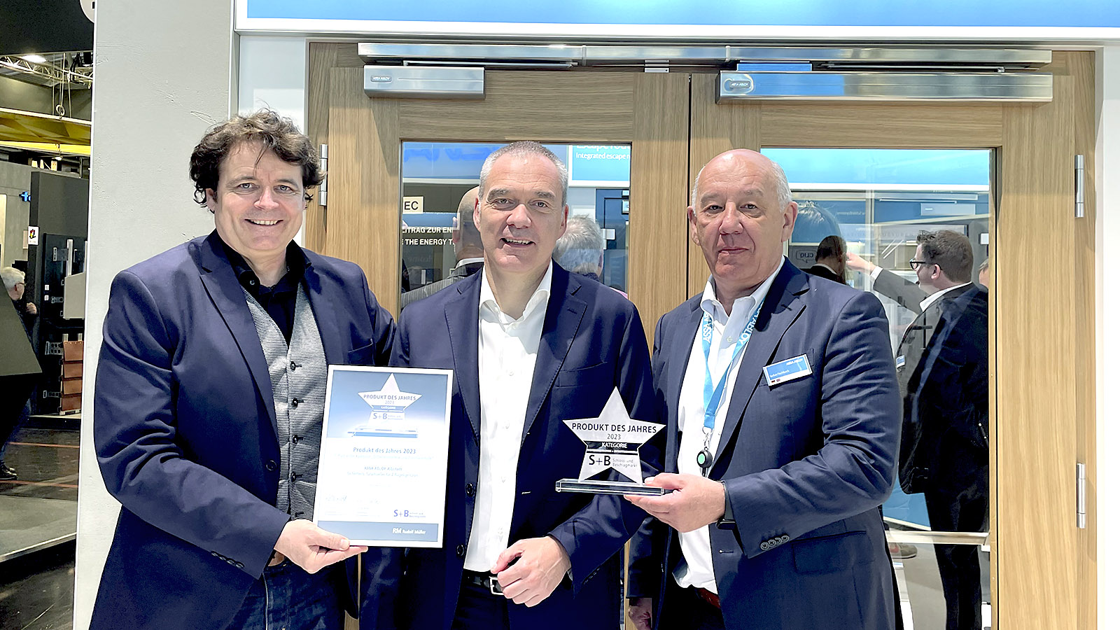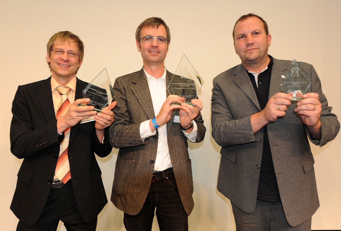 Volker Laufs,Fachberater der ASSA ABLOY Sicherheitstechnik GmbH(l.)Winfried Schaarschmidt,Regional Verkaufsleiter West der ASSA ABLOY Sicherheitstechnik GmbH(r.)haben Jürgen Opfermann, dem Inhaber des Schlüssel-Not-Dienst Willi Henkel,den Preis übergeben