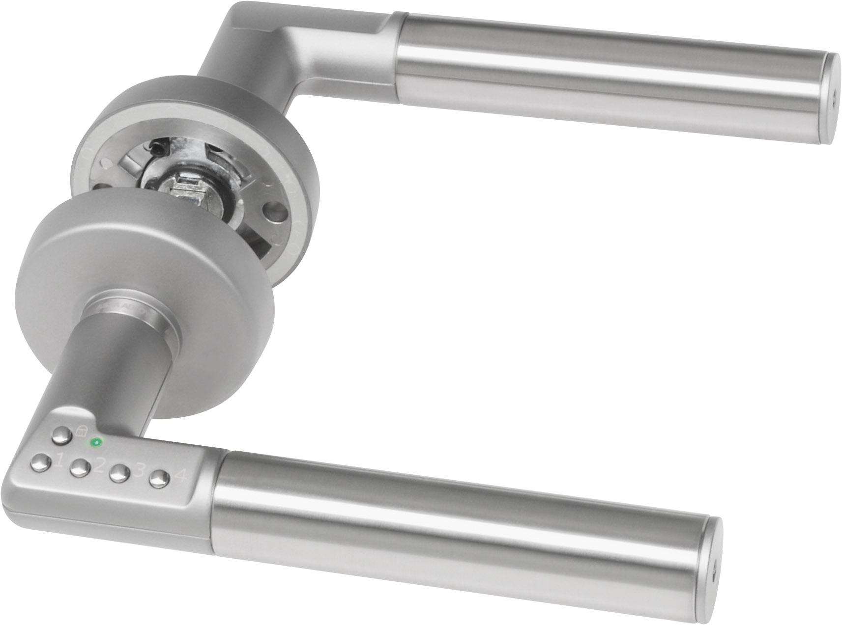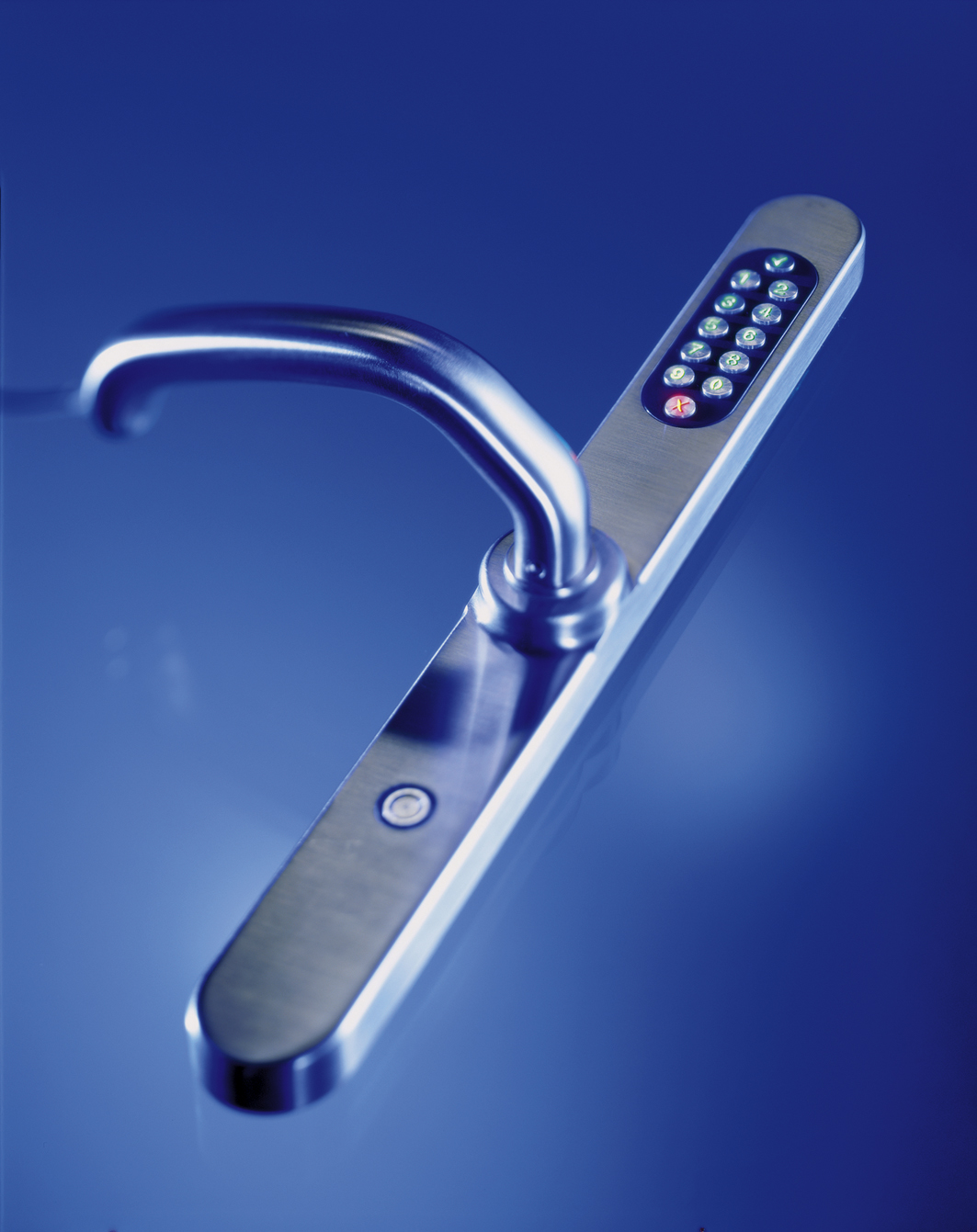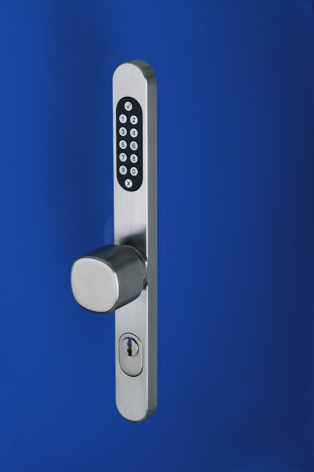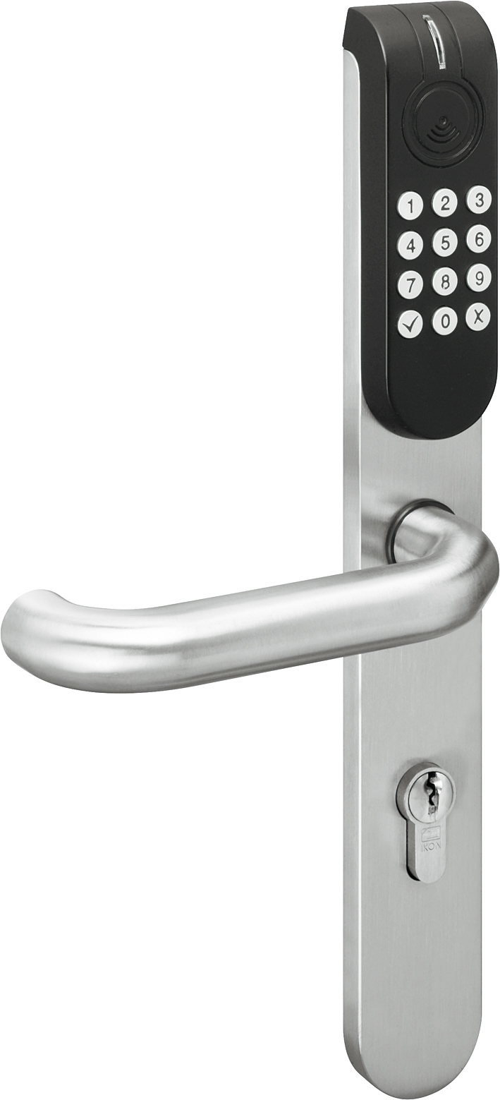 Der massive Edelstahl-Sicherheitsbeschlag ist in drei Ausführungen als Biometrie-Lösung mit Finger-Scan, berührungslosem Leser oder Türcode-Tastatur erhältlich