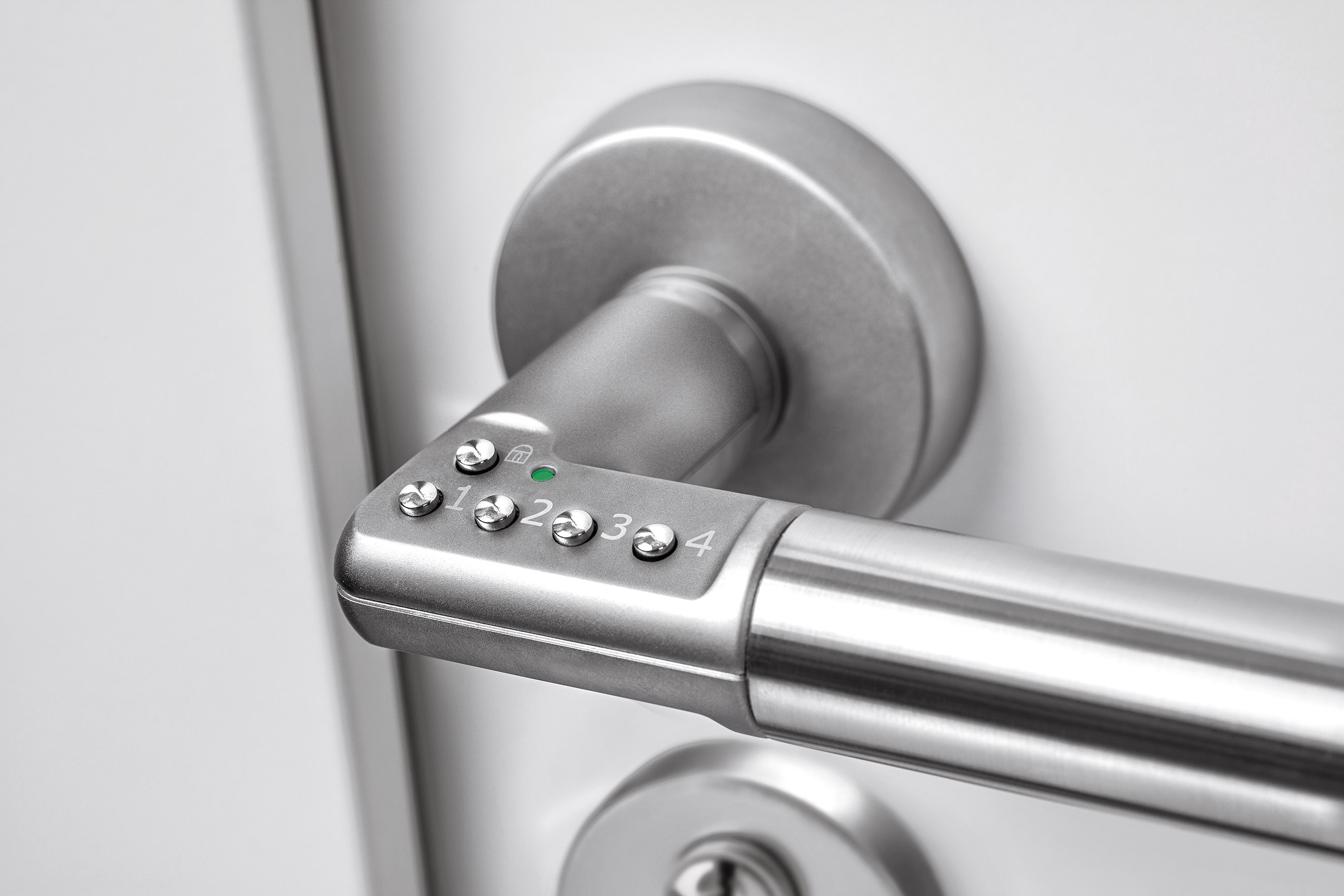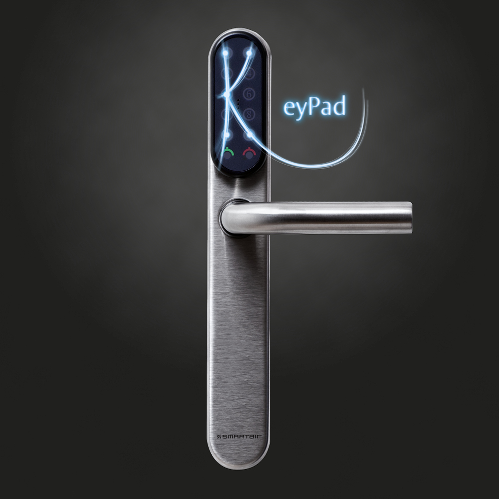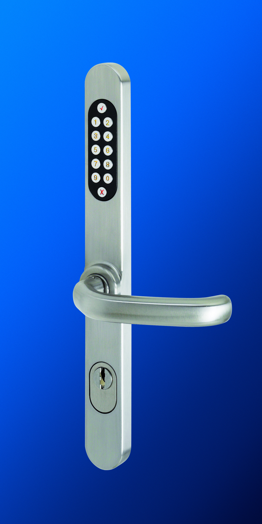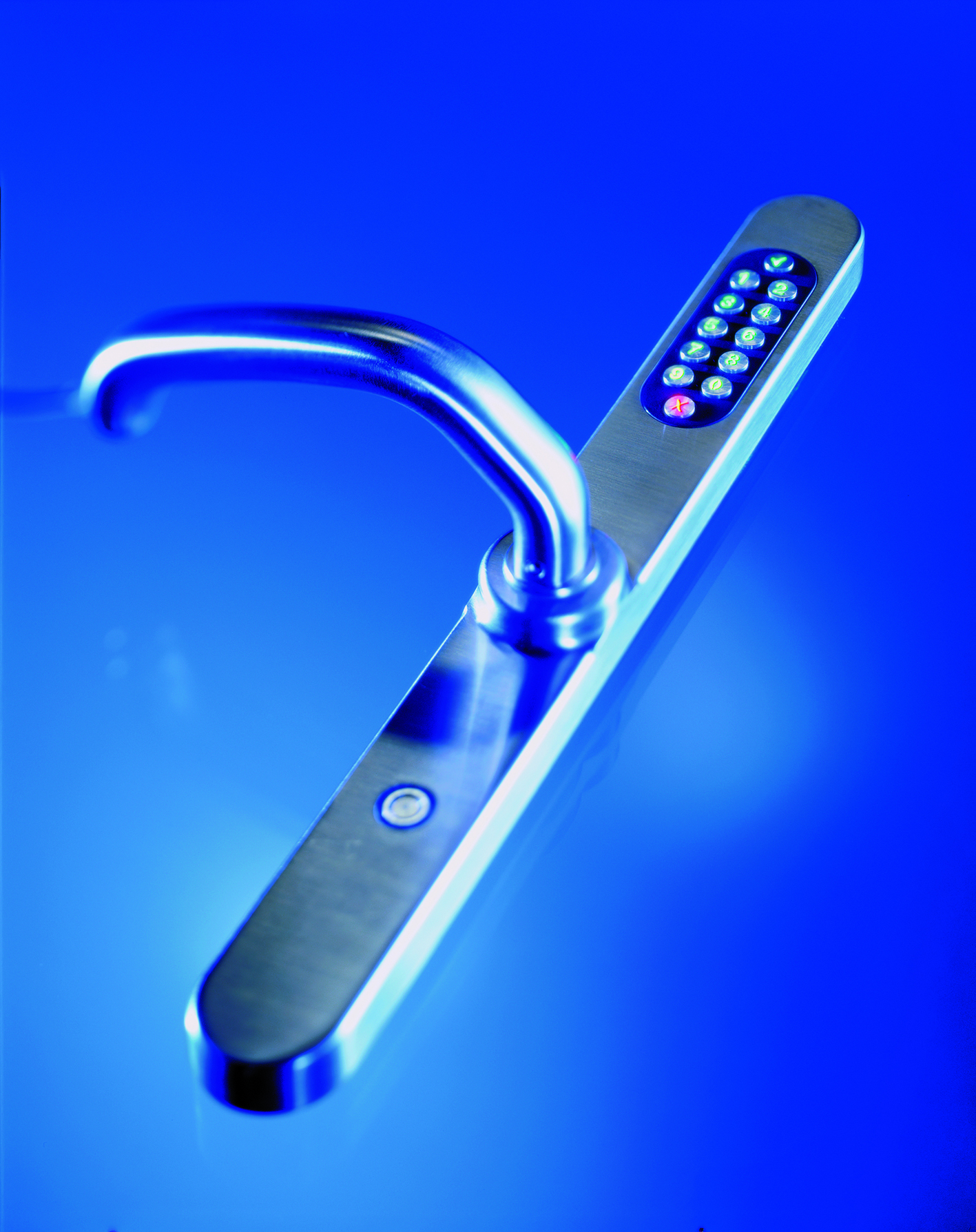 Der massive Edelstahl-Sicherheitsbeschlag ist in drei Ausführungen als Biometrie-Lösung mit Finger-Scan, berührungslosem Leser oder Türcode-Tastatur erhältlich