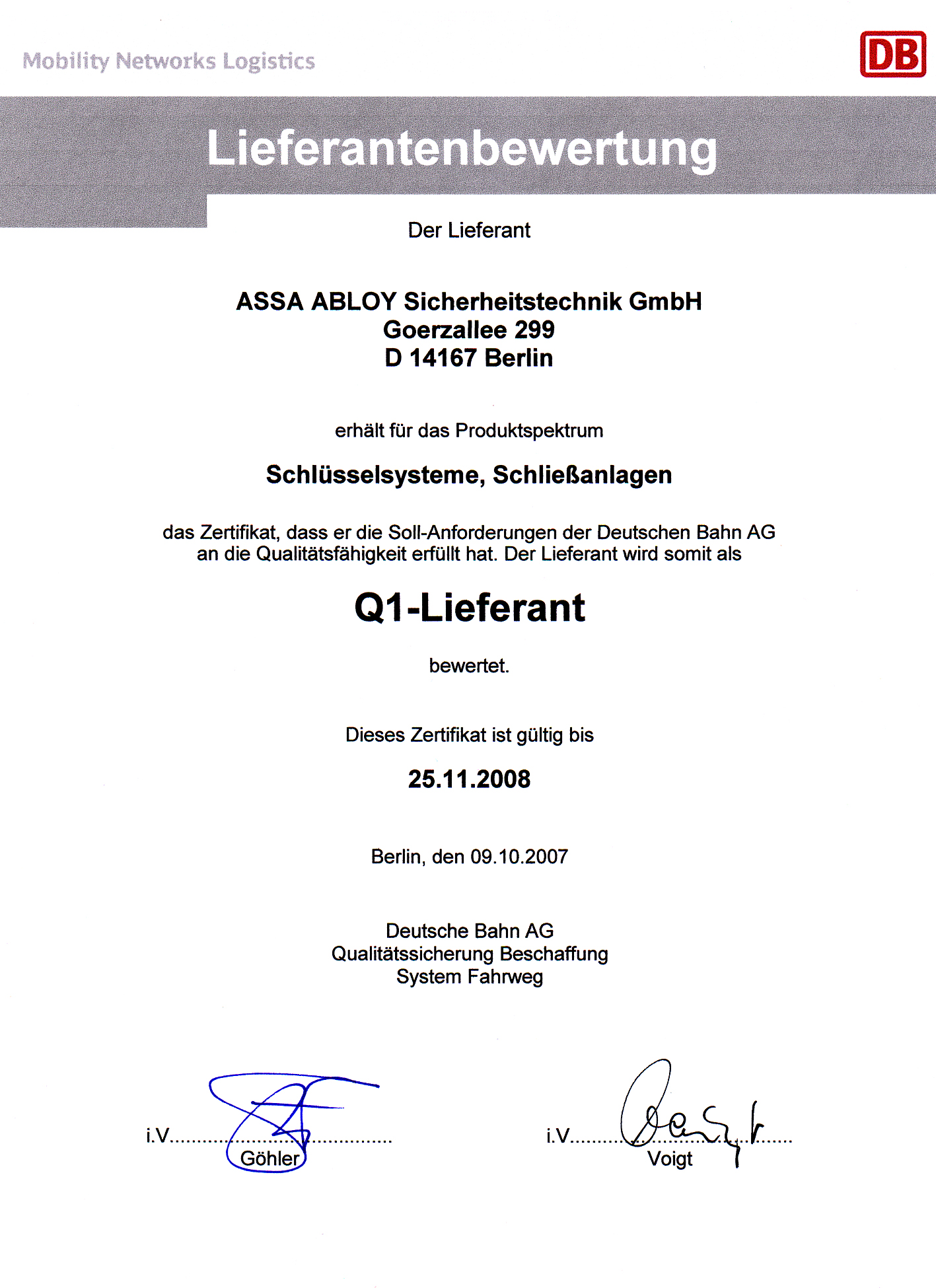 Seit Ende Oktober ist die ASSA ABLOY Sicherheitstechnik GmbH Q1-Lieferant der Deutschen Bahn AG