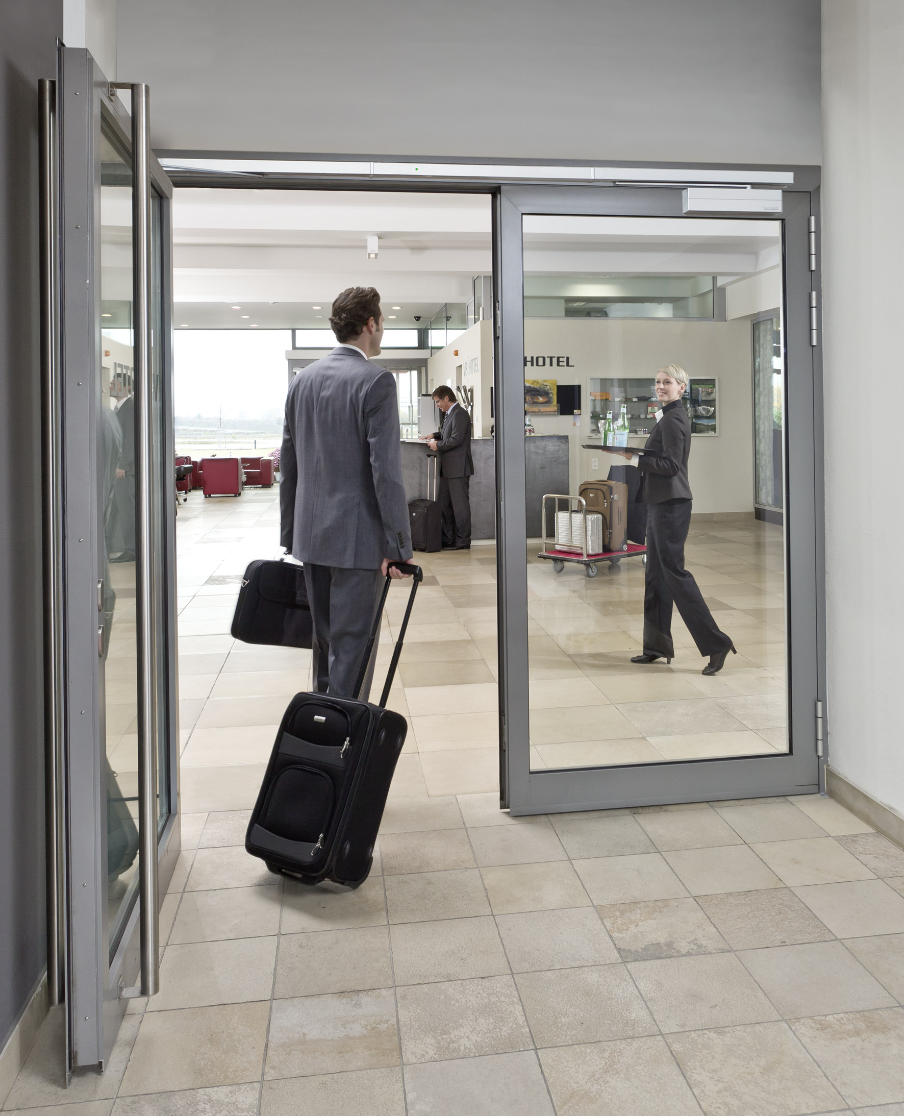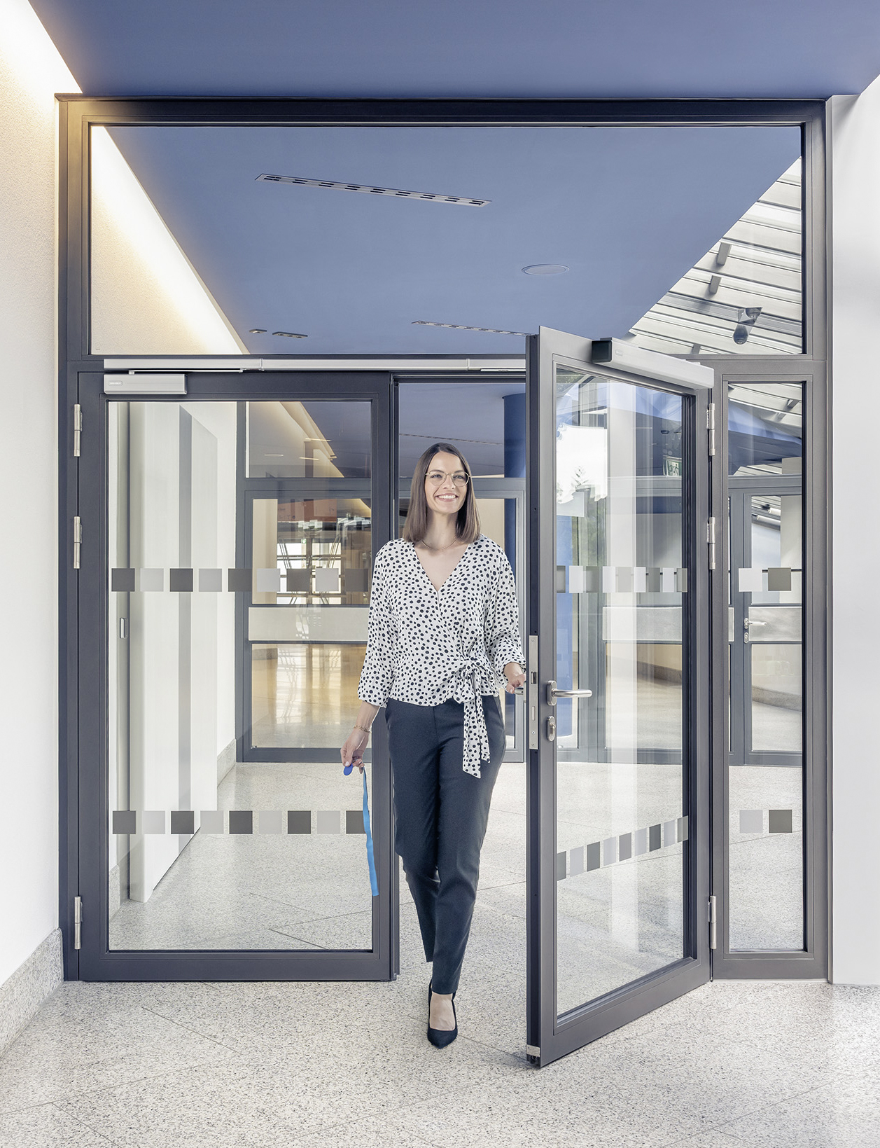 Energiesparend: Bei Automatiktüren passt die innovative KI-Lösung ASSA ABLOY ecoLOGIC die Türgeschwindigkeit und Offenhaltezeit im laufenden Türbetrieb an Außentemperatur und Personenaufkommen an