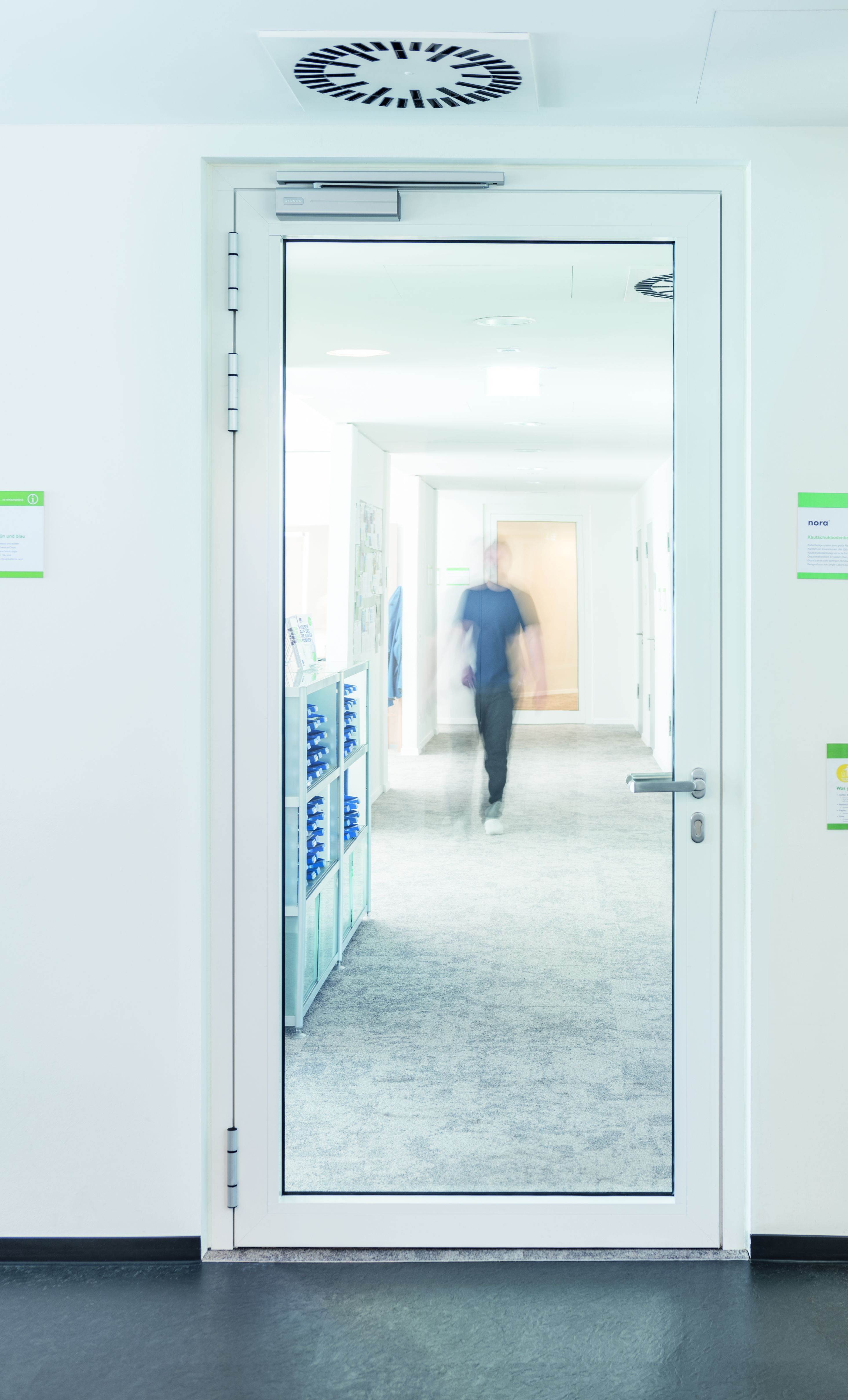Mit der aufgeklebten Absenkdichtung Planet KG-S schmal ist effizienter Schallschutz auch bei modernen Ganzglastüren möglich – farblich passend zum restlichen Design und unabhängig von der Glasdicke.