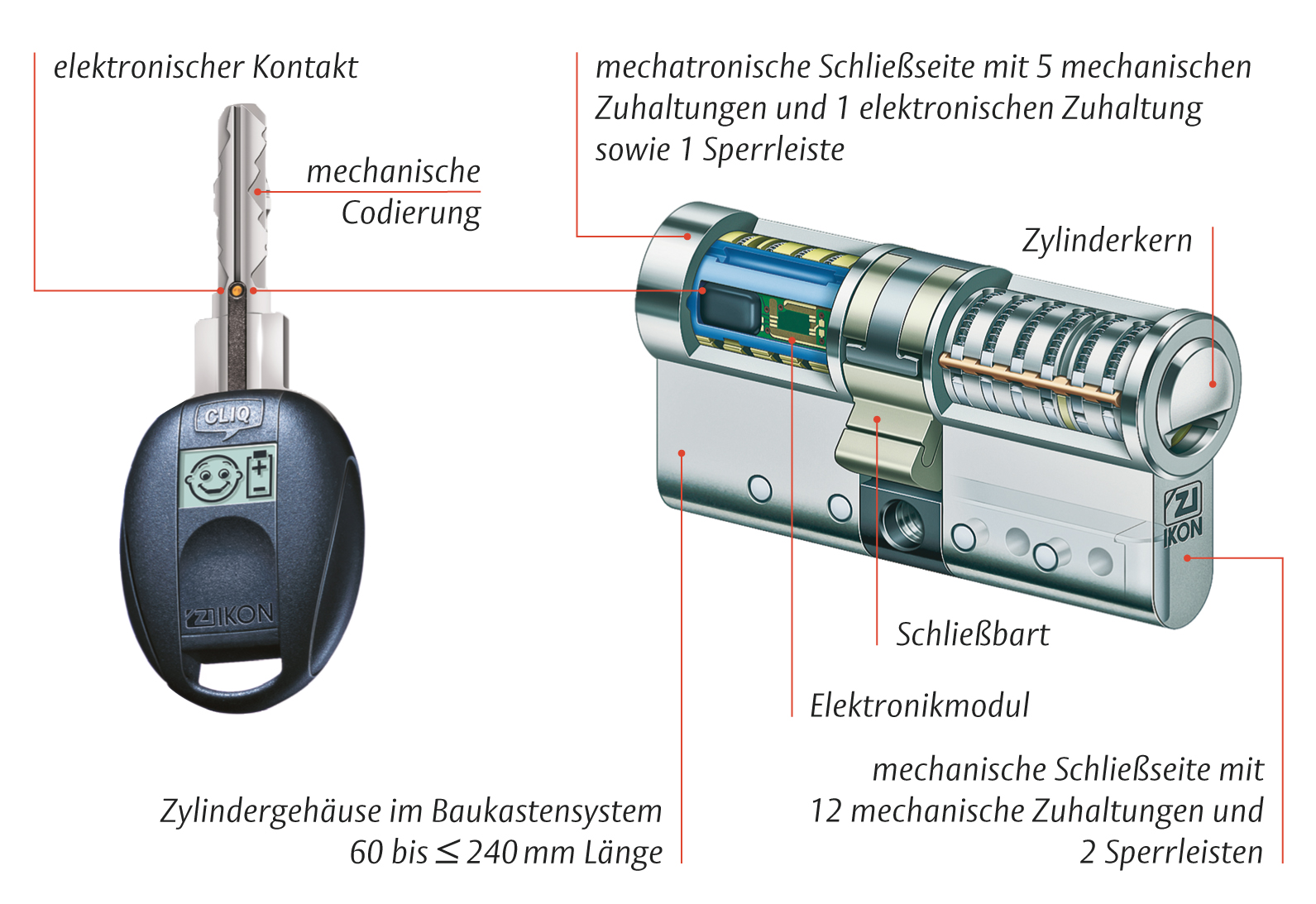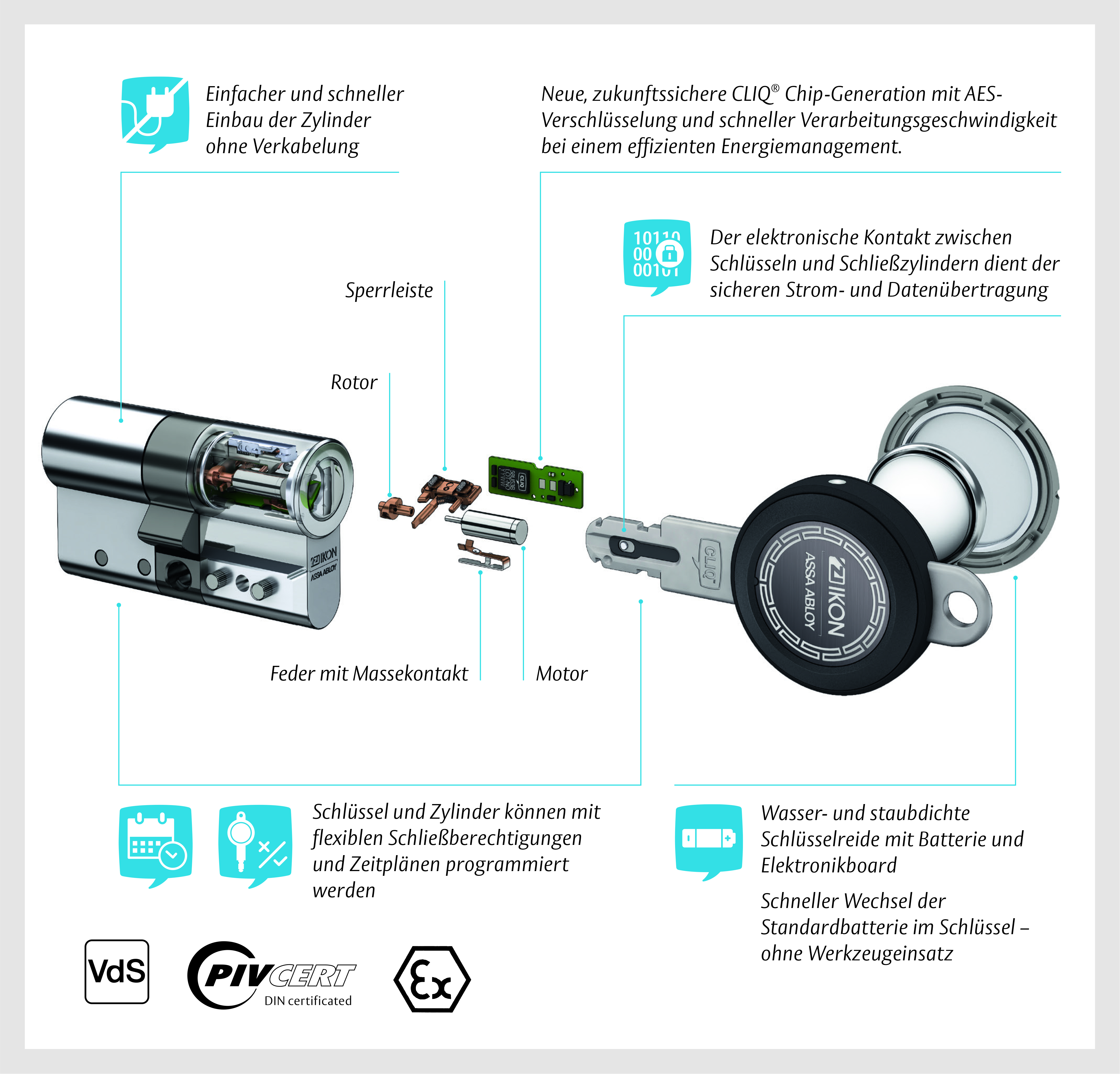 Der +CLIQ-Schlüssel vereint bewährte Mechanik und innovative Elektronik. Die neuartige +CLIQ-Technologie basiert auf dem Knowhow und der jahrzehntelangen Erfahrung eines Marktführers: IKON – der Traditionsmarke von ASSA ABLOY Sicherheitstechnik GmbH