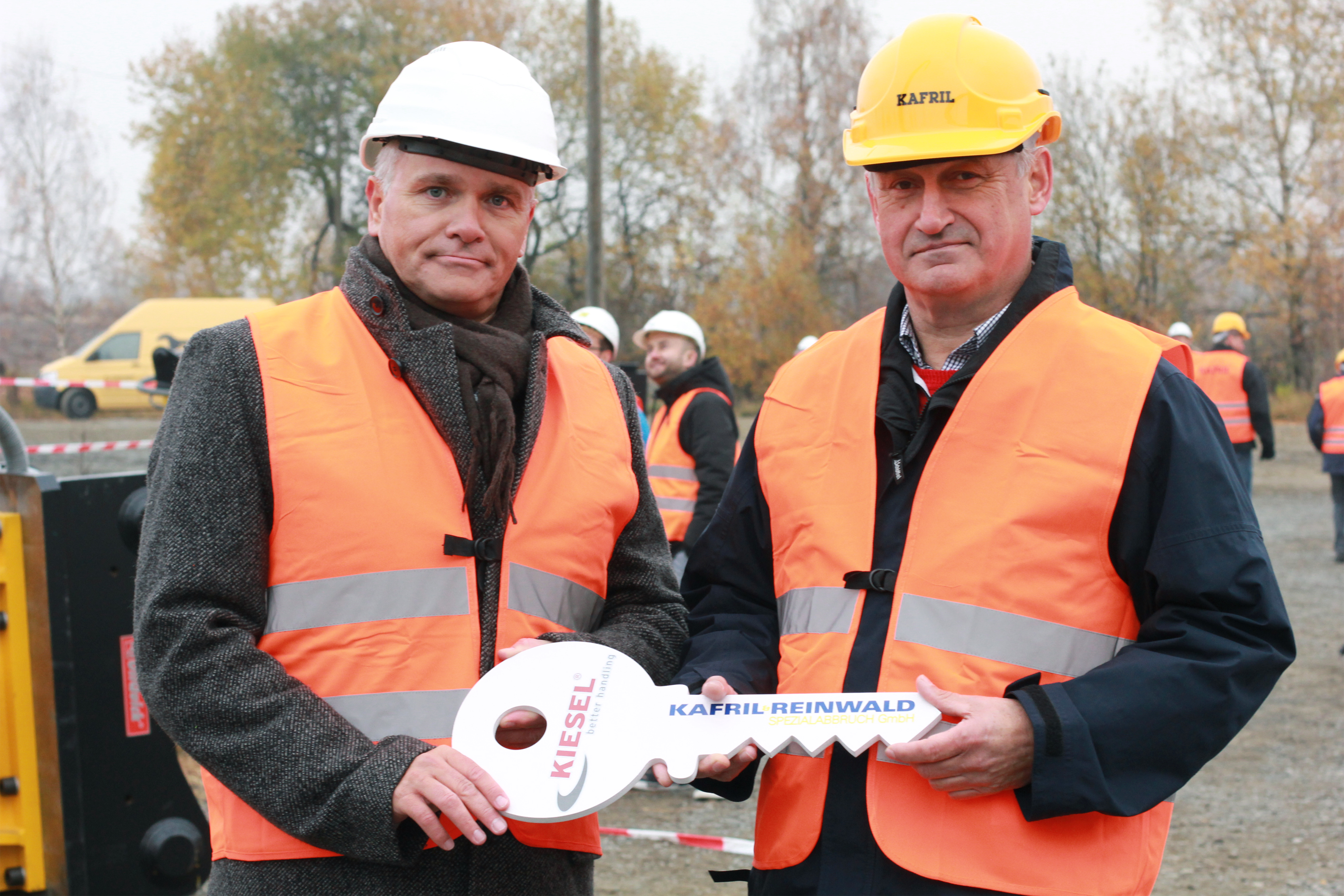 v.l.n.r. Torsten Treger, Gebietsverkaufsleiter Nord, Epiroc, Björn Bassen, Prokurist und Oberbauleiter, Regrata, Cedric Alexander Drewenstedt, Baumaschinenführer Regrata, bei der Übergabe des HB 5800 von Epiroc