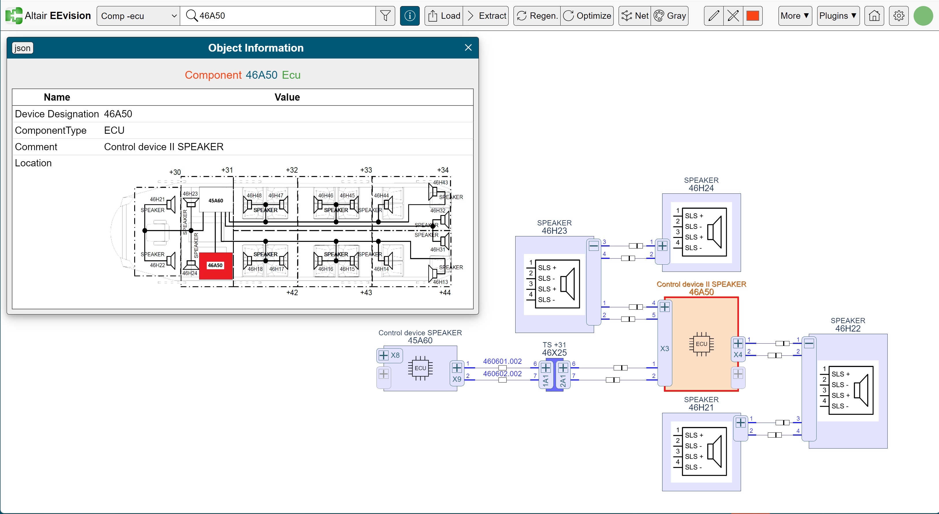 Database for the EDS Design Center: harness architecture defined in Engineering Base with components and inline connection points / Image: AUCOTEC AG