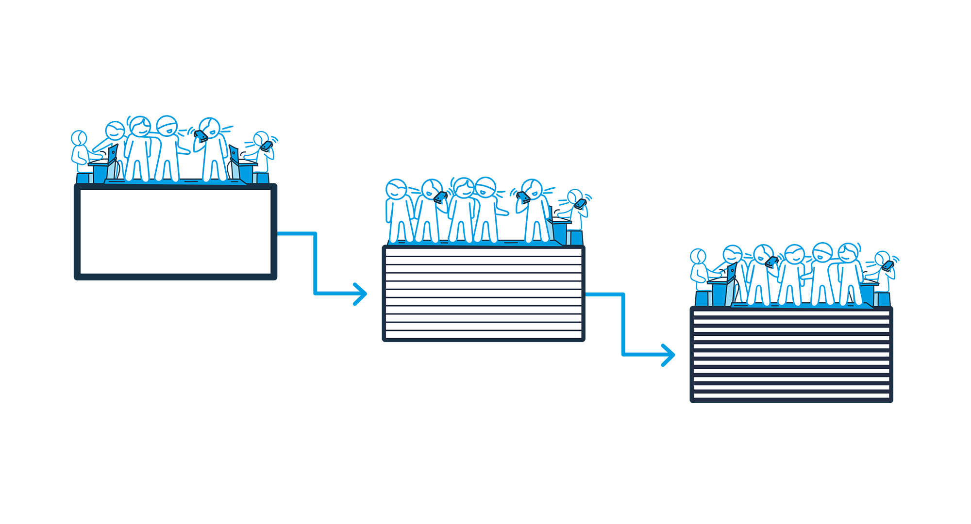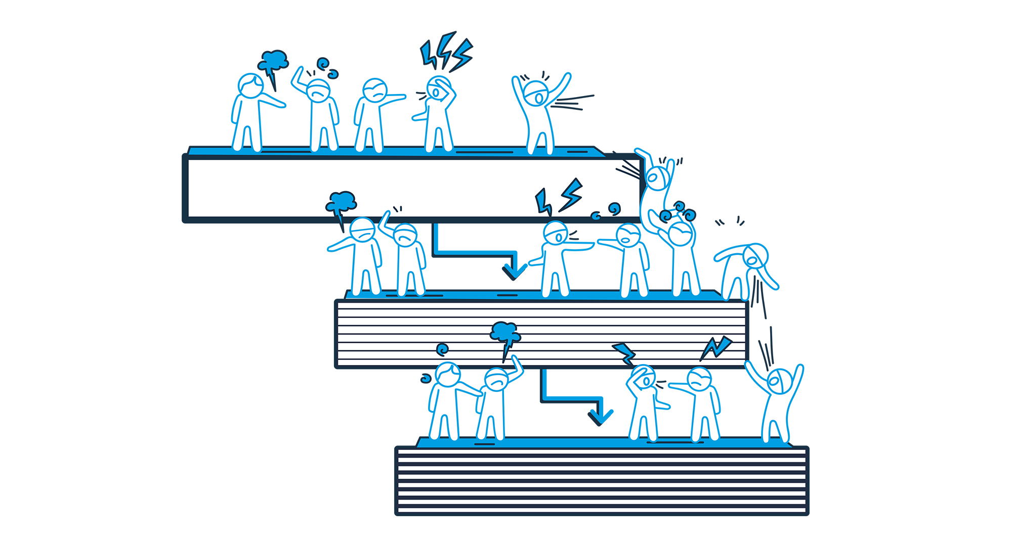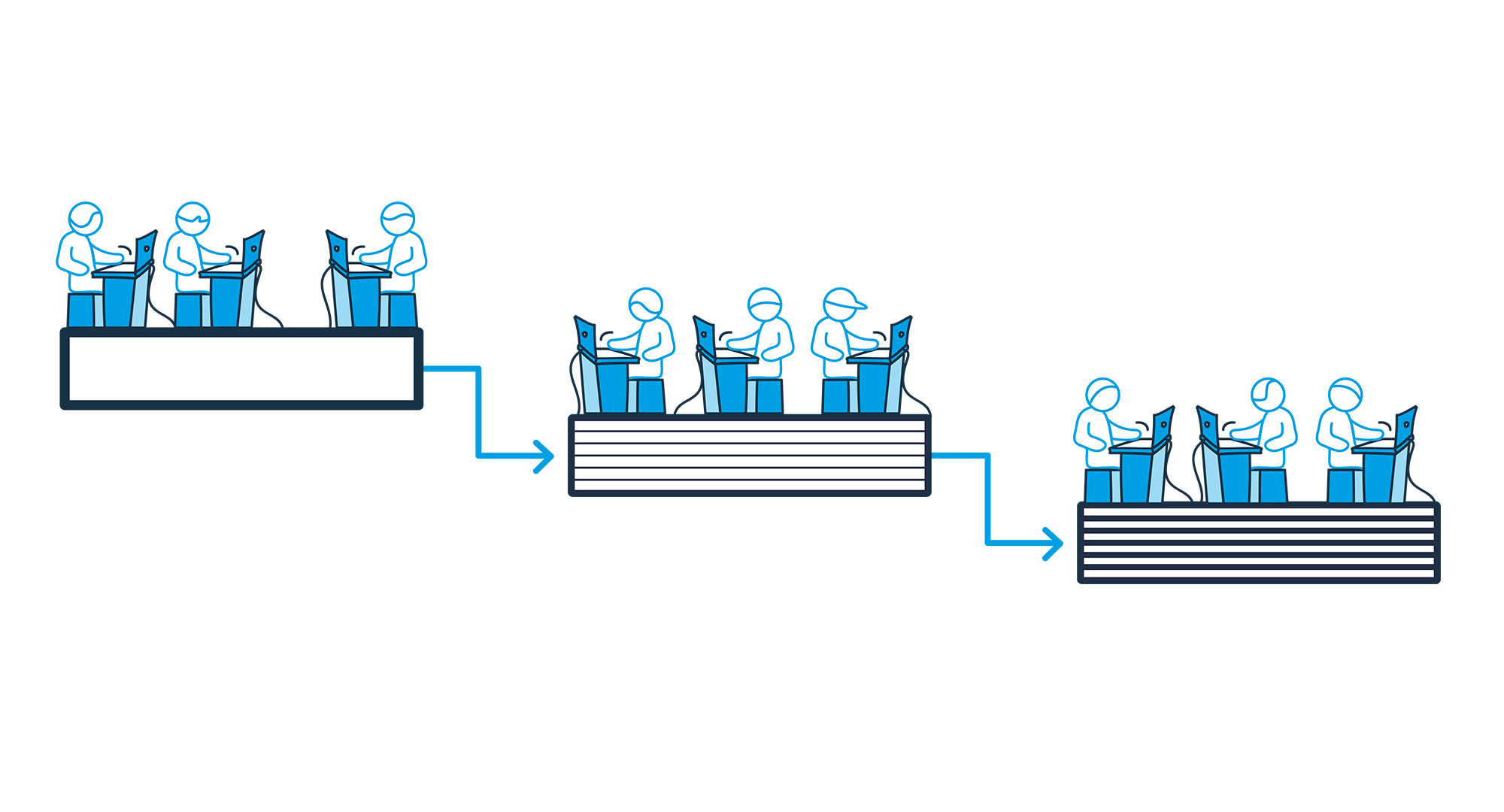 „Den“ Wasserfall-Prozess gibt es schon lange nicht mehr. Kein Planer kann so lange warten, bis der vorherige Projektschritt ganz abgeschlossen ist. Also fängt er ohne die Ergebnisse der Nachbar-Disziplin in seinem Tool an. Ebenso verfahren die anderen Fachbereiche. Das erfordert immer wieder interdisziplinäre Abgleiche. Dazu kommen unvermeidlich Korrekturen von außen durch veränderte Kundenwünsche oder Rahmenbedingungen, mit Auswirkungen auf alle Disziplinen. So entsteht ein langwieriger, fehleranfälliger Kreislauf von Änderungs-Übertragungen. Noch komplizierter wird es bei parallelen „Wasserfällen“, wobei die neue Version eines freigegebenen Prozessschritts bearbeitet wird, während andere noch auf Basis einer früheren Freigabe weiterentwickeln.