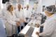 Während eines Rundgangs durch die Ampullenfertigung erläuterten die Leiter der jeweiligen Abteilungen die einzelnen Produktionsschritte: Frank Winckler, Dr. Sven Krohn und Martin Wilke gaben Einblicke in die verschiedenen Stationen von Einwaage und Ansatz der Lösungen über die Abfüllung und Sterilisation bis zur Verpackung der Ampullen. Die Senatorin interessierte sich dabei insbesondere für die Themen Ausbildung, Digitalisierung und Industrie 4.0.