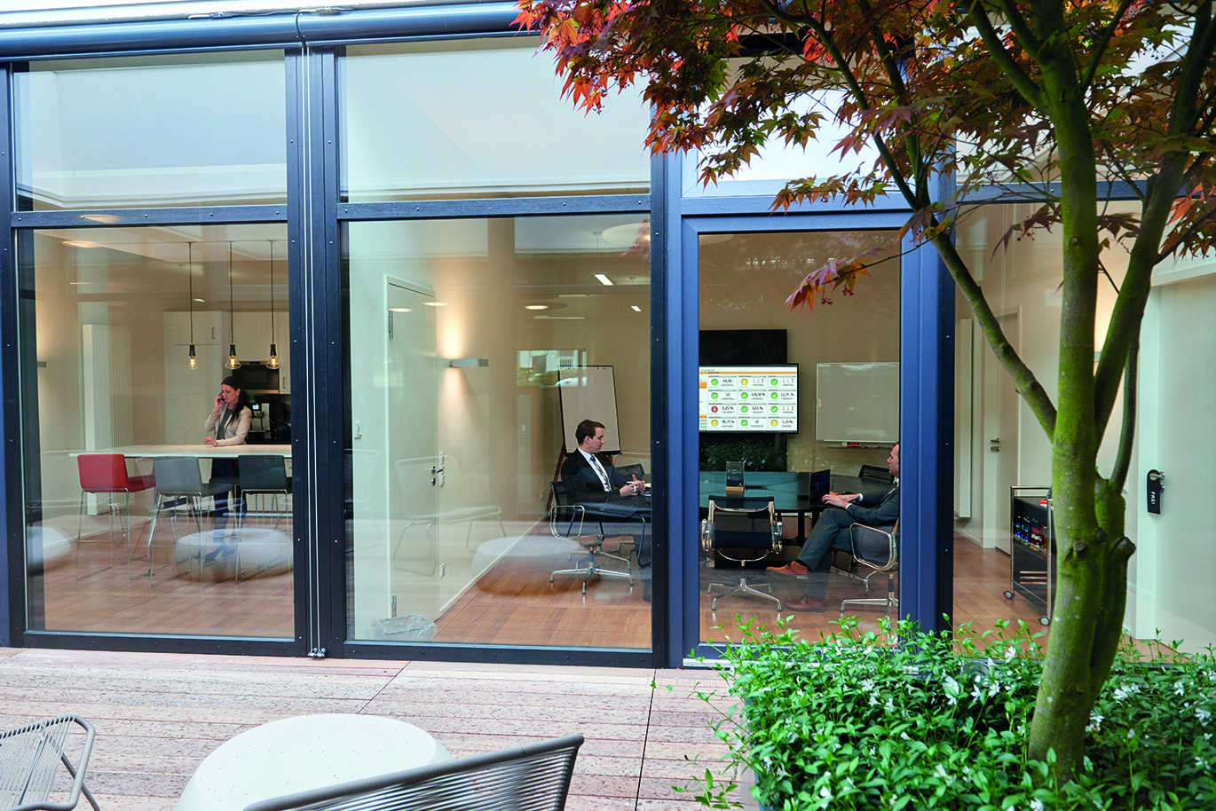 Viel Glas und ein lichtdurchflutetes Atrium schaffen eine offene Arbeitsatmosphäre für die Mitarbeiter