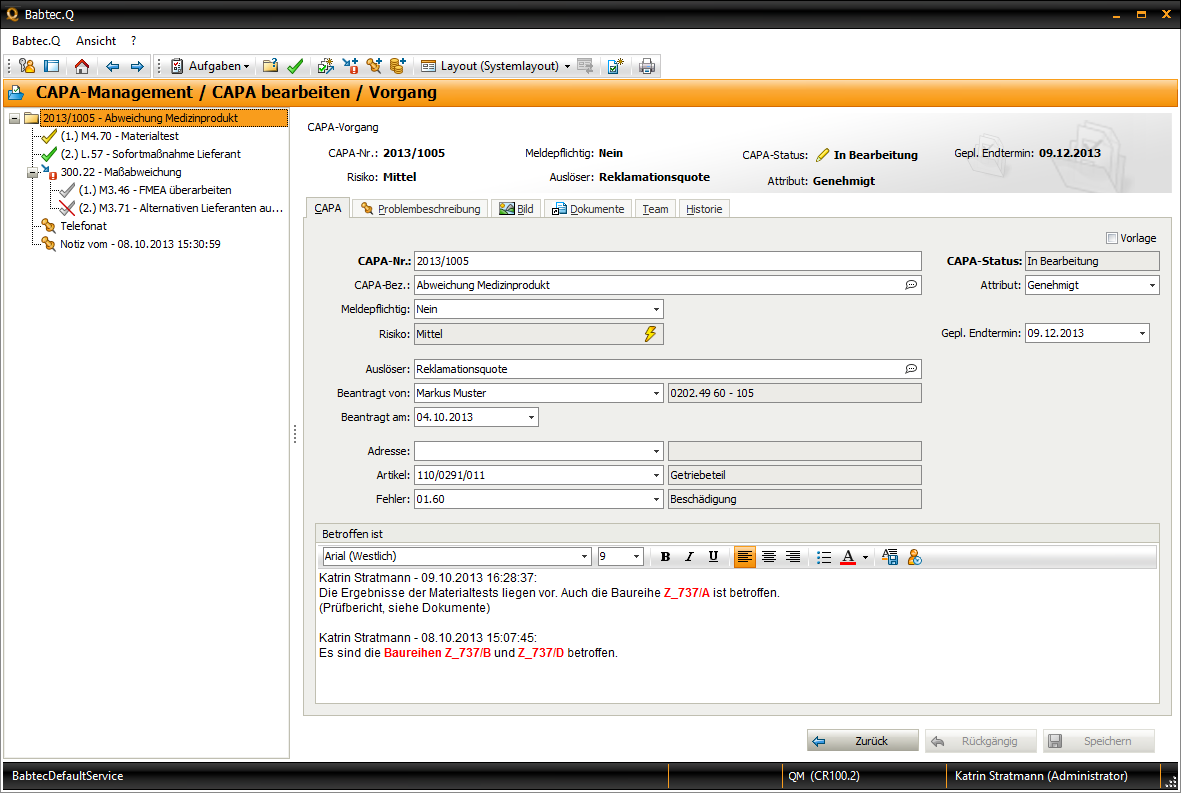 Bearbeitung und Dokumentation eines CAPA-Vorgangs in der QM-Software Babtec.Q.