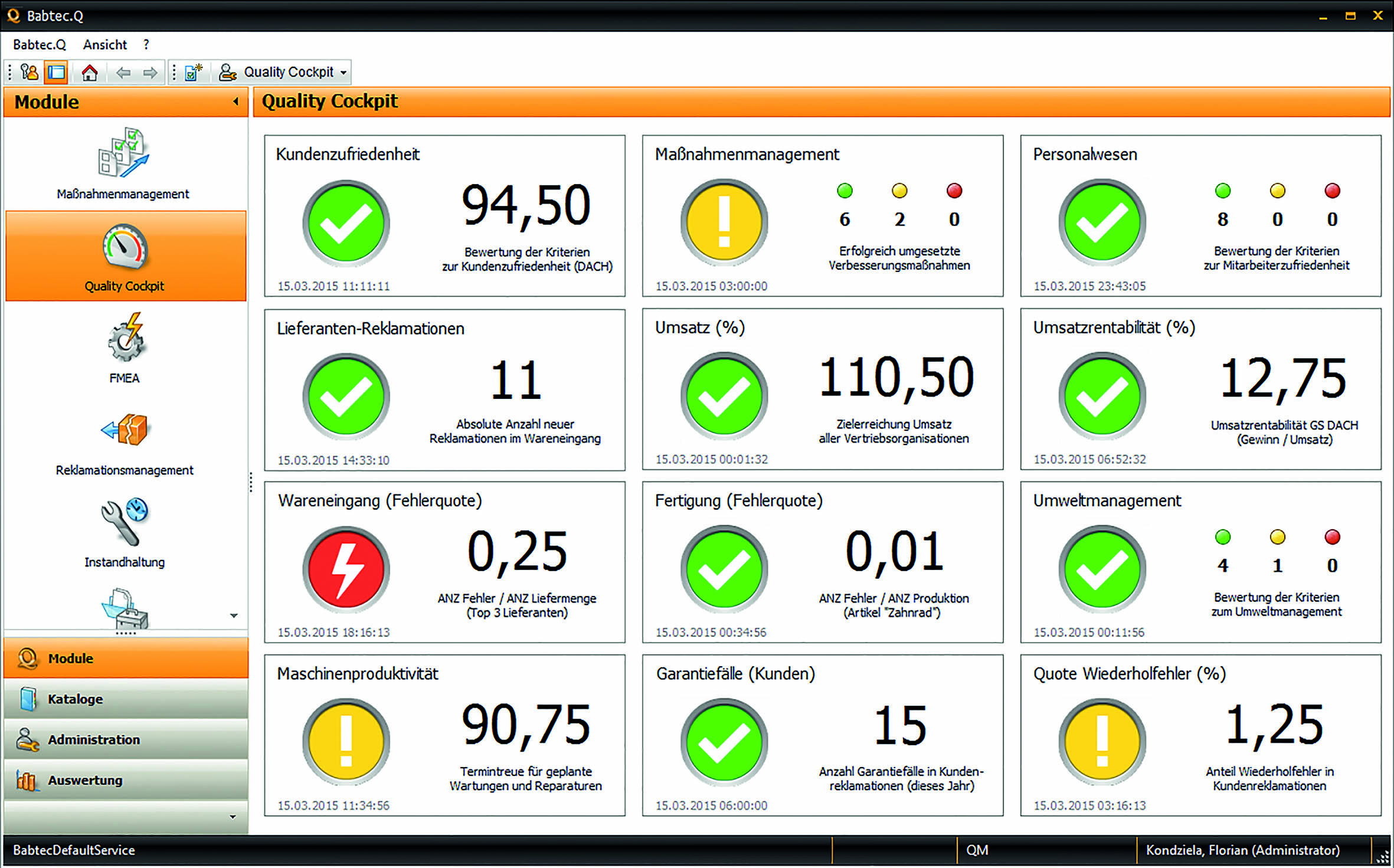 Das Quality Cockpit von Babtec liefert die wichtigsten Kennzahlen mit eindeutigem Ampelstatus direkt auf den Bildschirm.