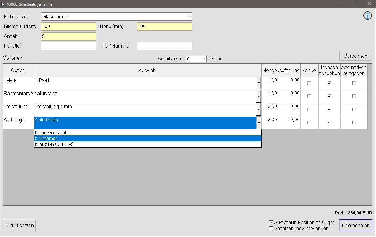 Beispiel Auswahlmaske für die Herstellung nach kundendefinierten Bilderrahmen für Kunstobjekte.
