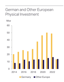 Bemerkenswert ist, dass der Silbermarkt speziell in Deutschland seit Ende 2022 einen extremen Rückgang der Nachfrage verzeichnet, obwohl das weltweite Silberangebot laut dem Silver Survey 2024 auch im vergangenen Jahr deutlich hinter der Nachfrage zurückgeblieben ist.