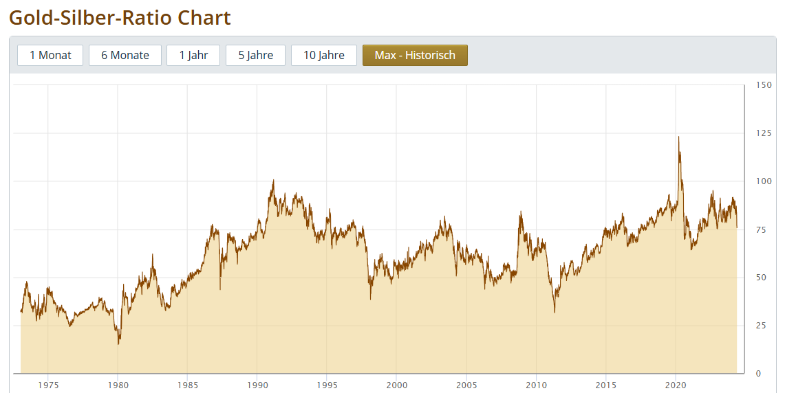 Die Gold-Silber-Ratio war im Vorjahr aber auch im Jahr 2024 längere Zeit deutlich über 80 und fällt seit Anfang des Jahres 2024 tendenziell. Ganz aktuell im Mai 2024 ist sie besonders stark gesunken auf derzeit etwa 76.