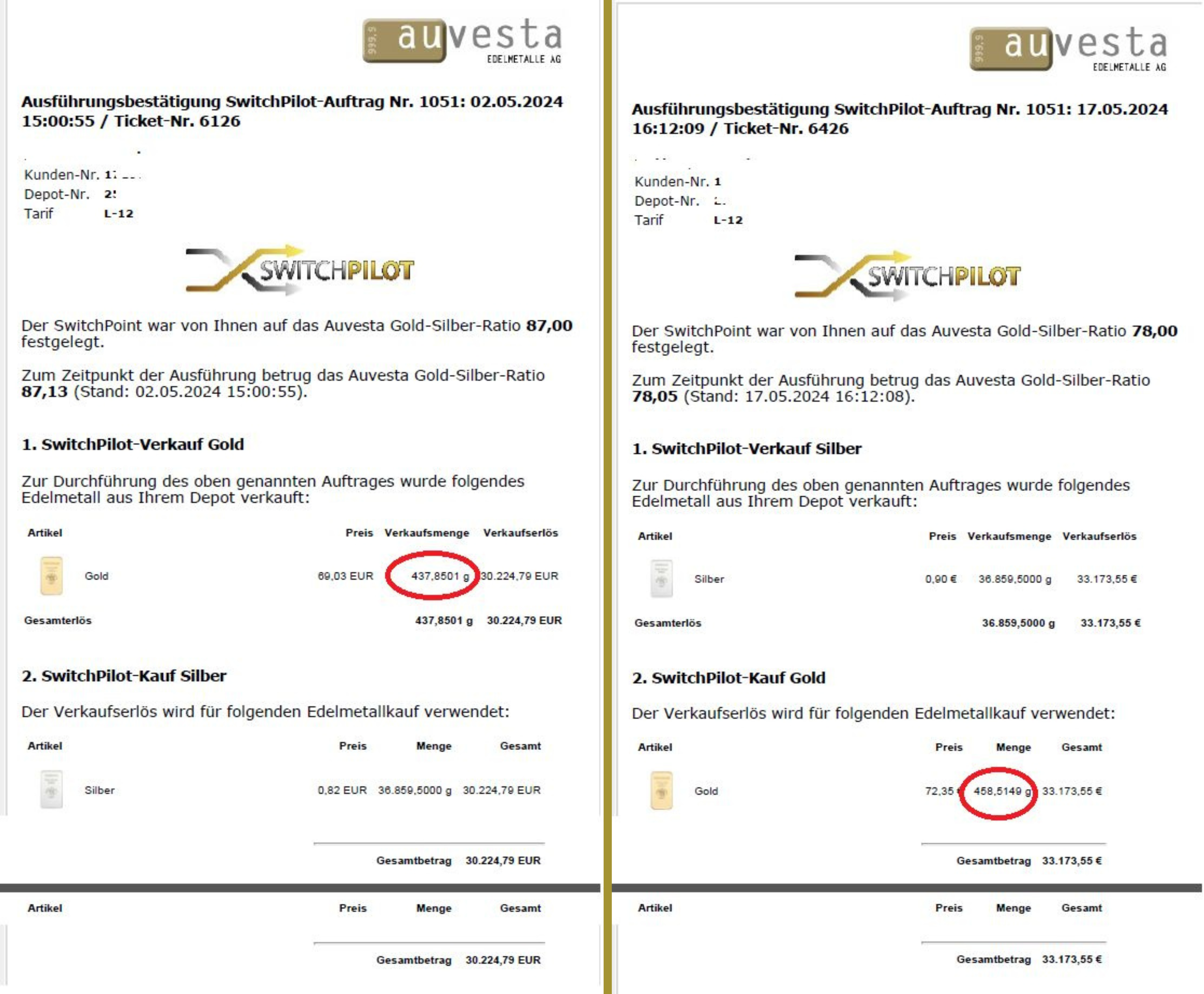 Ein ausführliches Beispiel, wie ein weiterer Goldkäufer eine Zusatz-Rendite von 13.490 Euro aufbauen konnte, wurde im Presseartikel vom 24.05.2024 gezeigt.