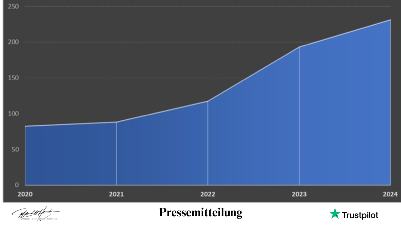 Die Quelle (Grafik in der Beschreibung) „Solarindustrie treibt Silberverbrauch an“, zeigt eindrucksvoll den permanenten Anstieg des weltweiten Silberverbrauchs allein im Solarbereich. Eine Verdreifachung der Nachfrage ist seit 2020 zu erkennen, von 40 Mio. Silberunzen auf ganze 240 Mio. Silberunzen.
