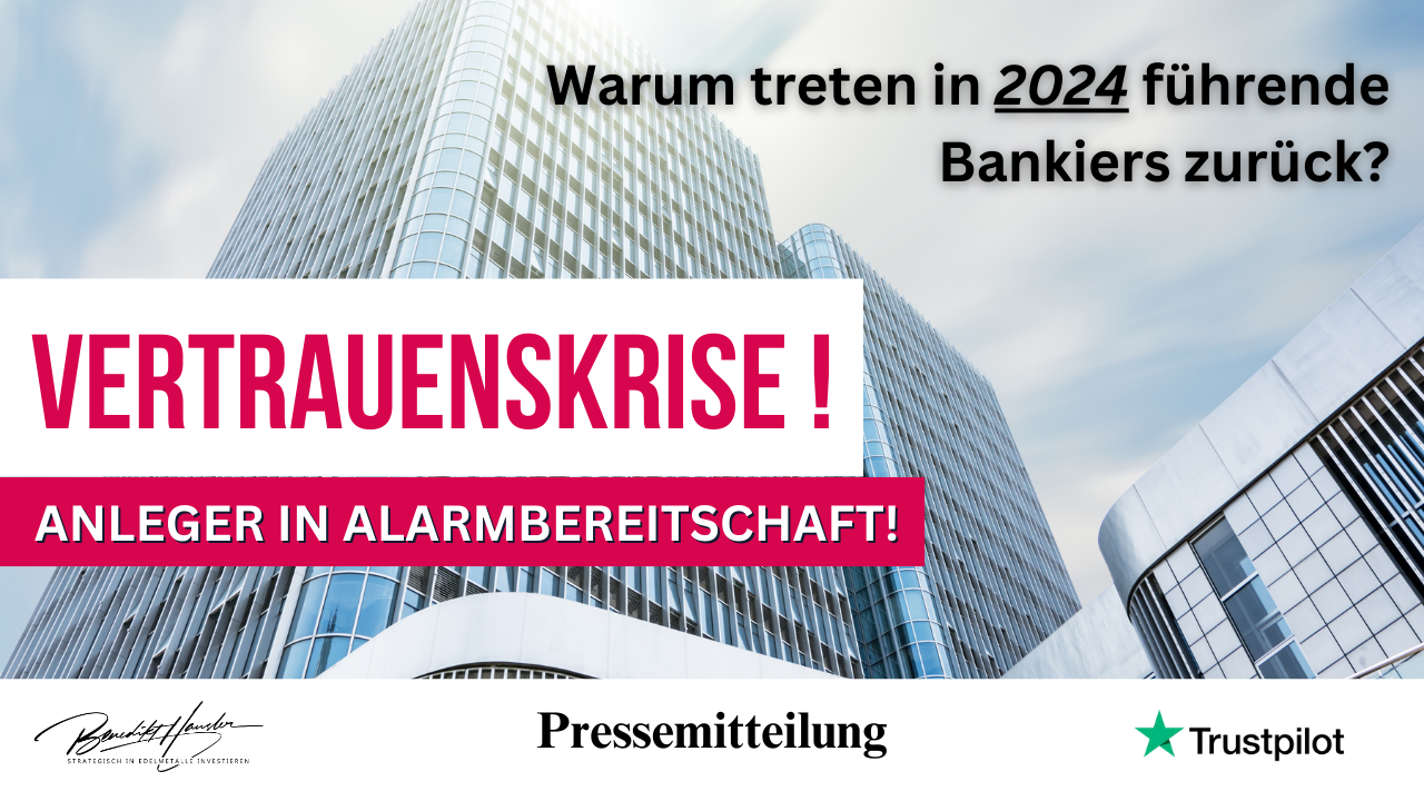 (pressebox) (München, 19.11.2024) In einer hochbrisanten Ausgabe der GoldShow diskutierten Edelmetallexperte Benedikt Hausler und der renommierte Schweizer Bankier Rüdiger Götz die alarmierenden Entwicklungen im Bankensektor. Die überraschenden Rücktritte führender Bankchefs, darunter der von Thomas Jordan, dem Chef der Schweizer Nationalbank, werfen ein düsteres Licht auf die Stabilität der Finanzwelt und verunsichern Anleger weltweit. „Diese Rücktritte lassen auf tiefgreifende Probleme schließen,“ erklärt Hausler besorgt. „Wenn Insider ihre Posten verlassen, kann dies ein Signal sein, dass ein ernsthaftes Bankenbeben bevorsteht.“