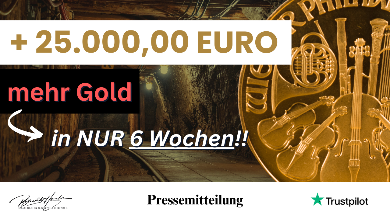 (pressebox) (München, 27.11.2024) In einem beeindruckenden Fallstudien-Beispiel hat ein Kunde von Benedikt Hausler und seinem strategischen Edelmetallpartner, dem Schweizer Bankier Rüdiger Götz, innerhalb von nur sechs Wochen einen enormen Vermögenszuwachs erzielt. Durch die gezielte Anwendung der Gold-Silber-Ratio-Strategie konnte der Kunde 25.000 € mehr in physischem Gold in seinem Depot verzeichnen – und das ohne zusätzlichen Aufwand.