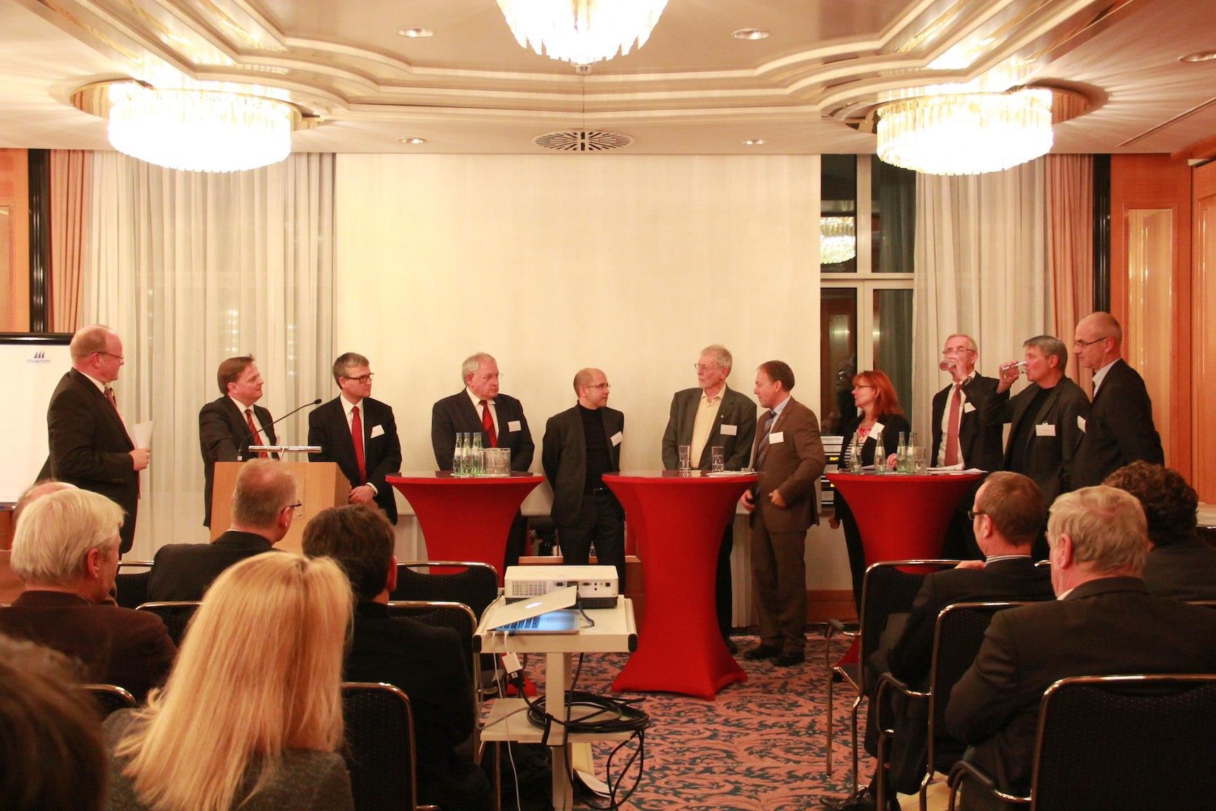 Landtagsabgeordnete und Vertreter regionaler Life Sciences Cluster diskutierten mit Unternehmern und Forschern über die wirtschaftlichen Perspektiven der Biotechnologie und Life Sciences in Baden-Württemberg. v.l.n.r: Dr. Ralf Kindervater, Claus Paal, MdL, Dr. Klaus Eichenberg, Dr. Gerhardt Vogel, Dr. Christian Tidona, Prof. Klaus Schäfer, Hans-Peter Storz, MdL, Gabi Rolland, MdL, Dr. Bernd Dallmann, Martin Rivoir, MdL und Walter Pytlik