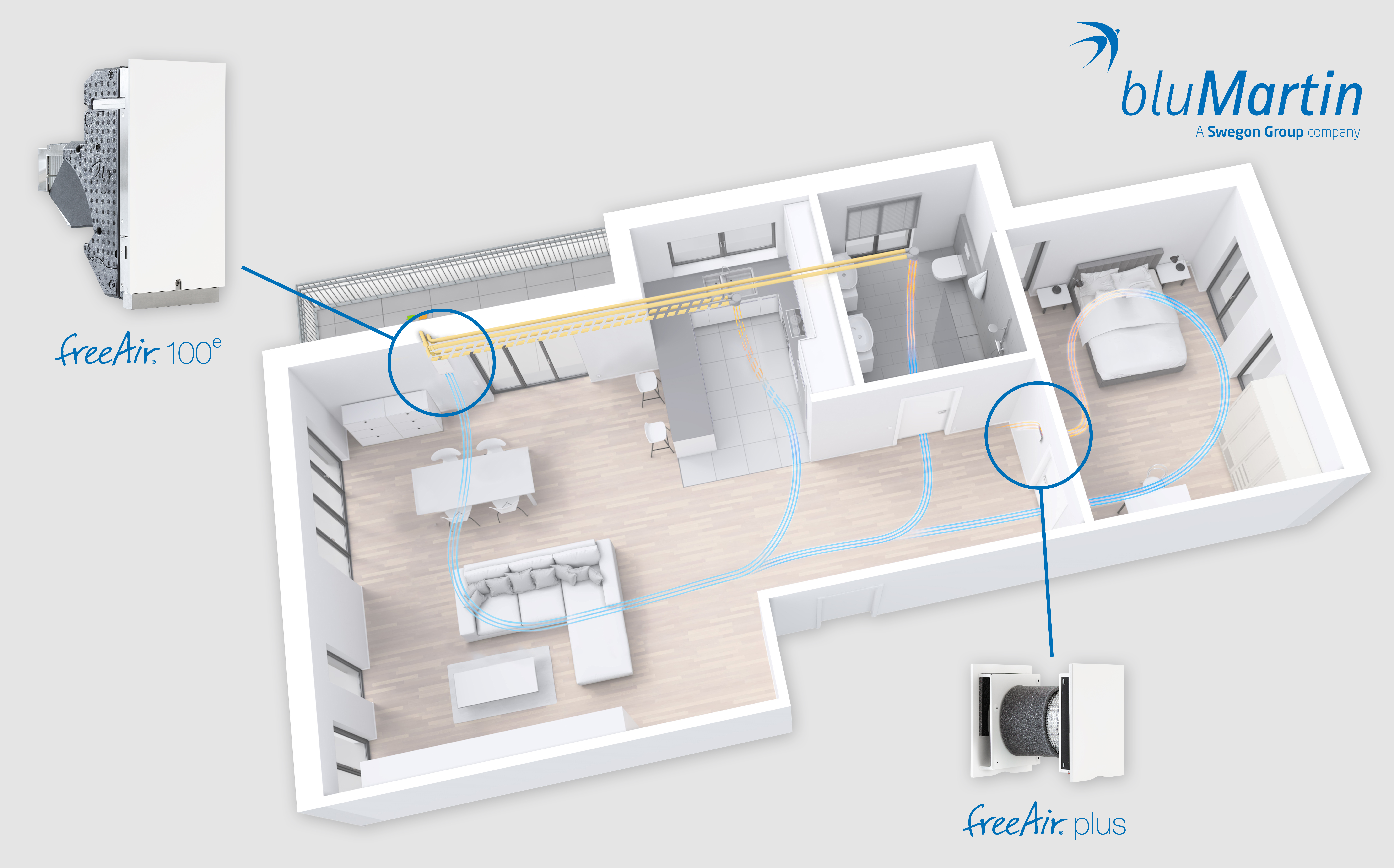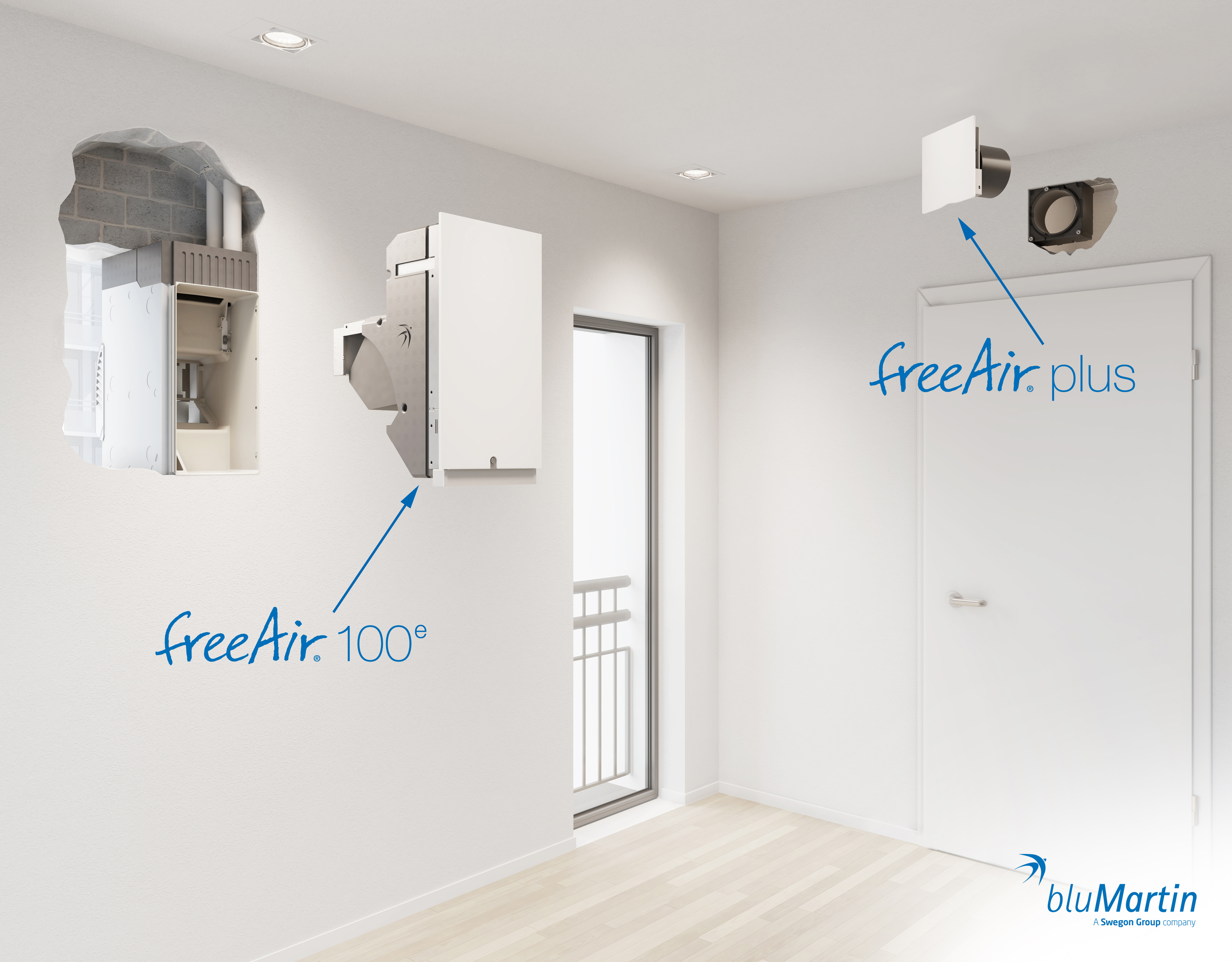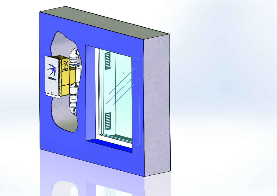 Das wohnungszentrale Lüftungssystem freeAir von bluMartin besteht aus dem Außenwand-Lüftungsgerät freeAir 100 und dem intelligenten aktiven Überströmer freeAir plus. Unter www.bluMartin.de/BIM können die Revit-Dateien zum System angefordert werden / Bildquelle: bluMartin GmbH