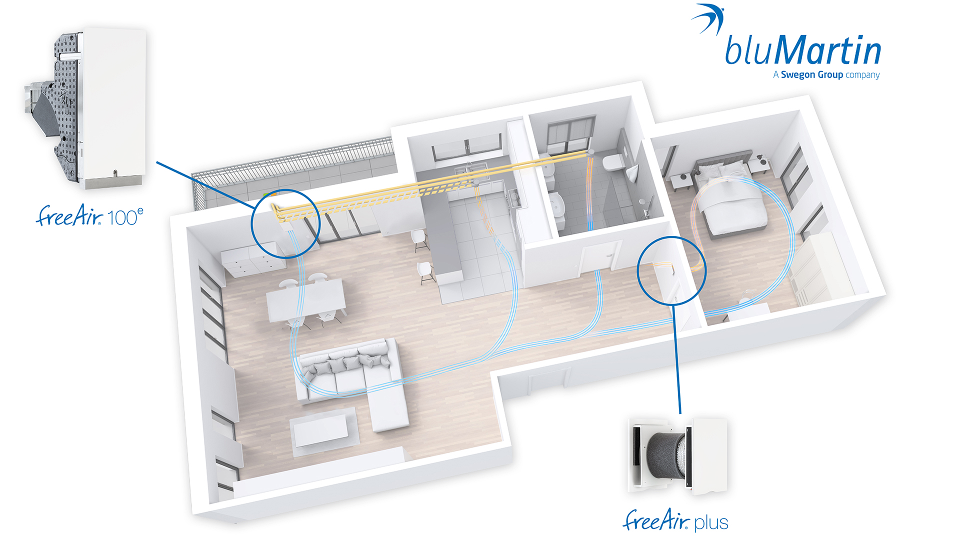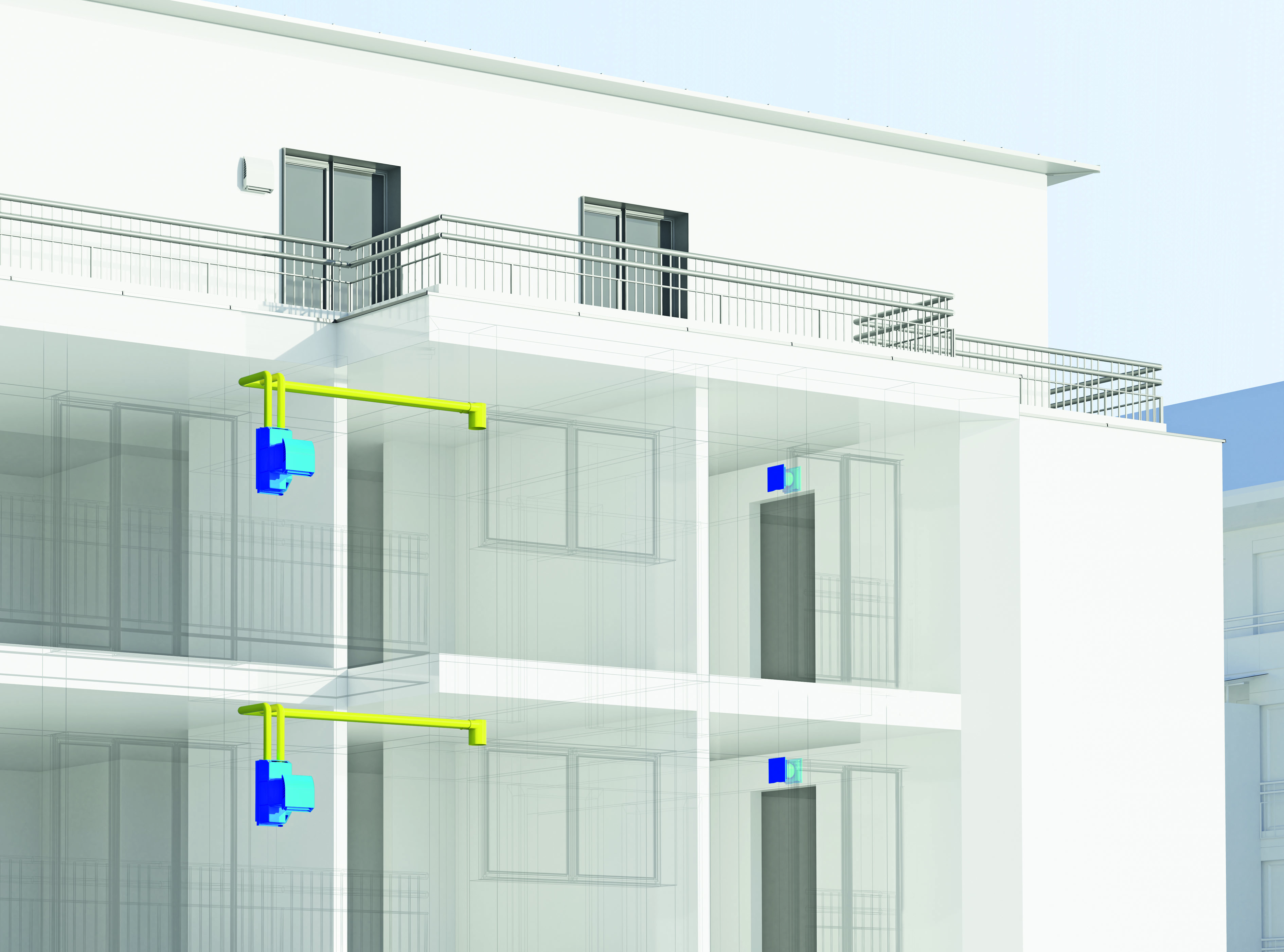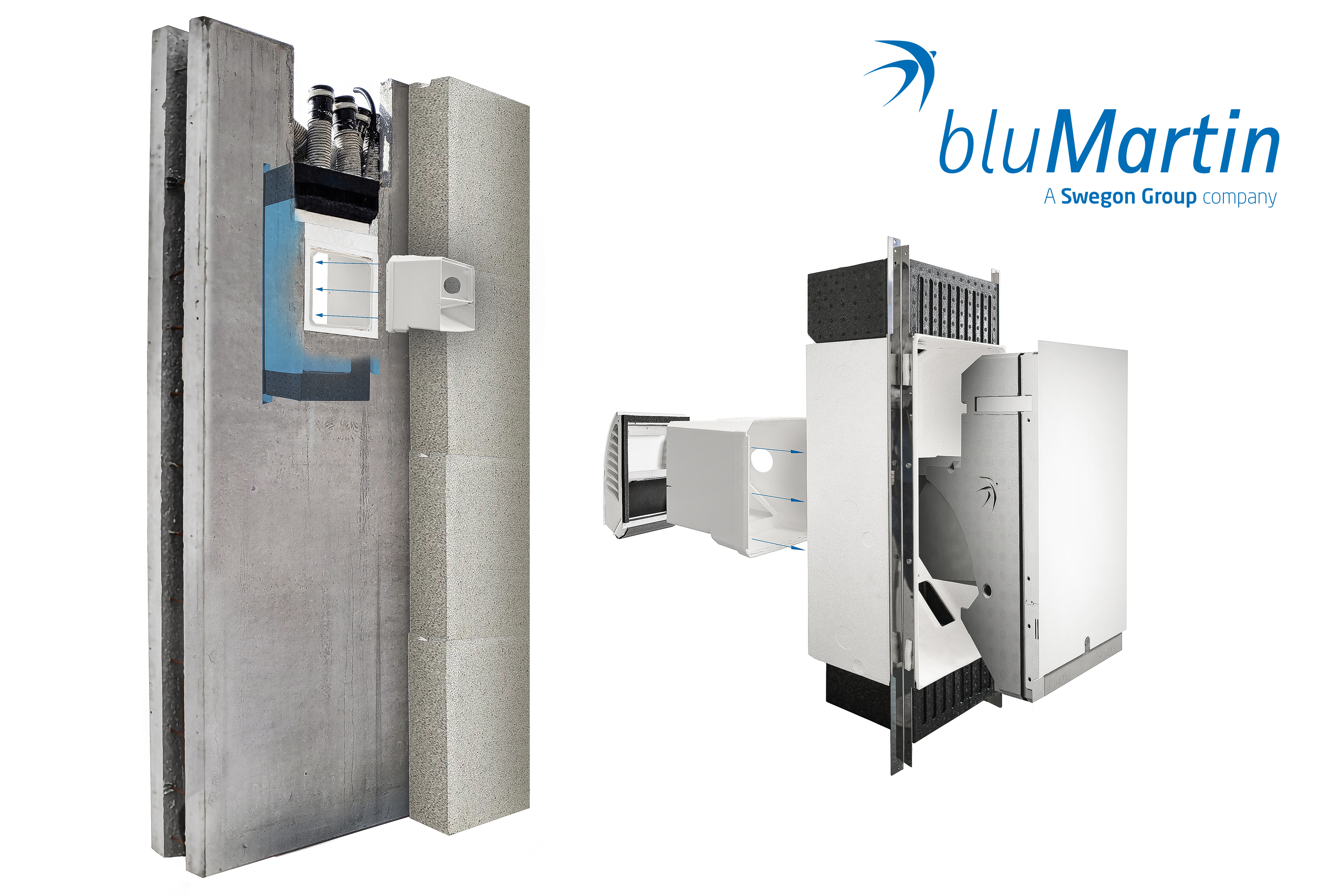Das wohnungszentrale Lüftungssystem freeAir von bluMartin besteht aus dem Außenwand-Lüftungsgerät freeAir 100 und dem intelligenten aktiven Überströmer freeAir plus. Unter www.bluMartin.de/BIM können die Revit-Dateien zum System angefordert werden / Bildquelle: bluMartin GmbH