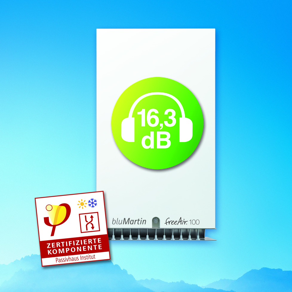 Lüftung im Teamwork: Das Außenwand-Lüftungsgerät freeAir 100 und der neu entwickelte intelligente aktive Überströmer freeAir plus von bluMartin ermöglichen effiziente Lüftungslösungen.