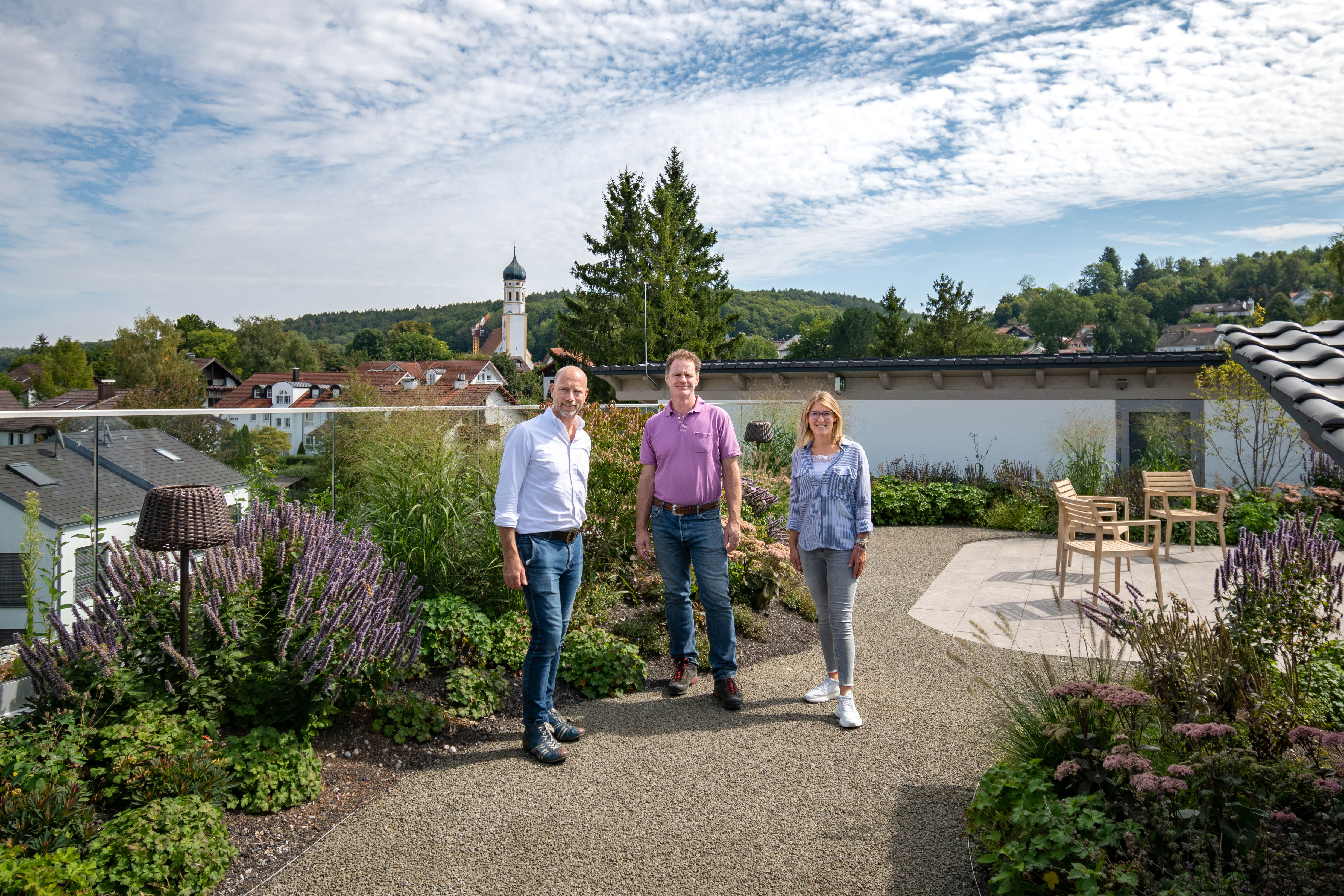 Ulf Walliczek, Rasso Rebay von Ehrenwiesen und Lena Volk (von links) auf dem Dachgarten des SeniorenQuartiers Pilsensee / Bild: bluMartin GmbH