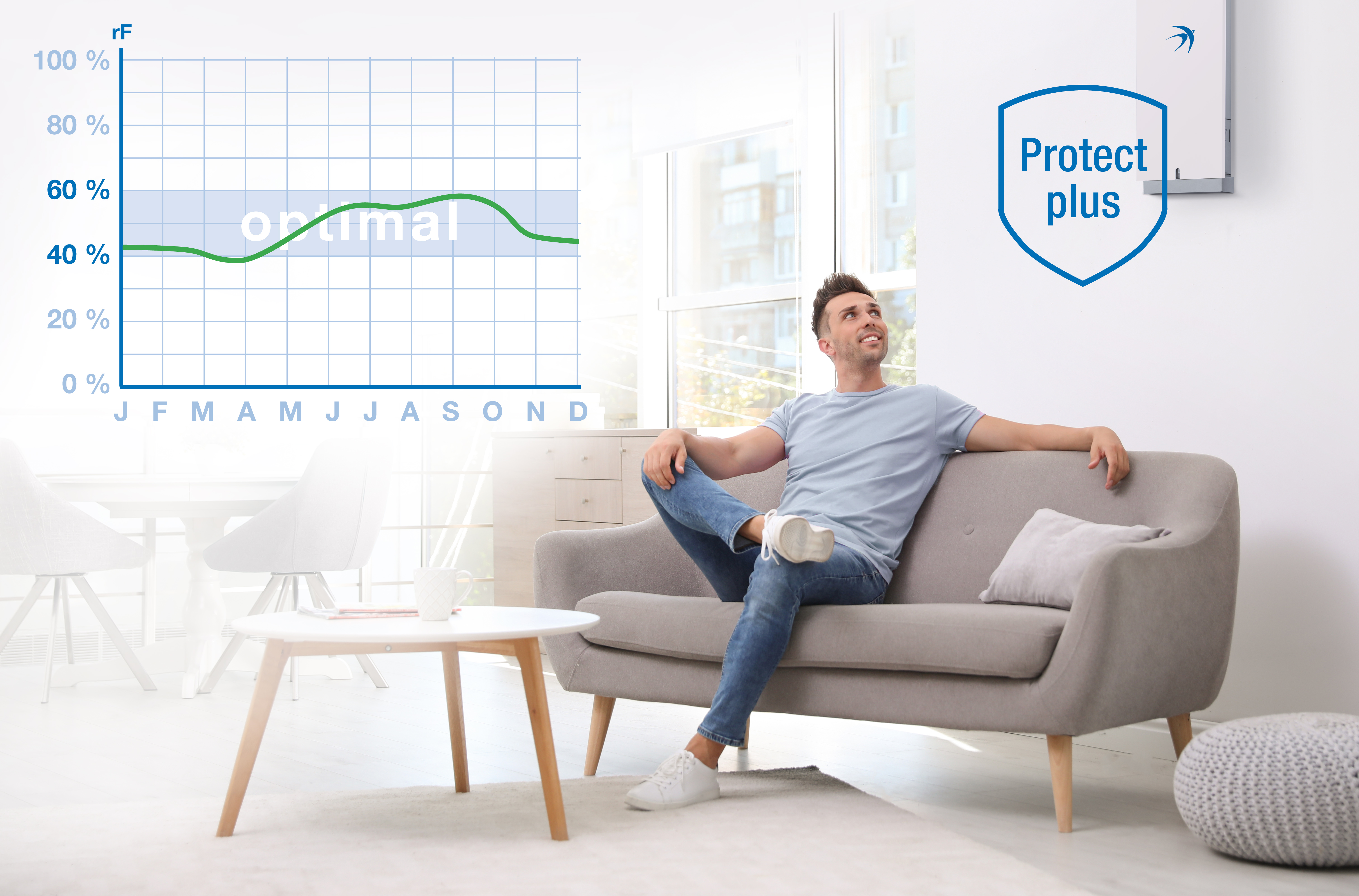 Messungen zeigen, dass sich die Luftfeuchtigkeit dank des intelligenten Feuchtemanagements des Lüftungsgeräts freeAir 100 im gesundheitlich optimalen Bereich zwischen 40-60 Prozent bewegt. Innovative Zwei-Stufen-Filter schützen vor Feinstaub, Pollen und Insekten / Bildquelle: bluMartin GmbH