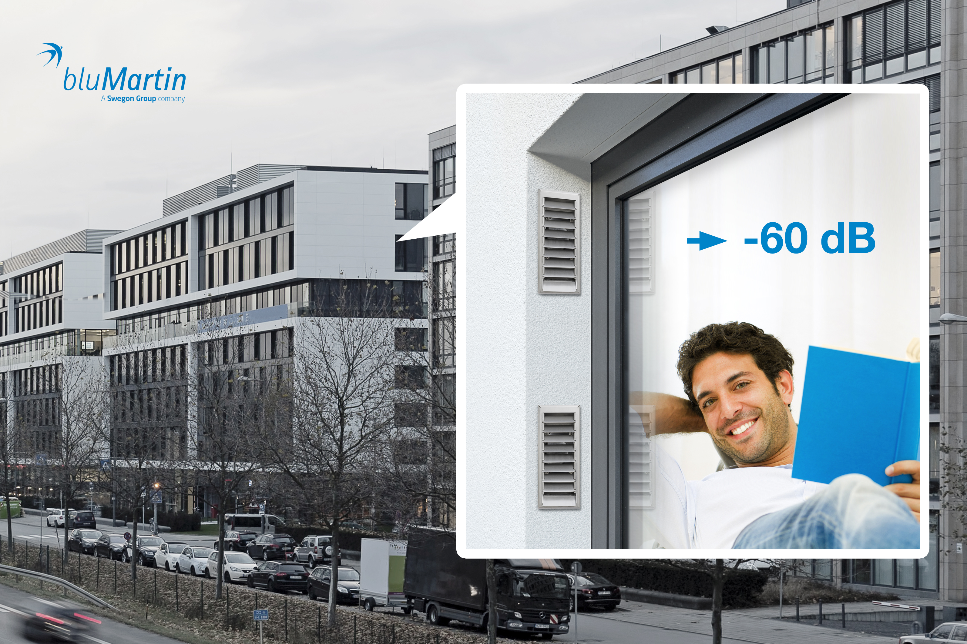 Die optimierte Laibungslösung des freeAir-Lüftungssystems sorgt für eine fließende Fassa-denoptik und erhöht in Kombination mit dem Premium Cover den Schalldämmwert der Lüf-tung auf 60 dB
