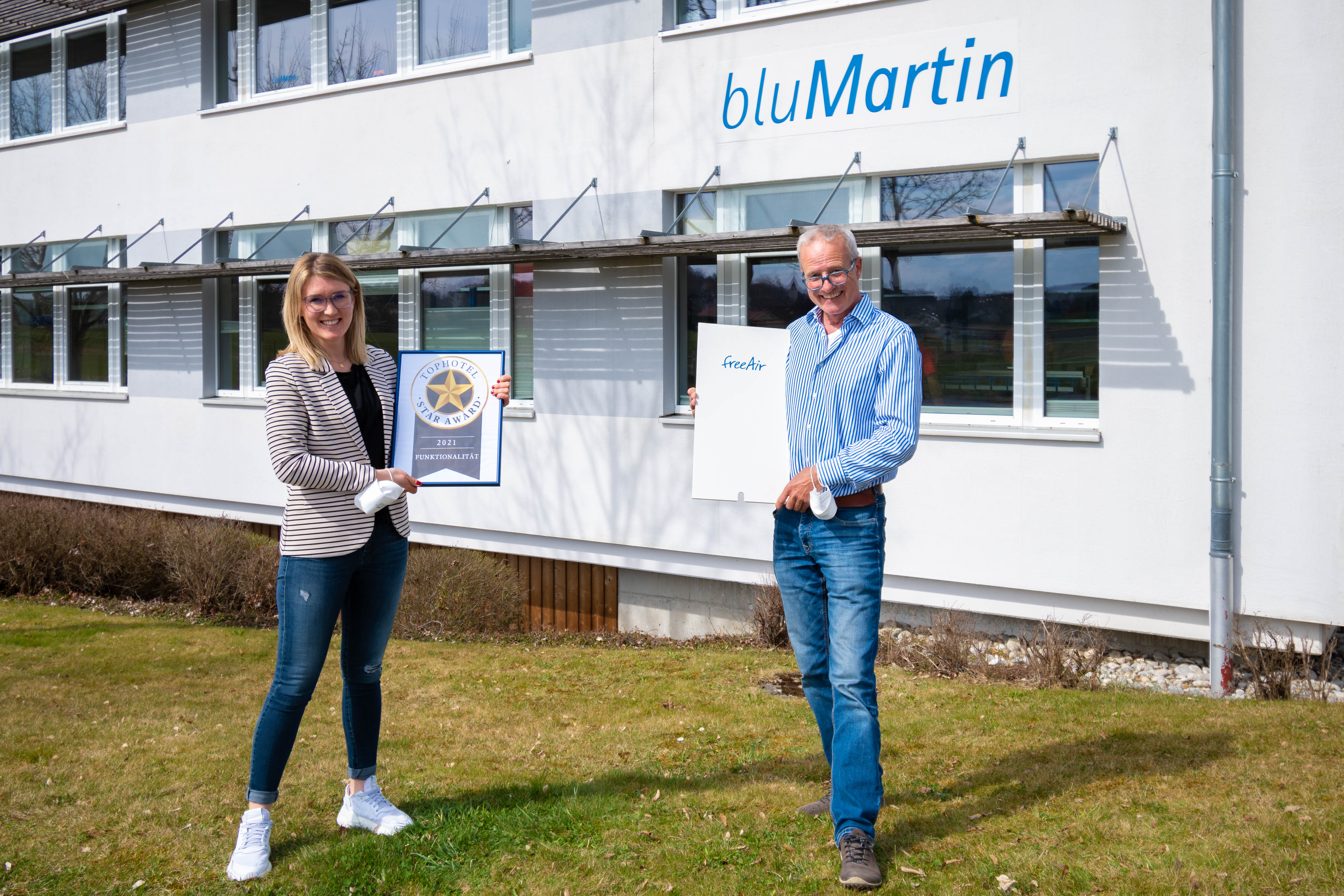 Bernhard Martin und Lena Volk freuen sich über den Tophotel Star Award für das freeAir Lüftungssystem