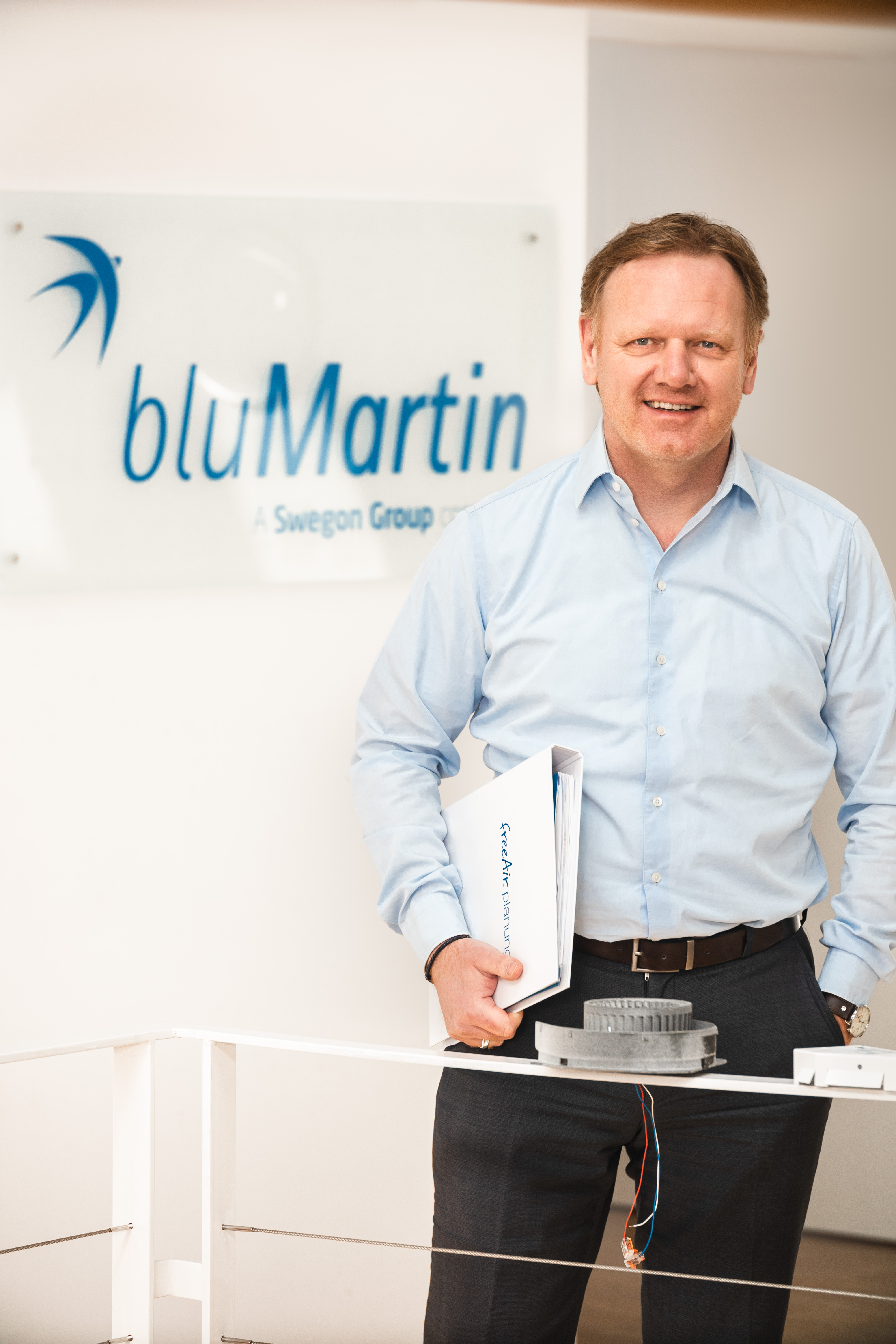 Zum Einstand überreichen die Gesellschafter der bluMartin GmbH Elke Martin, Thomas Schally und Bernhard Martin den neu entwickelten intelligenten aktiven Überströmer freeAir plus an Gustaf Ahlenius, Leiter der Unternehmensentwicklung bei Swegon