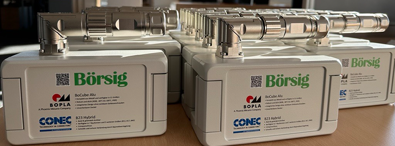 Bocube-ALU-Gehäuse von Bopla mit montierten Hybrid-Steckverbindern von Conec