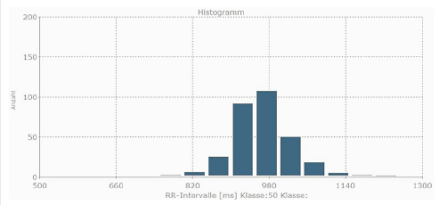 Abb. 2: b) Histogrammdesselben Probanden nach der Anwendung. Hier ist eine deutliche Verbesserung der Herzratenvariabilität zu erkennen. Eine geringe Streuung und große Häufigkeiten wie in a) deuten auf eine schlechte Herzratenvariabilität und damit auf e