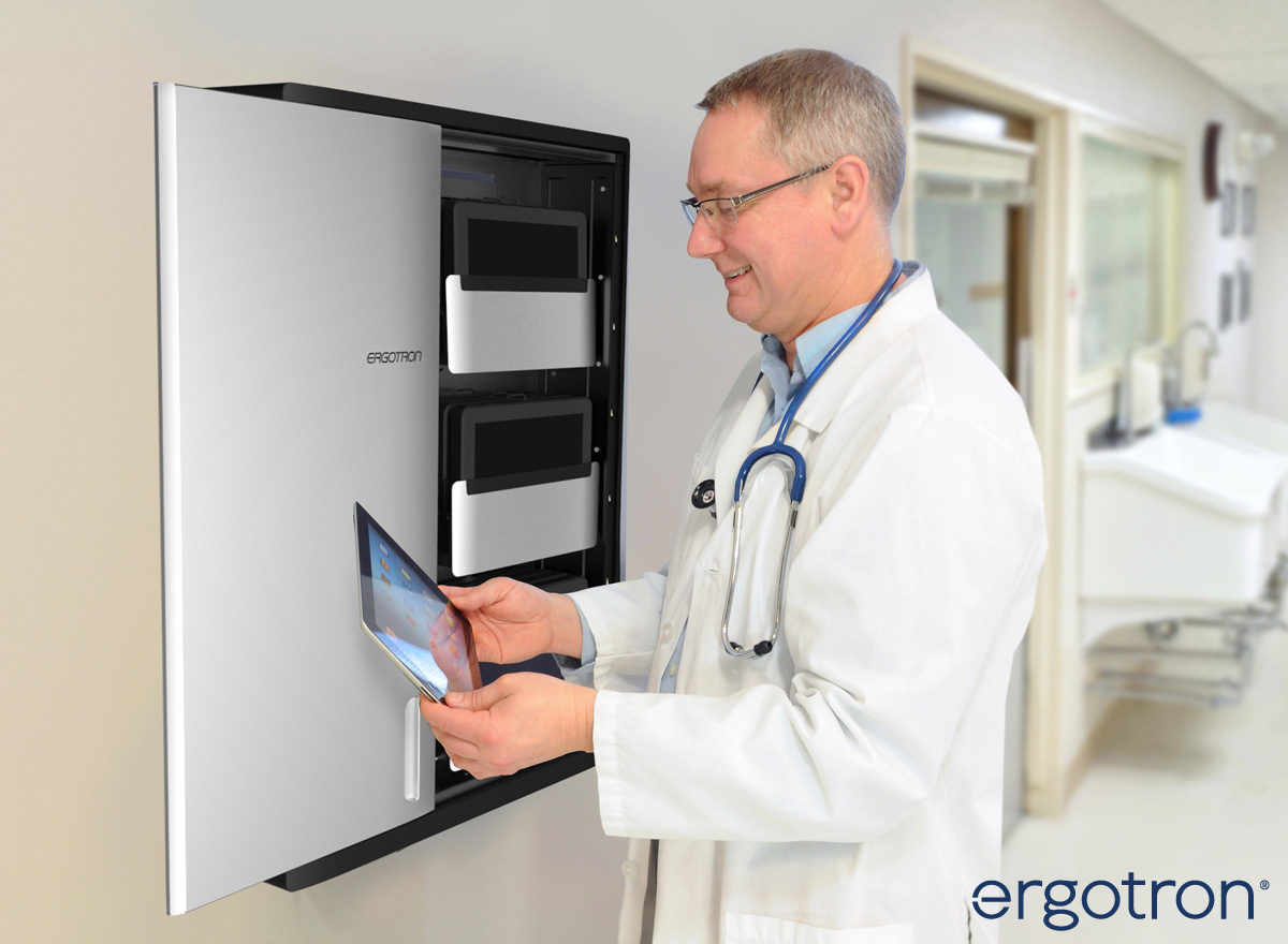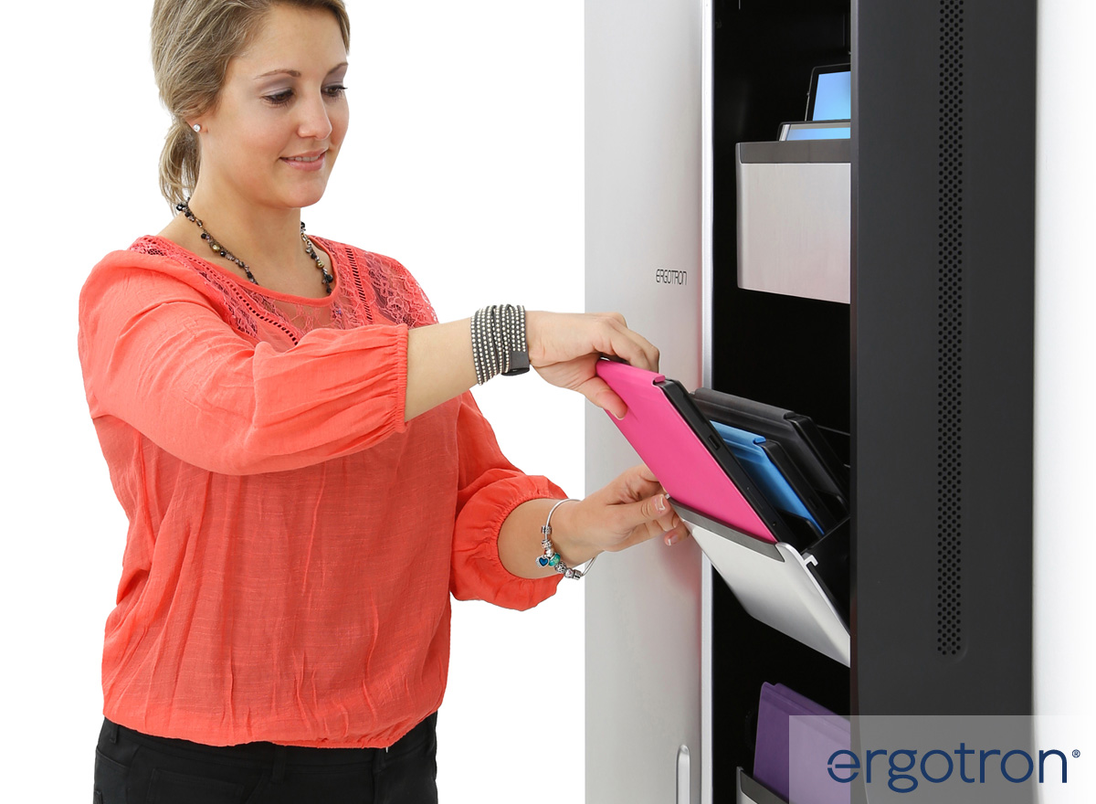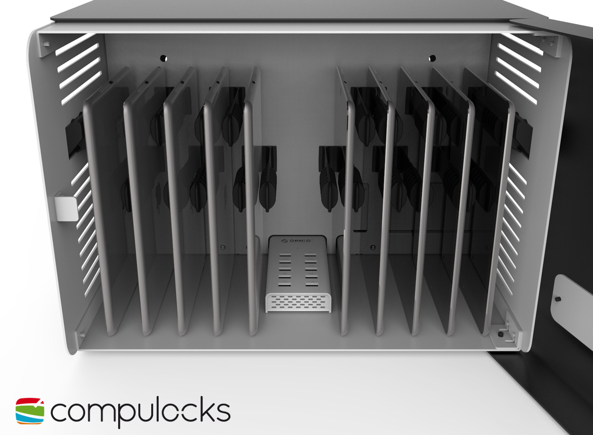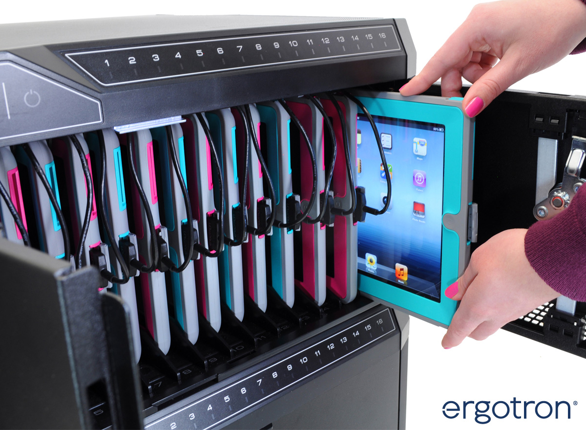 Die Bereitstellung der nötigen Infrastruktur für die sichere Aufbewahrung und das zentrale Aufladen der Geräte ist eine wichtige Voraussetzung für die Digitalisierung im Bildungswesen. Damit die Tablets und Notebooks diebstahlsicher und kompakt aufbewahrt werden können, kommen mobile Ladestationen oder Ladewandhalter zum Einsatz. Sie sind beispielsweise für Apple iPads, Samsung Galaxy Tabs, Chromebooks oder Microsoft Surface Tablets geeignet, lassen sich flexibel aufstellen und schützen die Geräte beim Aufladen vor Vandalismus und Diebstahl. Die Ladestationen von Compulocks und Ergotron bieten Platz für bis zu 48 Geräte gleichzeitig. Zudem sind die Gehäuse der Aufbewahrungsschränke so beschaffen, dass die Tablets / Laptops gut belüftet sind, um einen Wärmestau und somit das Überhitzen der angeschlossenen Geräte zu vermeiden. Die Geräte liegen in einzelnen Fächer und sind leicht zu entnehmen. Die Trolley Tabletschränke zeichnen sich durch eine einfache Bedienung und hohe Mobilität aus. Mit den Compulocks oder Ergotron Tabletwagen können ganze Tablet- / Notebook Sätze sowohl im Bildungssektor als auch in Kliniken oder Krankenhäusern fachgerecht zentral aufbewahrt und transportiert werden.
